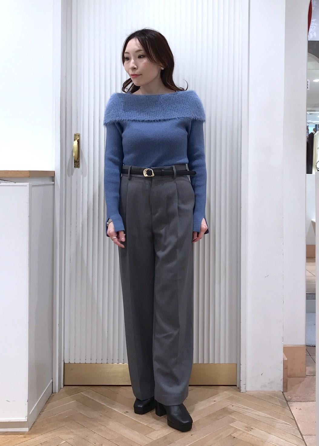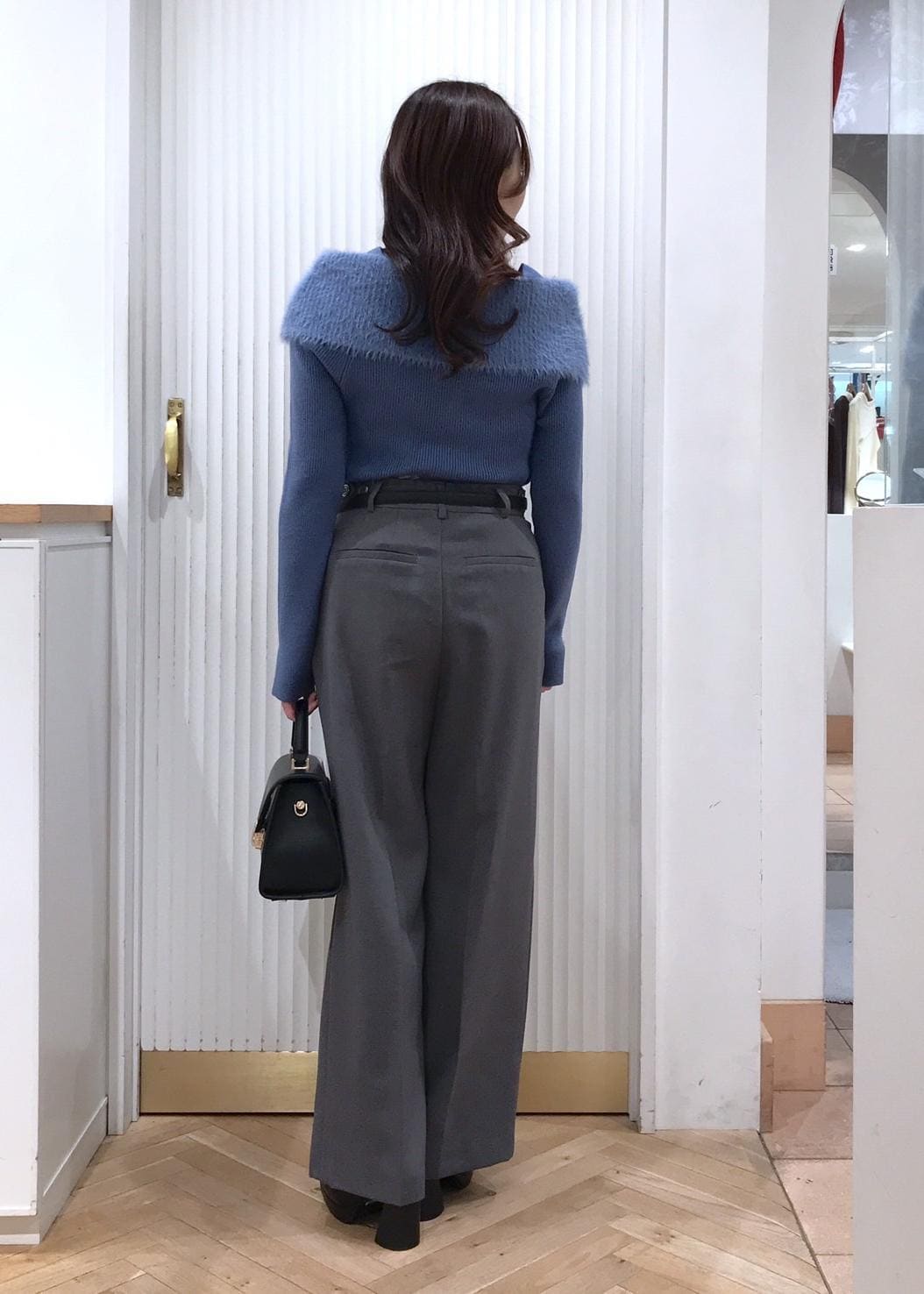 ベーシックなワイドパンツを季節感のあるフェザーヤーンニットに合わせて、きれいめコーデを鮮度よく。