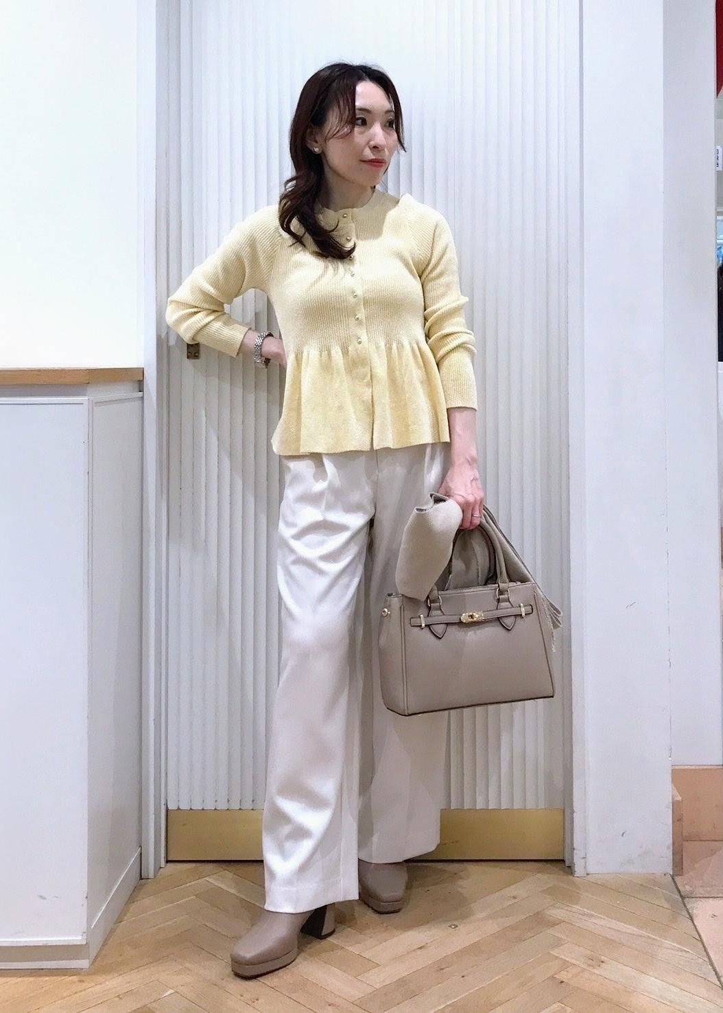 イエローのカーデをメインに、白やベージュを合わせて優しい配色に。