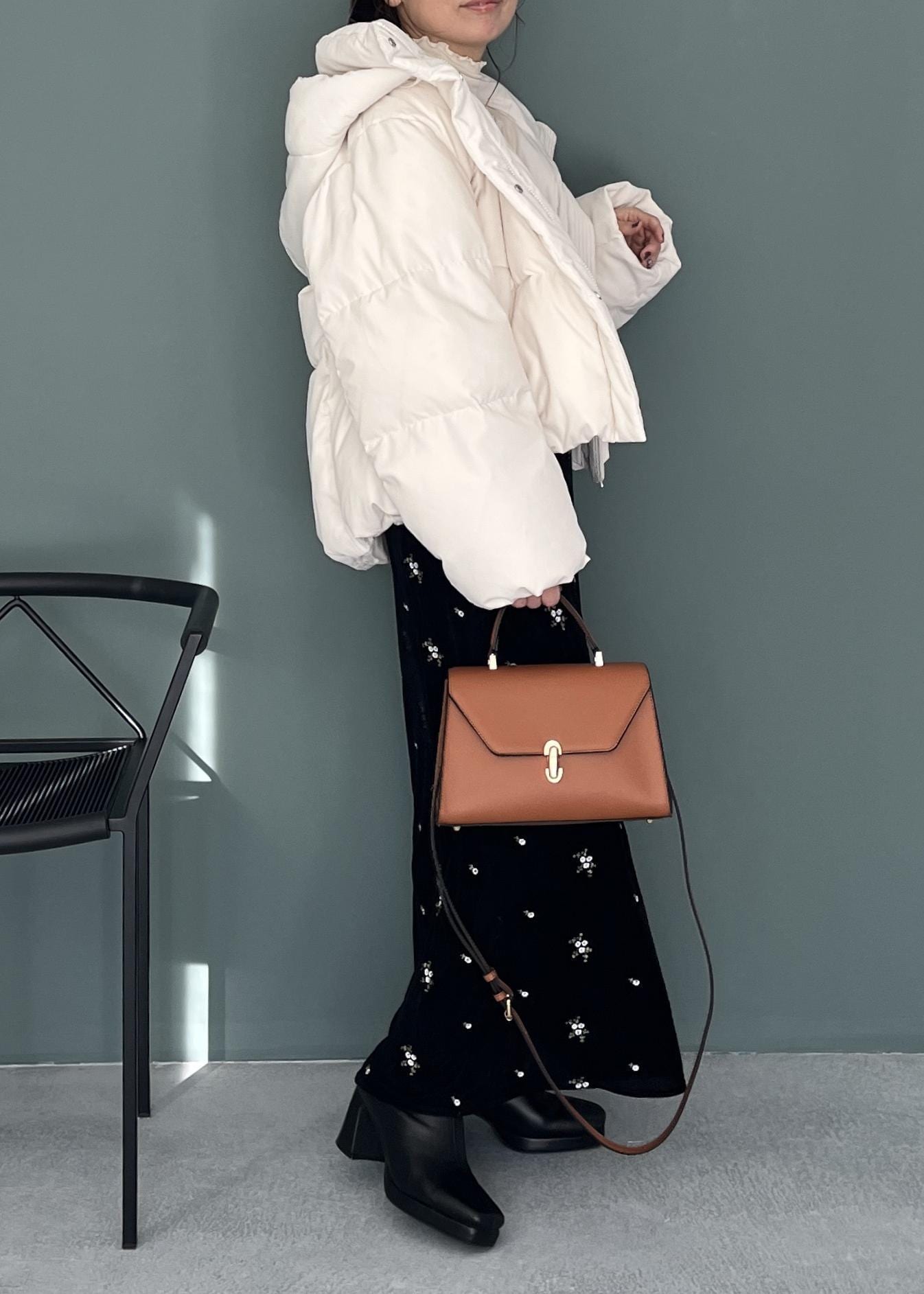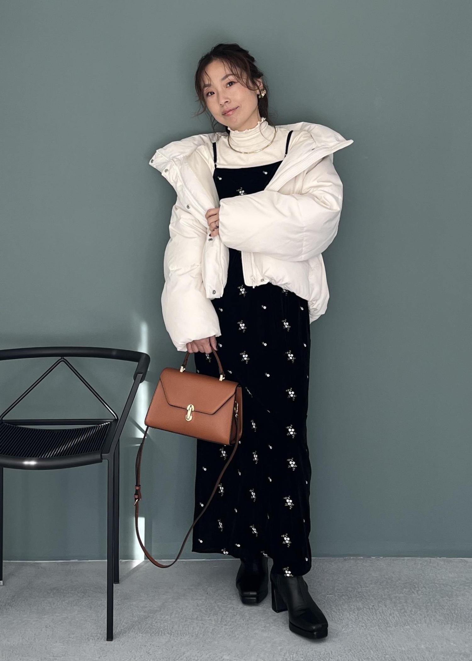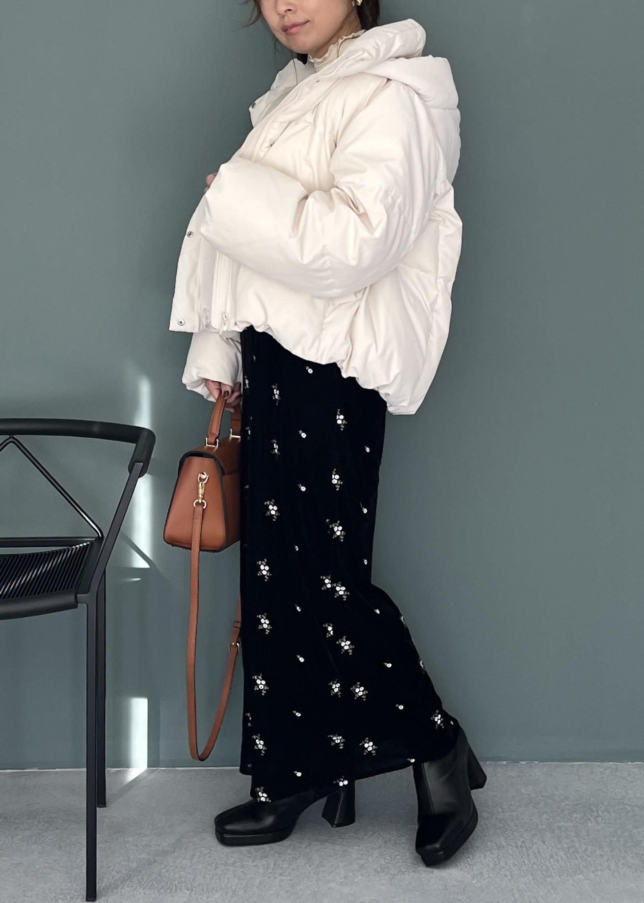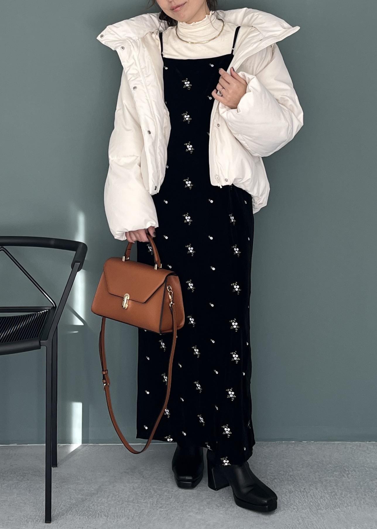 冬映えベロアワンピ×白ダウンで華やかブラックコーデ