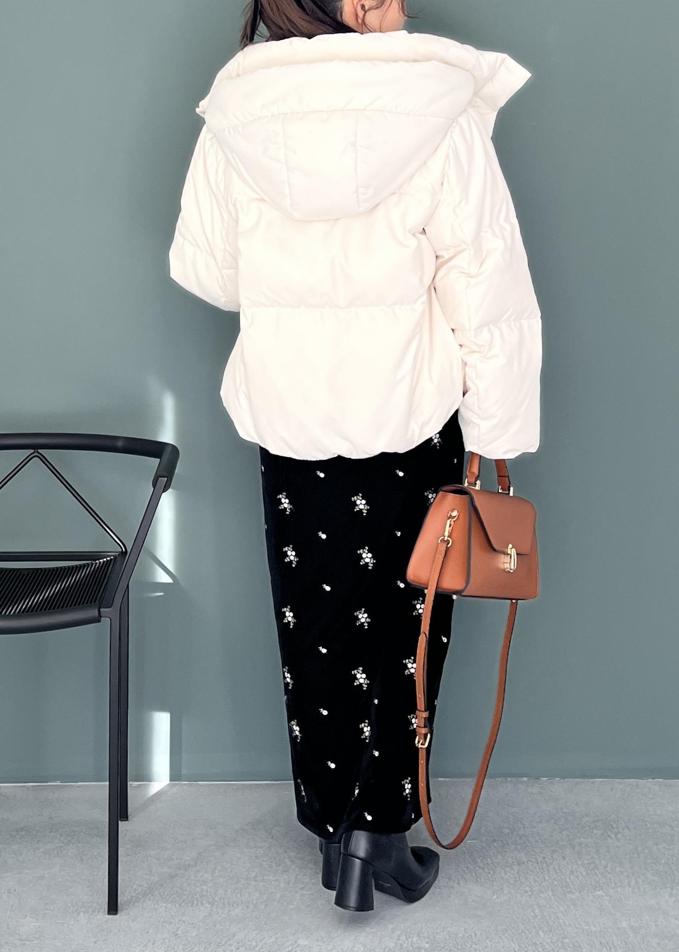 仕上げは軽くてあたたかい白ダウンで明るさを ON。