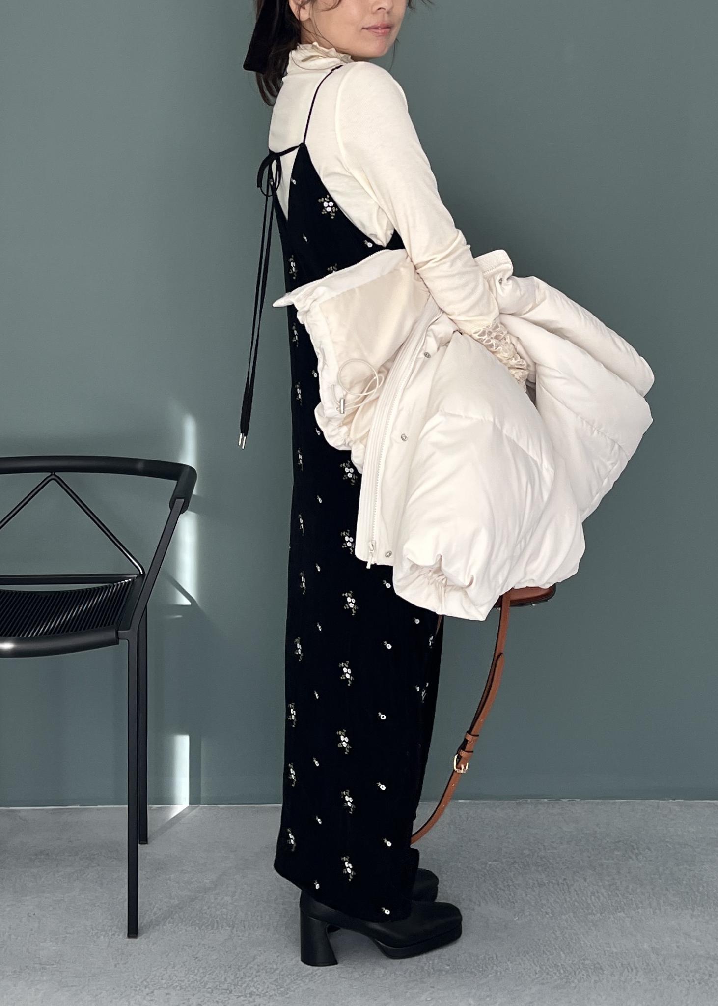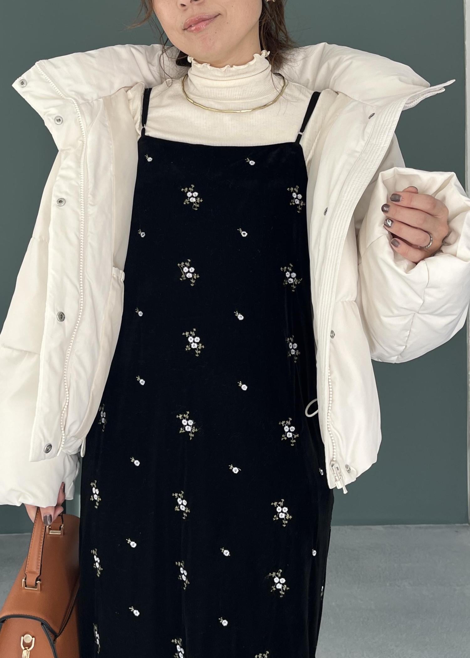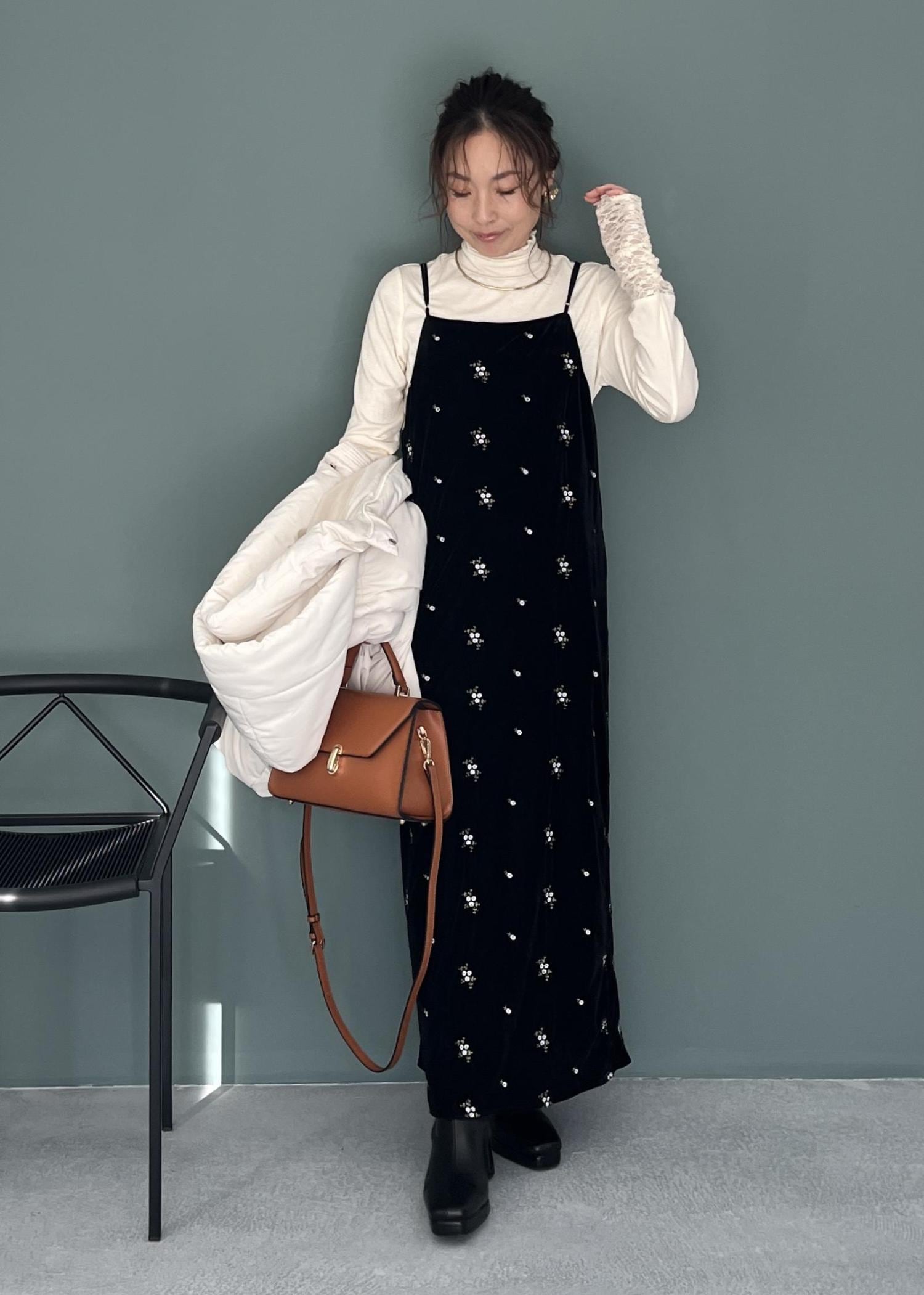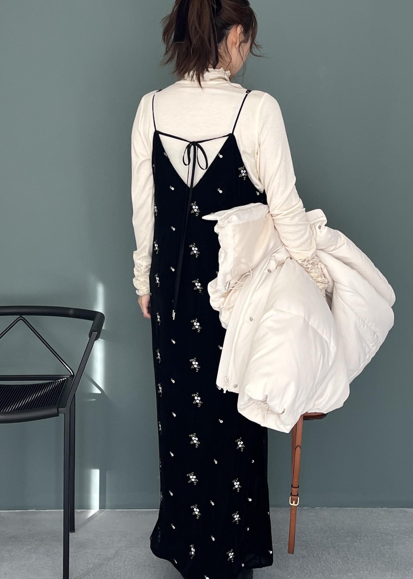 花柄刺繍が上品に映える“ベロアキャミワンピ”を主役に、