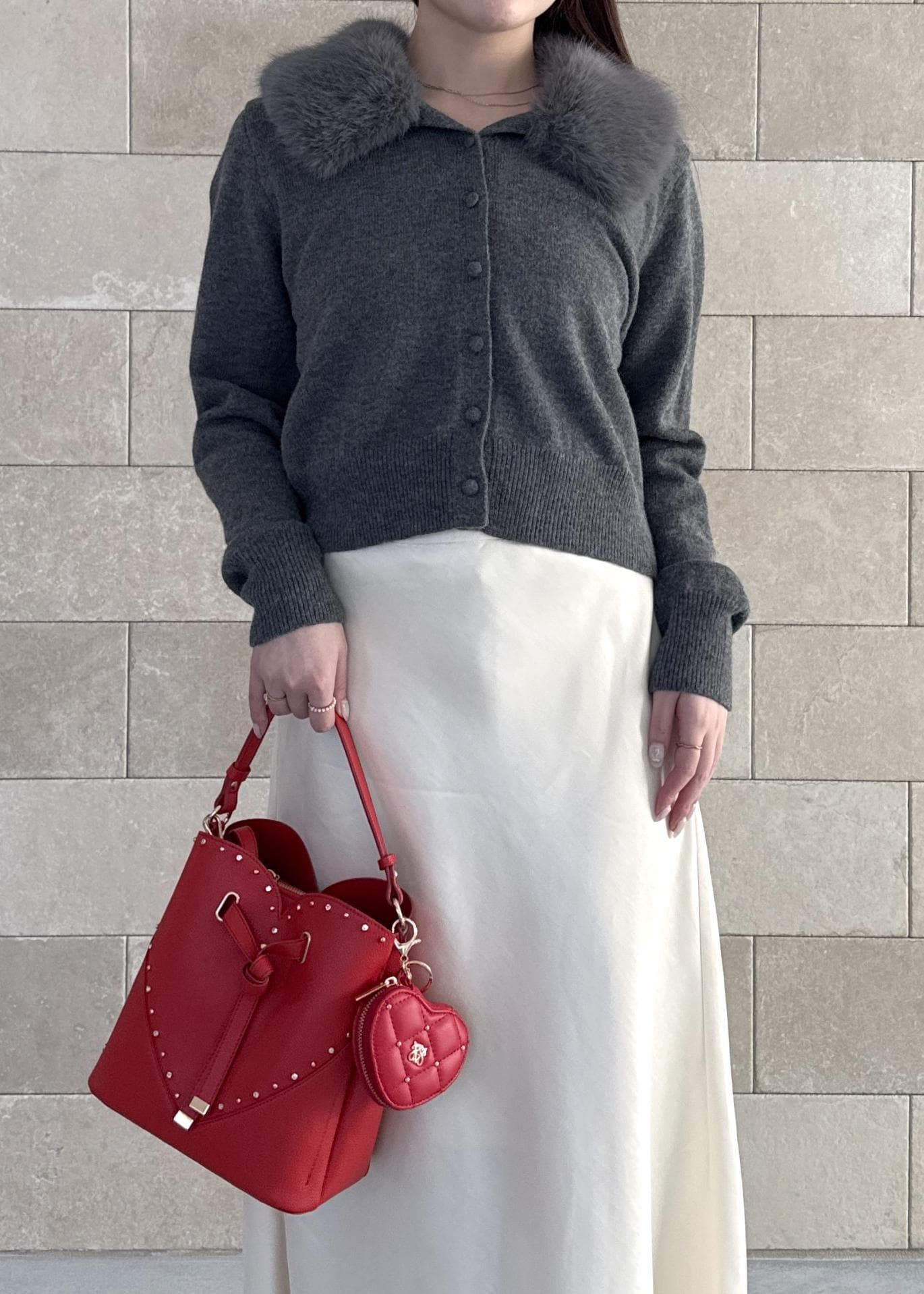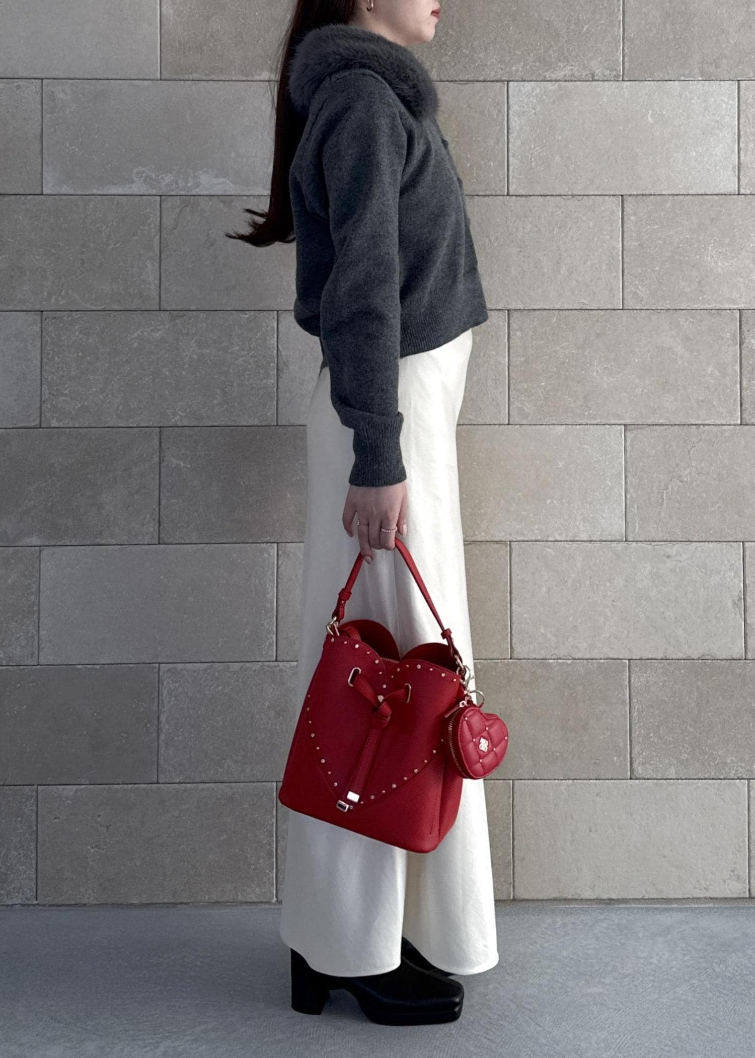 ダークカラーでまとめつつ、ハートバッグでラメ感とポイントの赤で華やかさをプラスして大人フェミニンコーデに♡