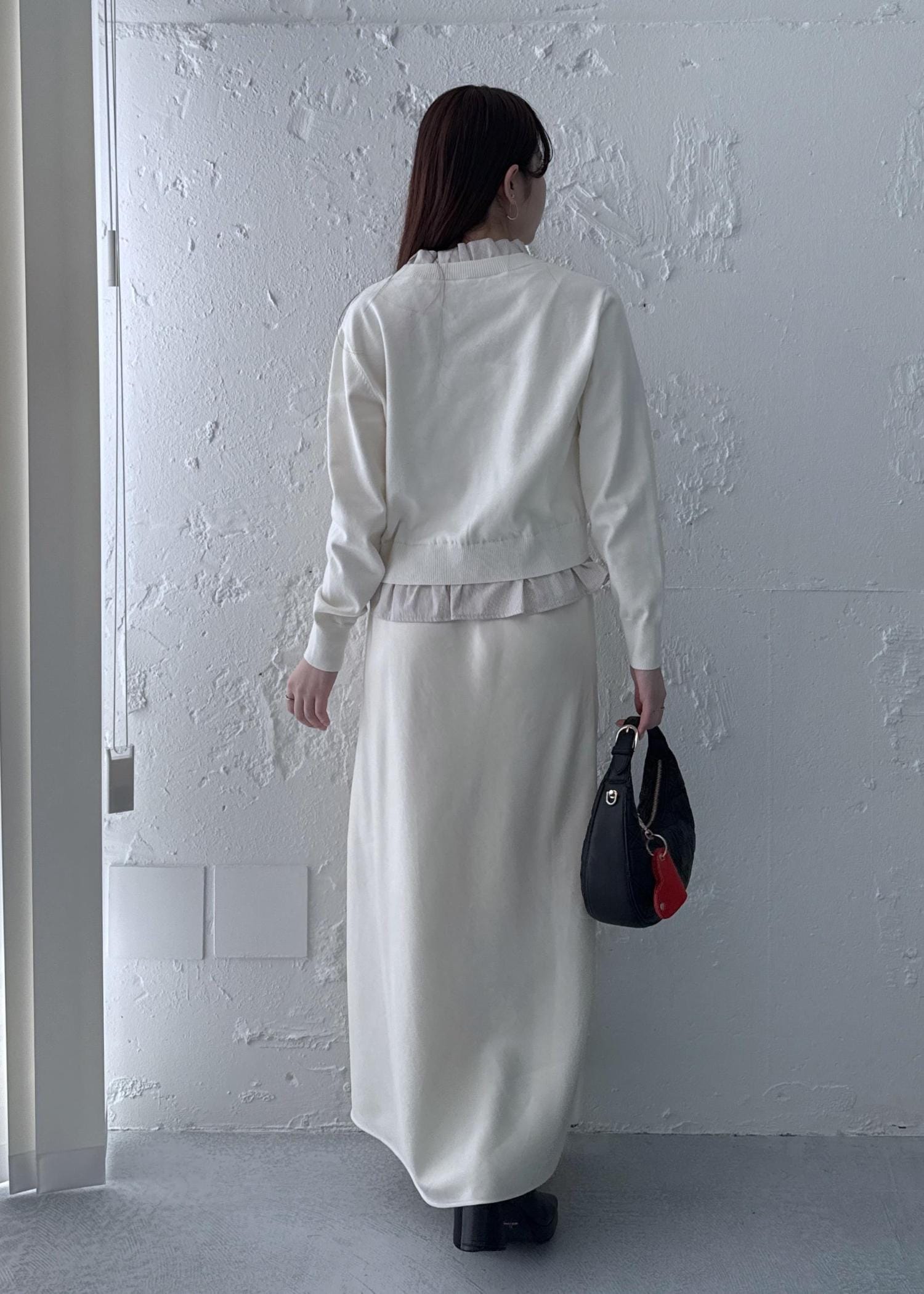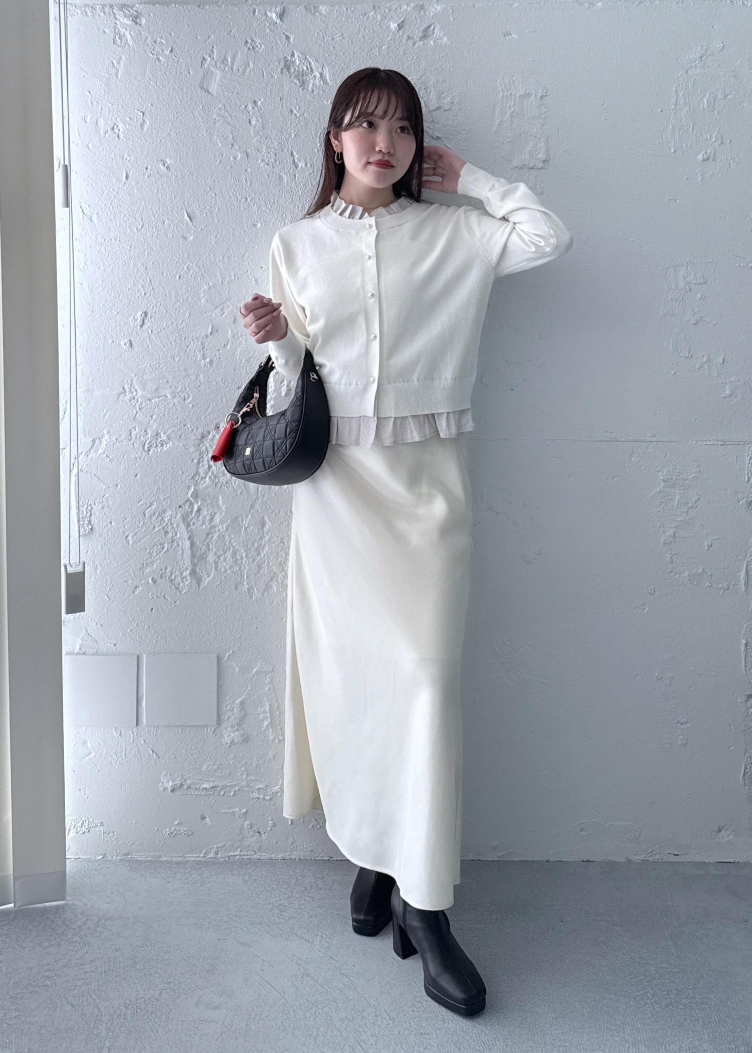 フリル襟がポイントのカーディガンに、女性らしくスカートをプラスして華やかで女性らしい印象に!