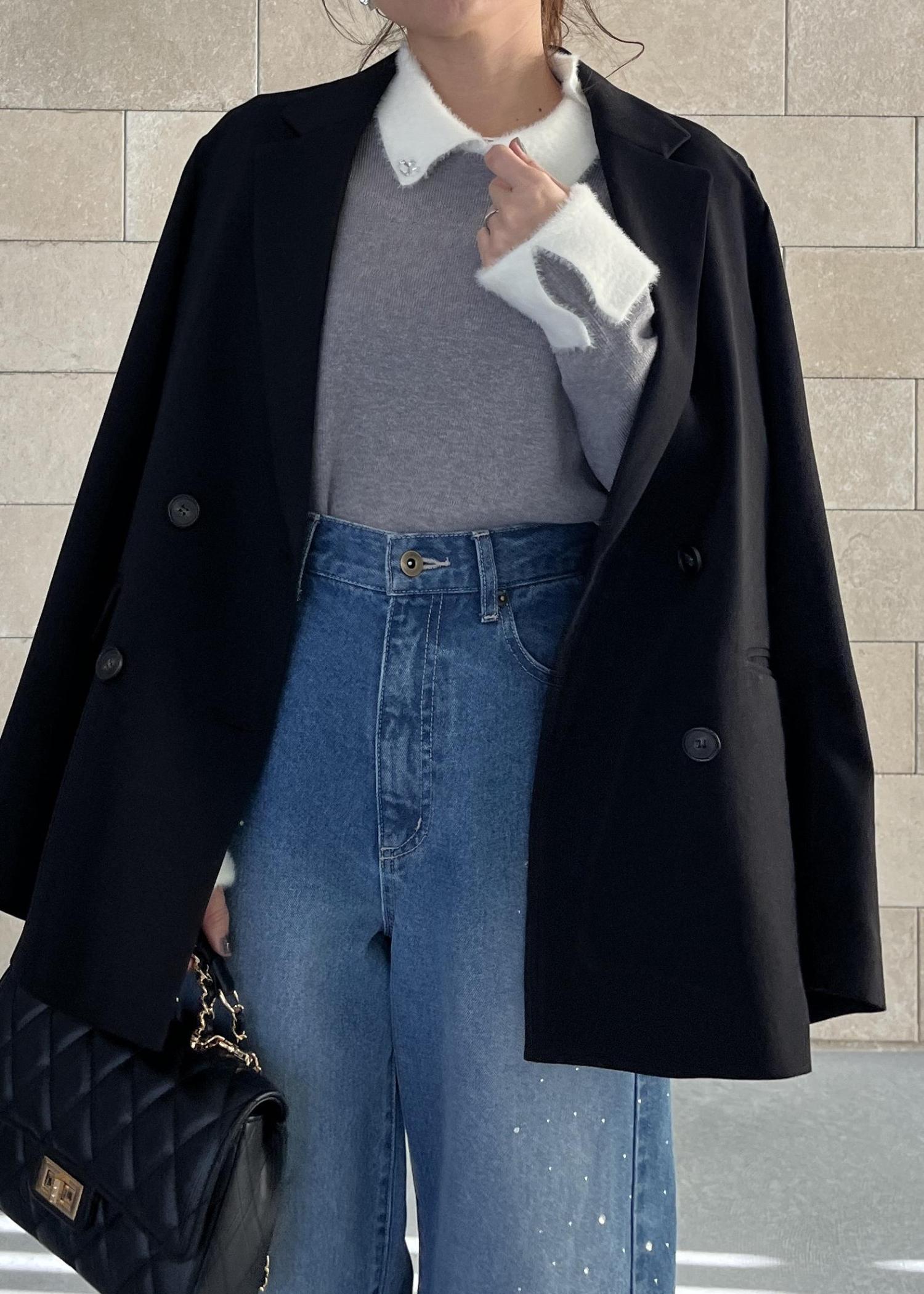 襟と袖のふわふわポイントが大人かわいいニットに、きれいめジャケットを肩がけ。
