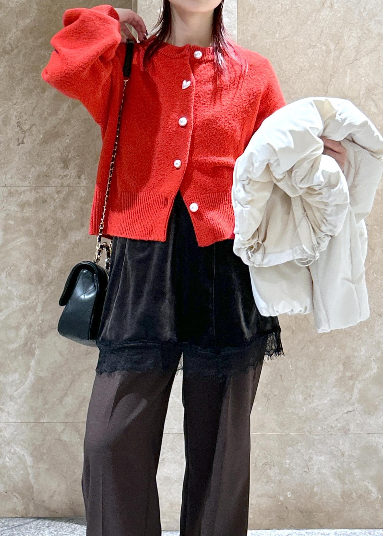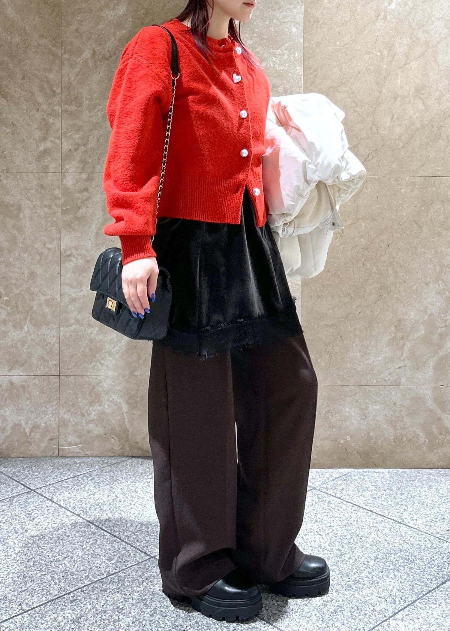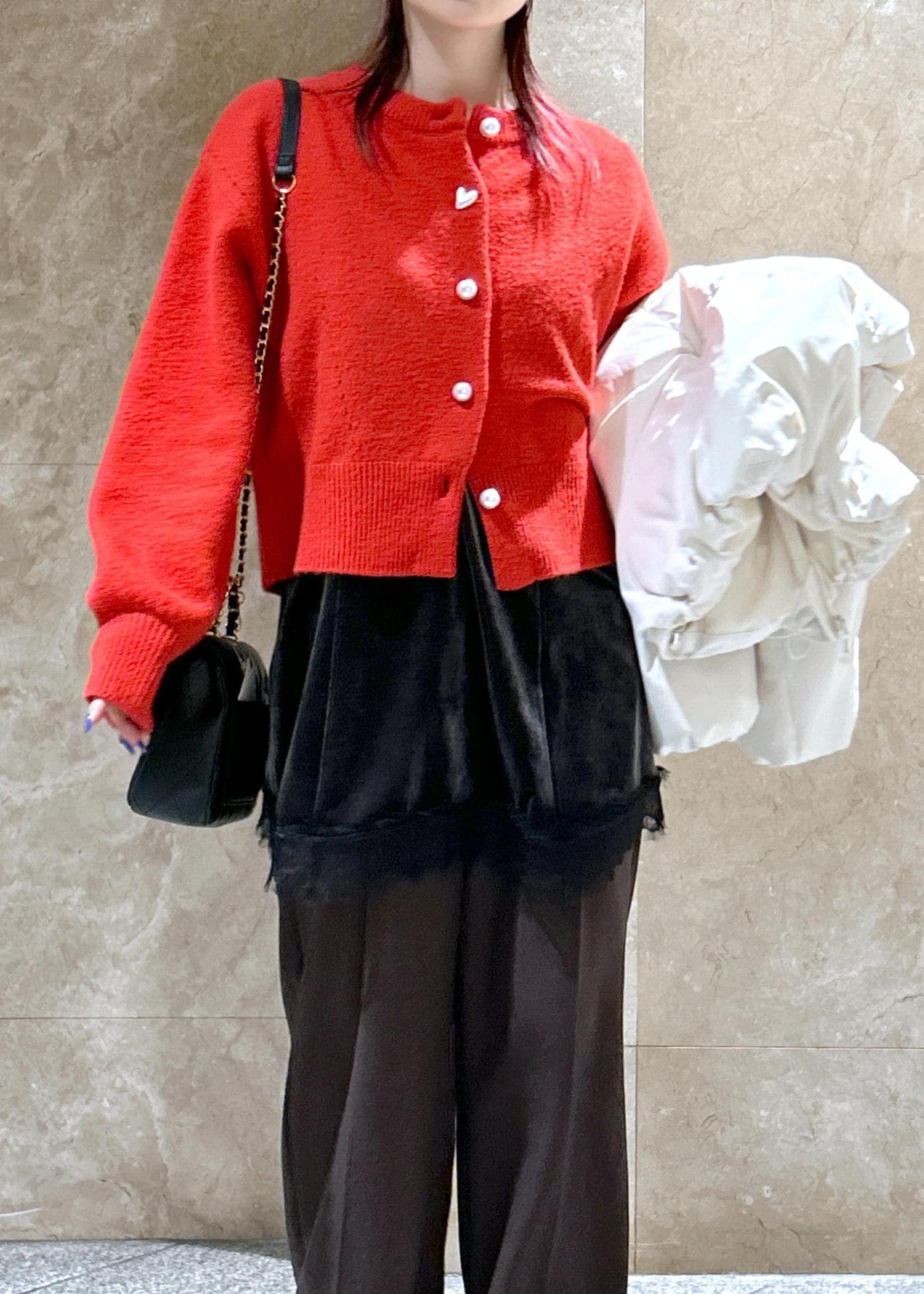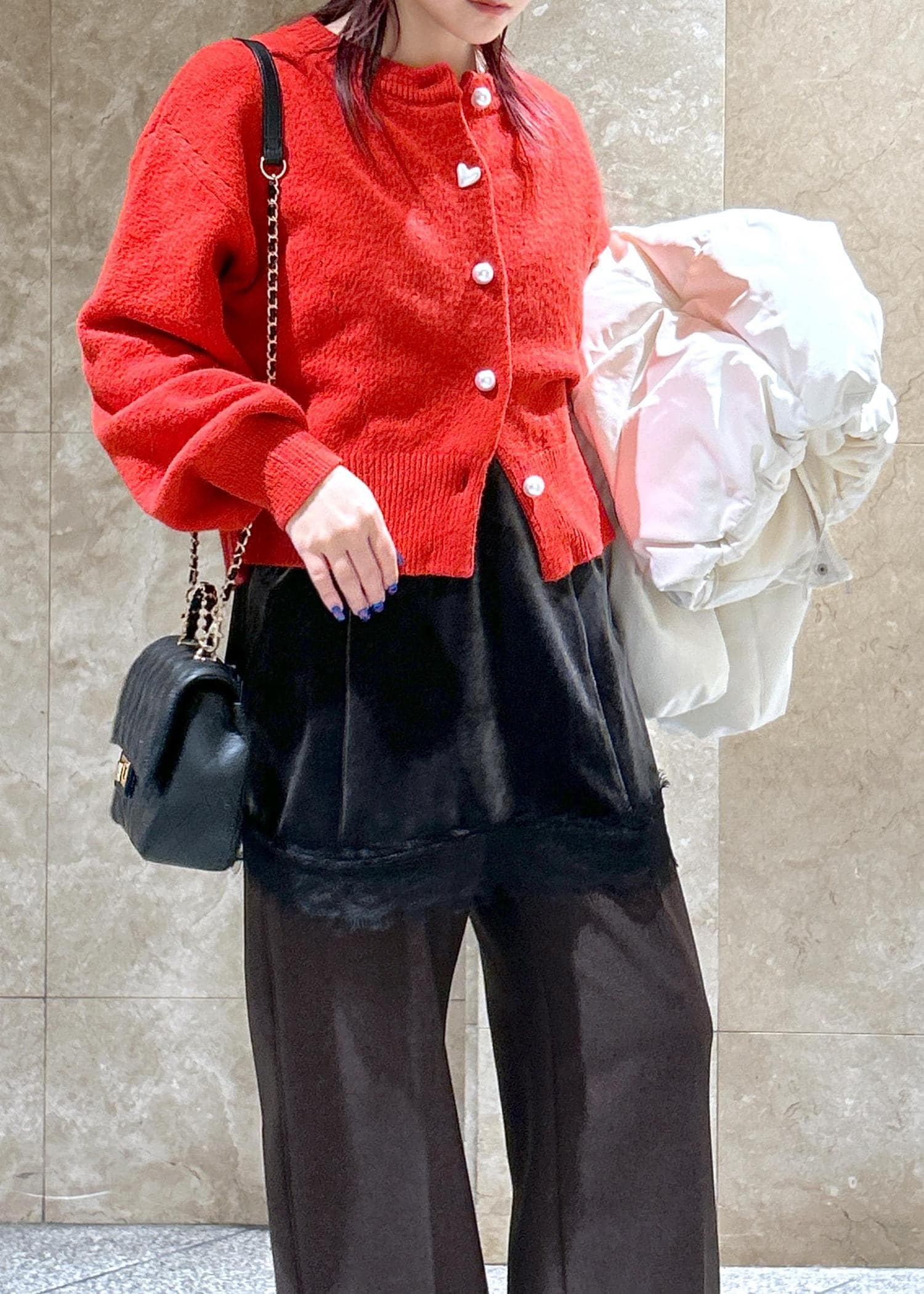 VISハートアソートパール釦ラメミックスカーディガン/イージーケア・一部WEB限定カラーレッド / F¥5,489レビュー第二ボタンがハートになっているカーディガンです!