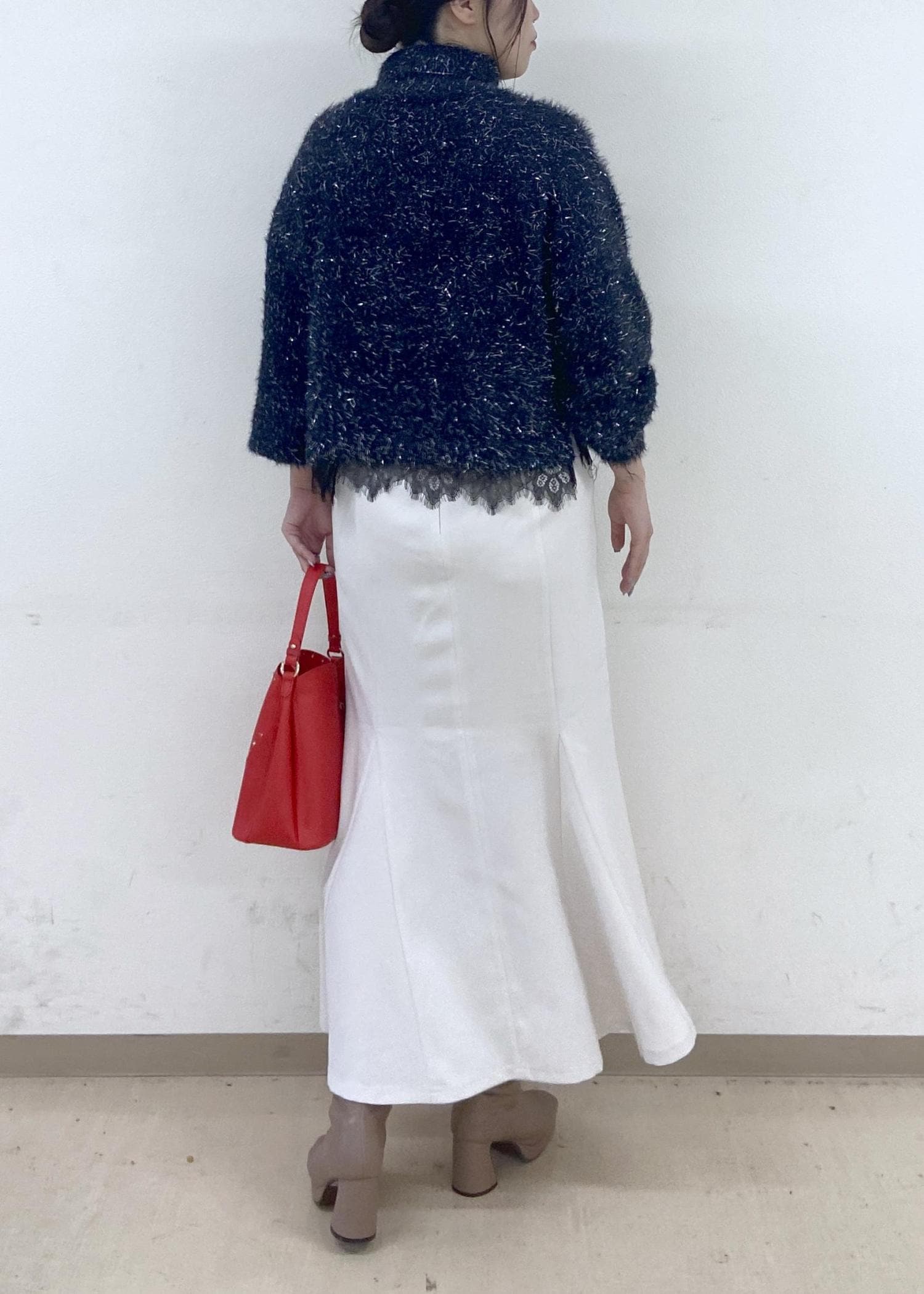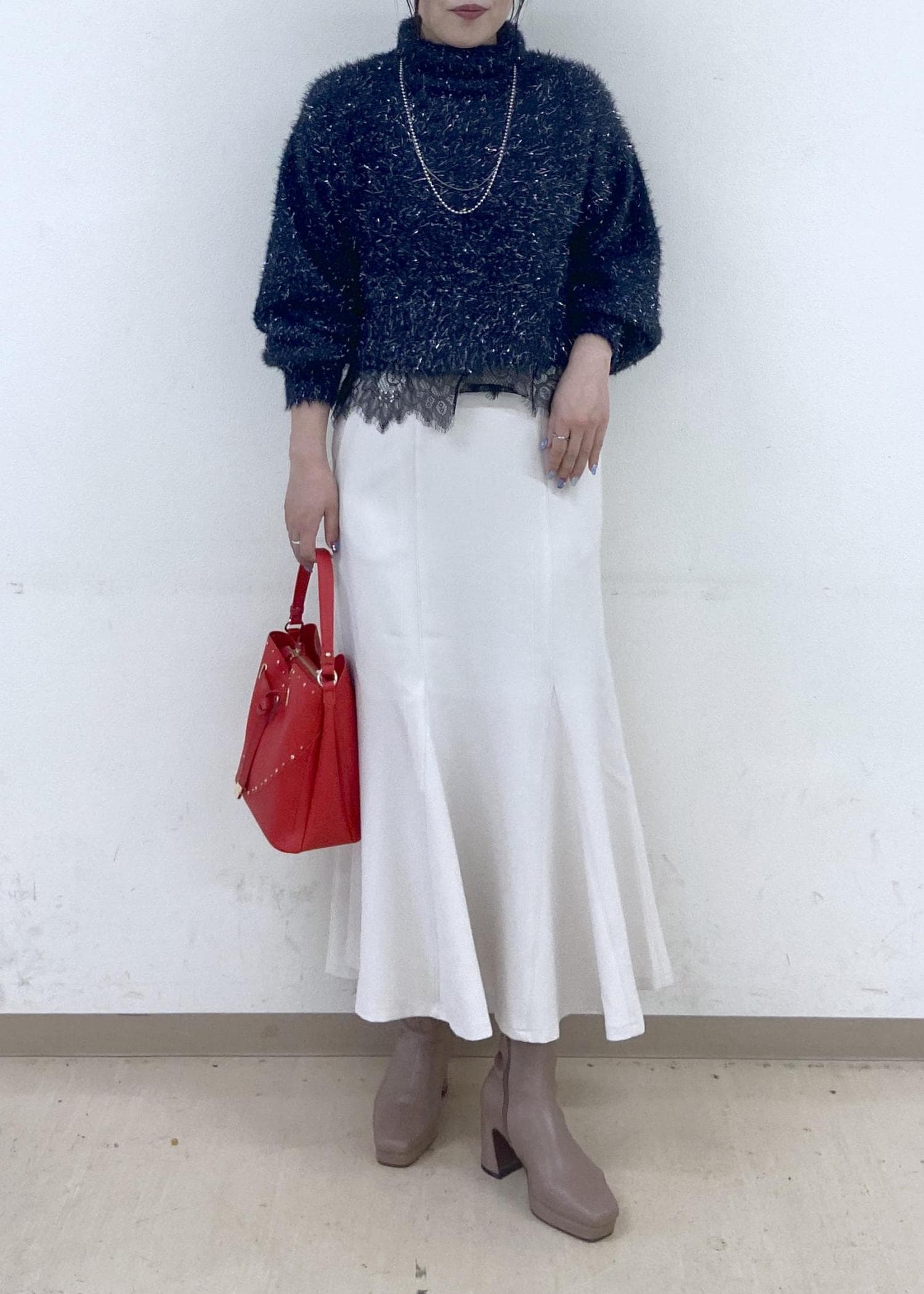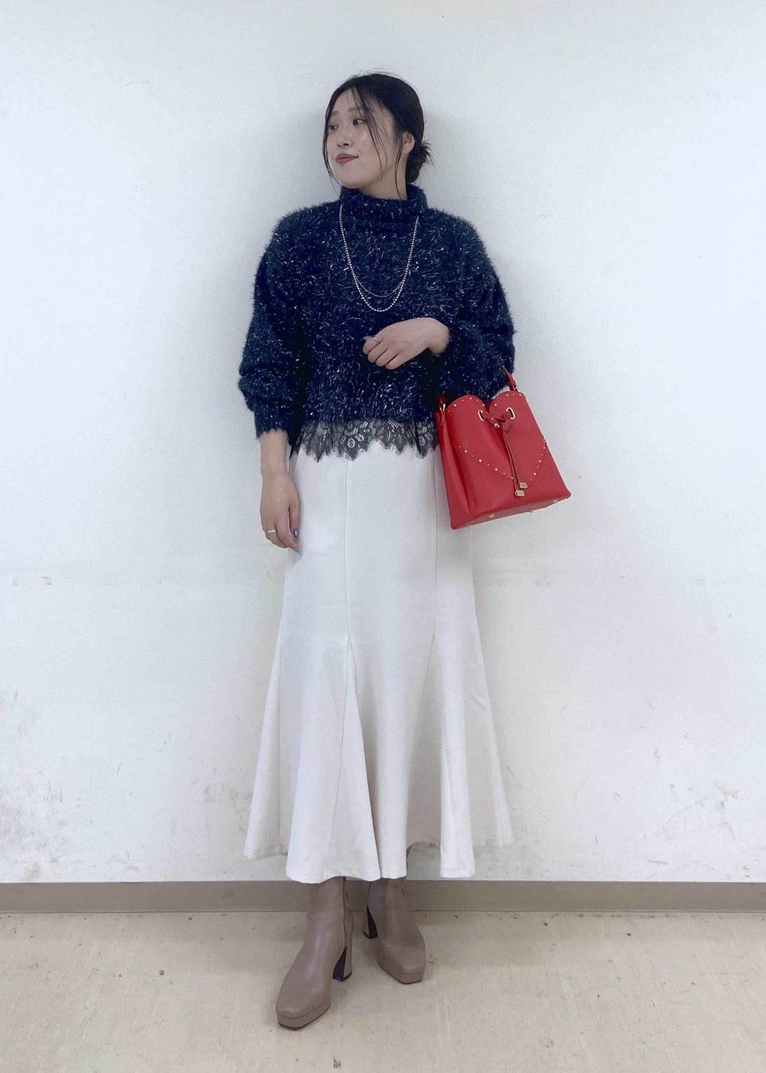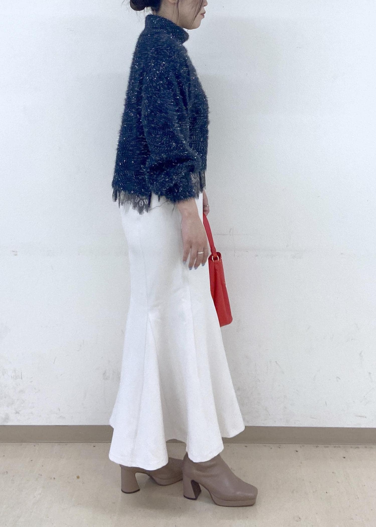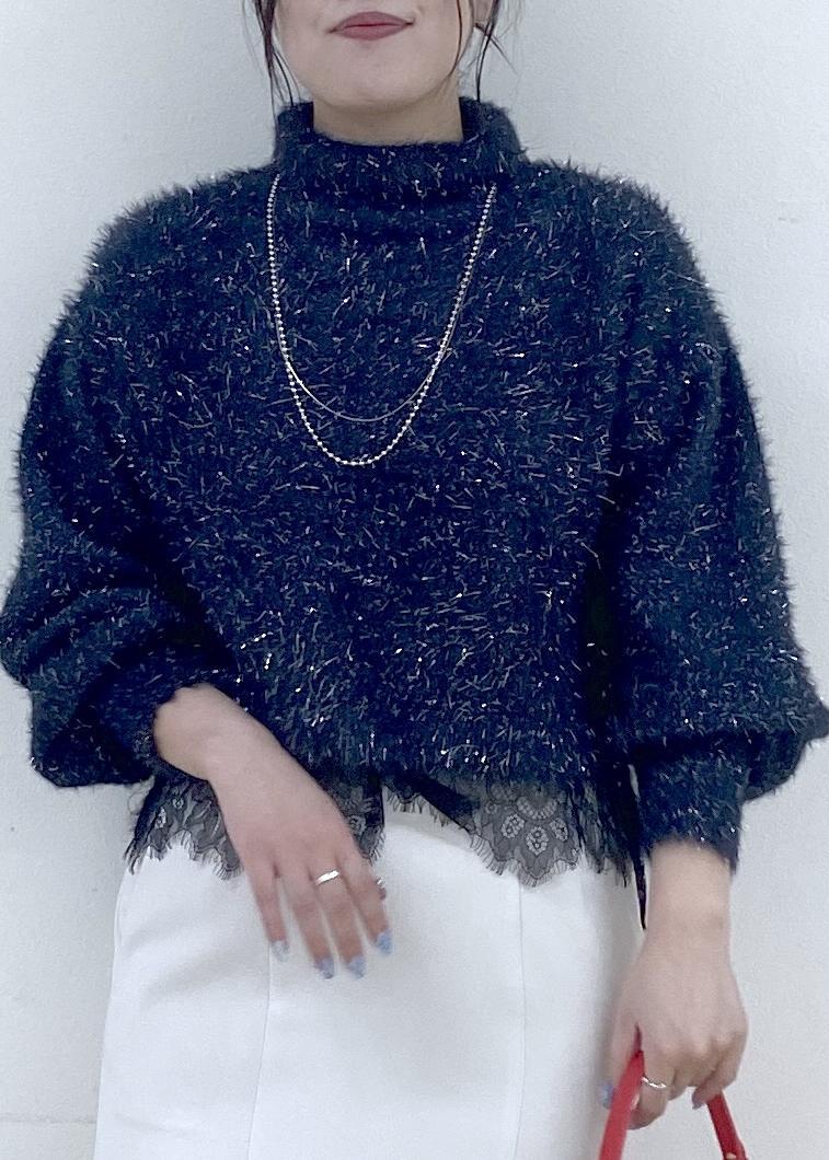 VISラメフェザー裾レースハイネックニットネイビー / F¥6,589レビューラメ入りですが、チクチクしにくい素材です。