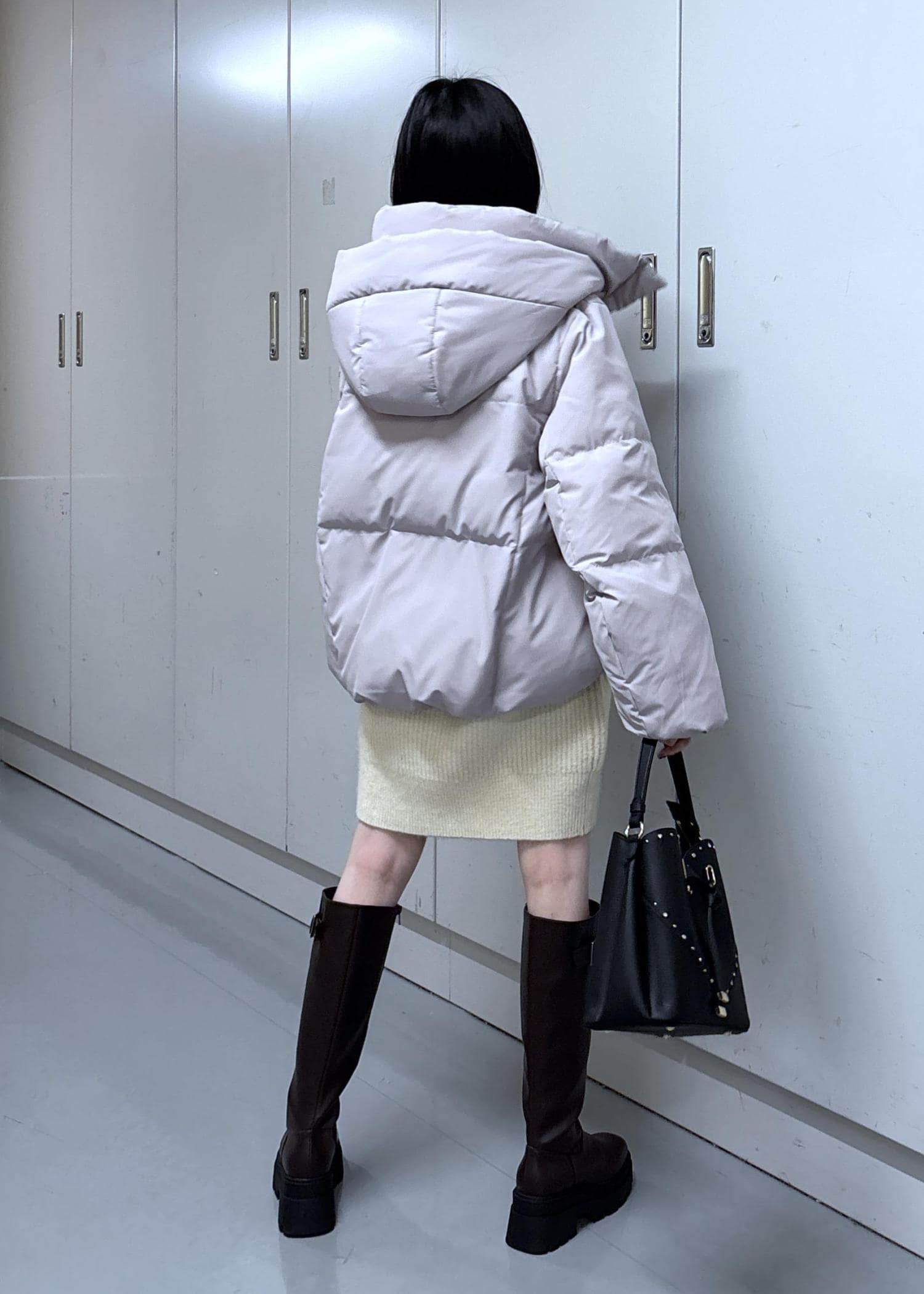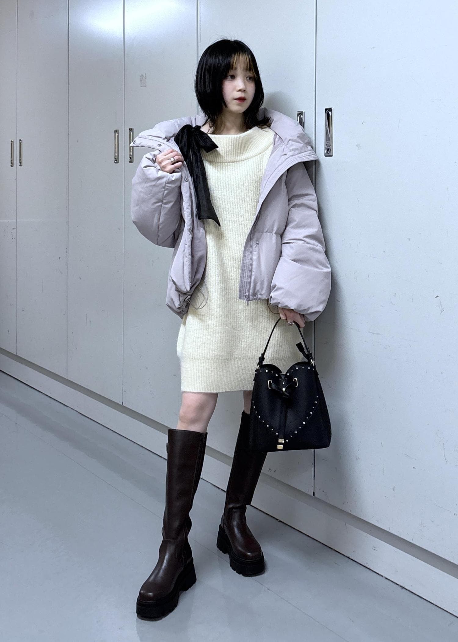 普段選ばない白ワンピ×ピンクダウンの併せで、クリスマスムードを演出してみました☺︎