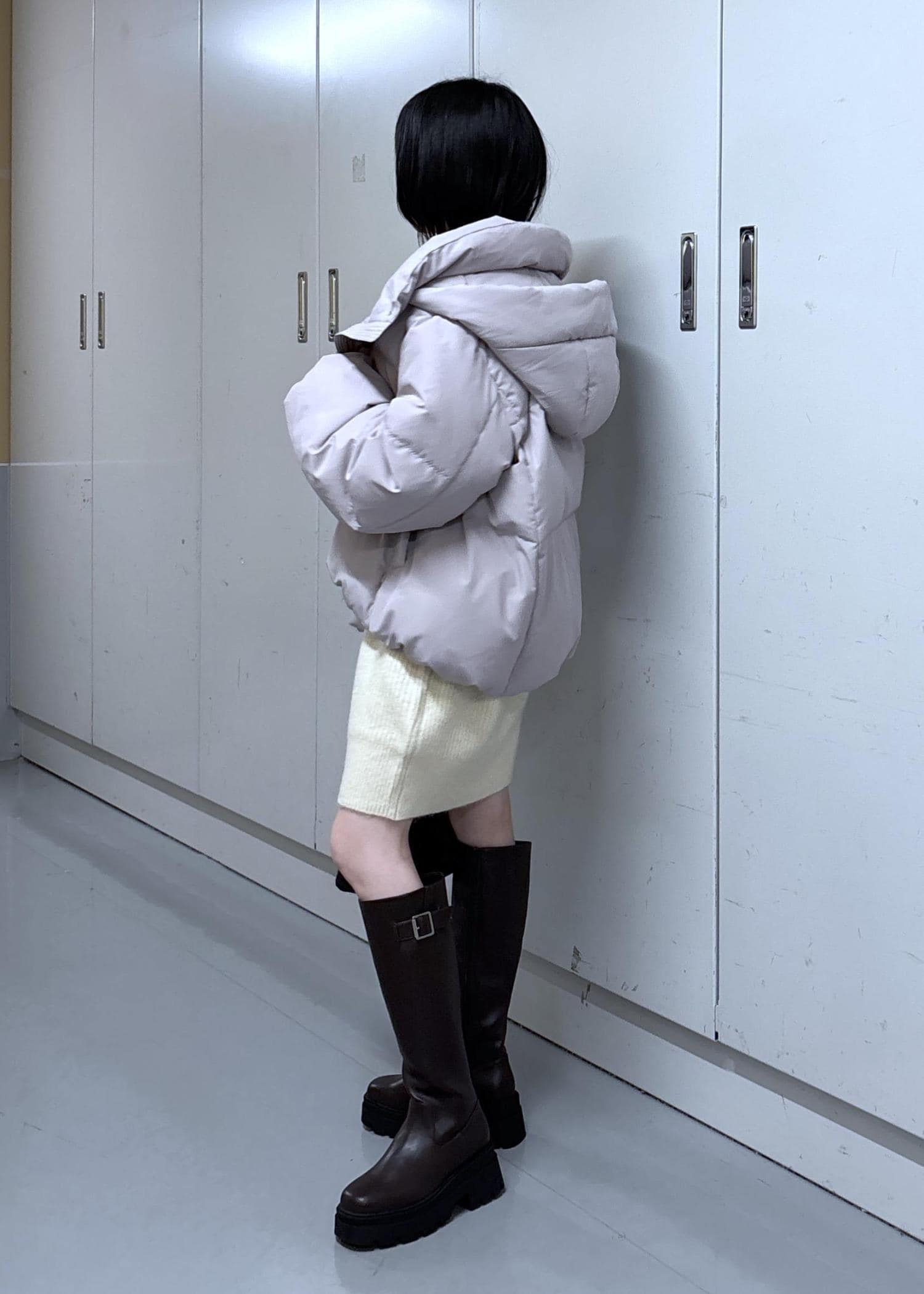 丈感はちょうど膝真ん中くらい。ロングブーツを合わせても程よく肌が見える丈感でした。
