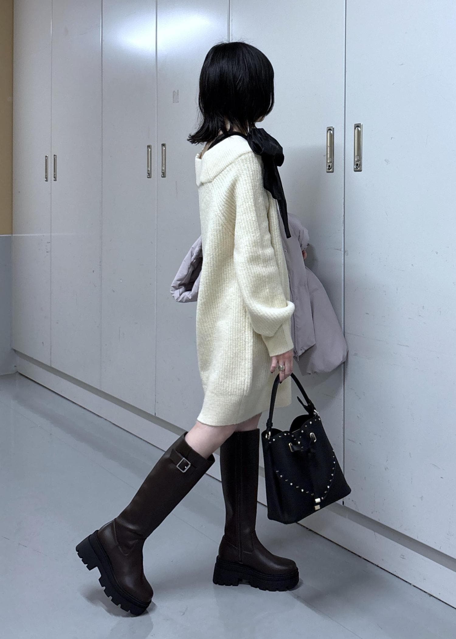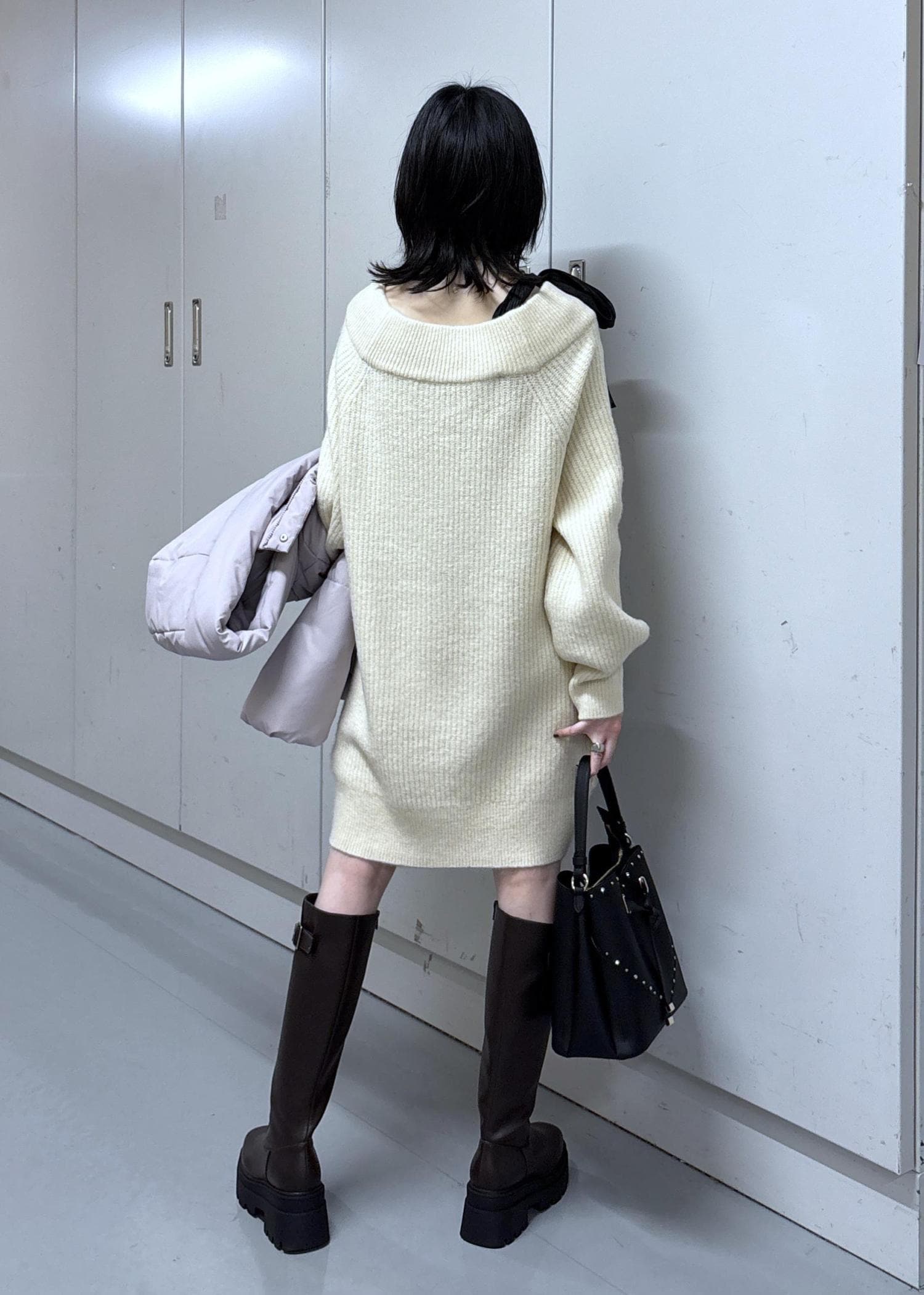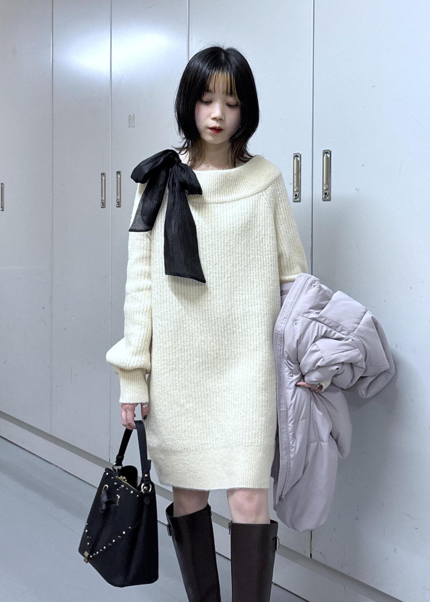 肩のリボンが目を引くニットワンピは、ミニ丈なのでロングブーツと合わせると甘めな印象♫