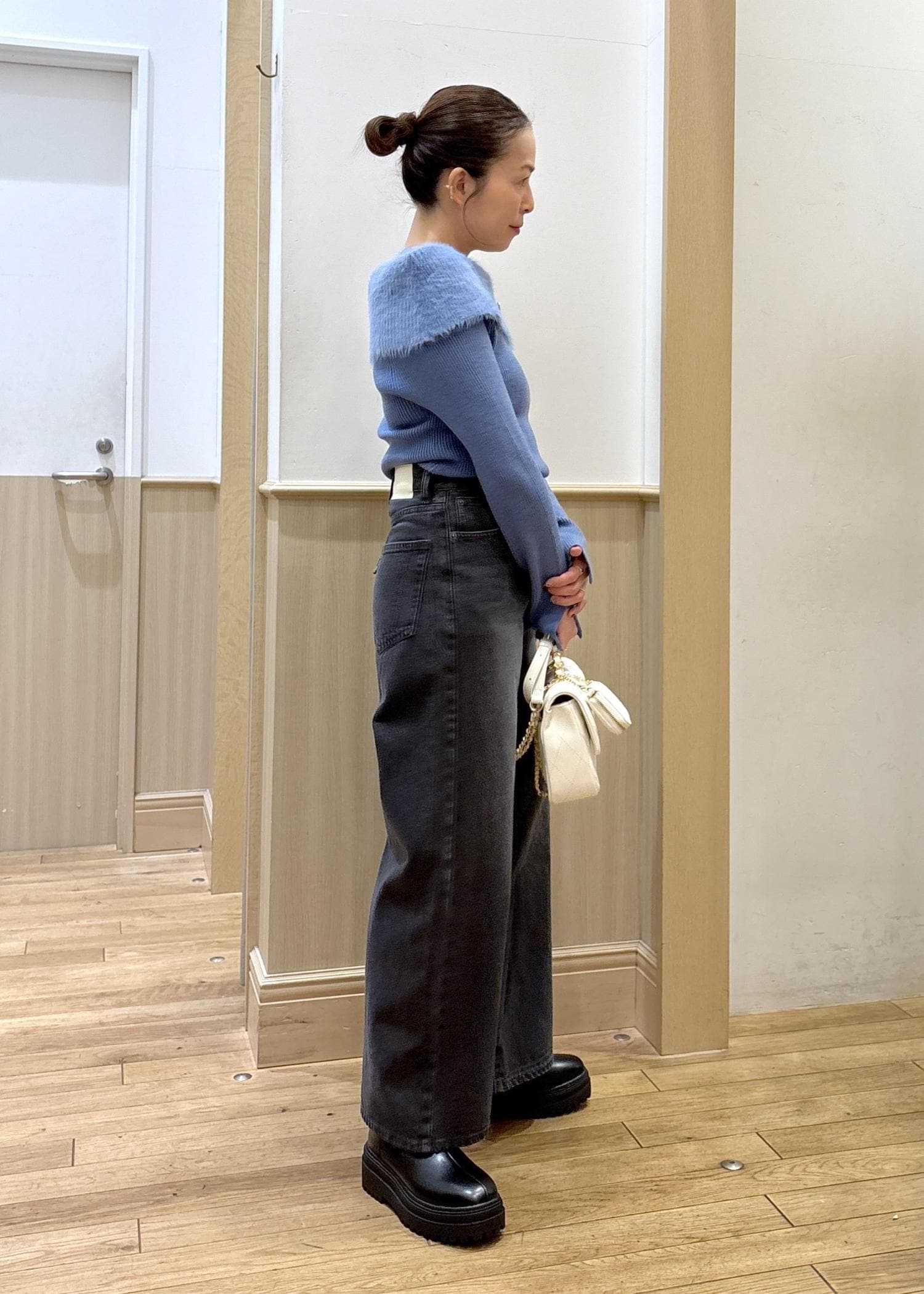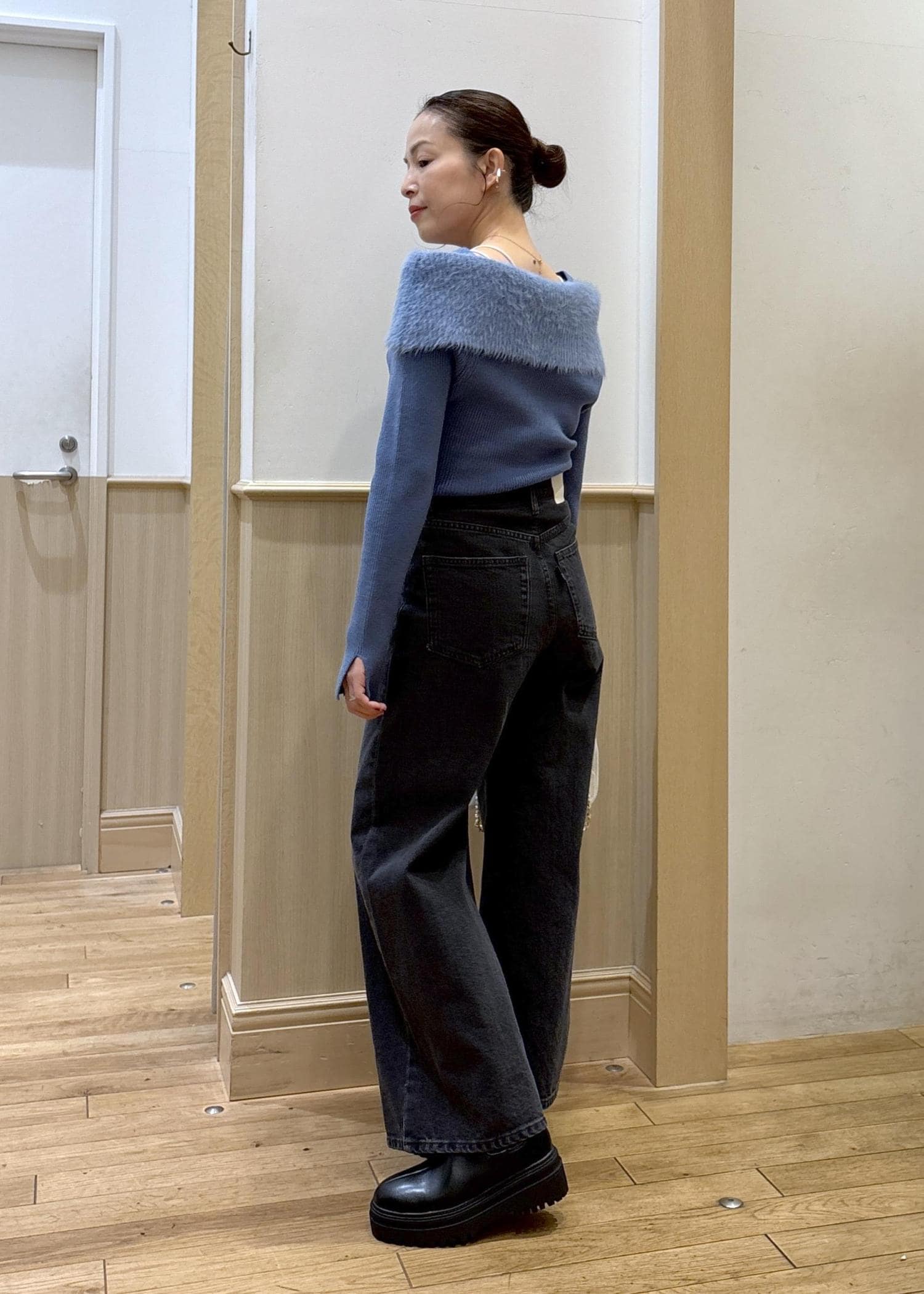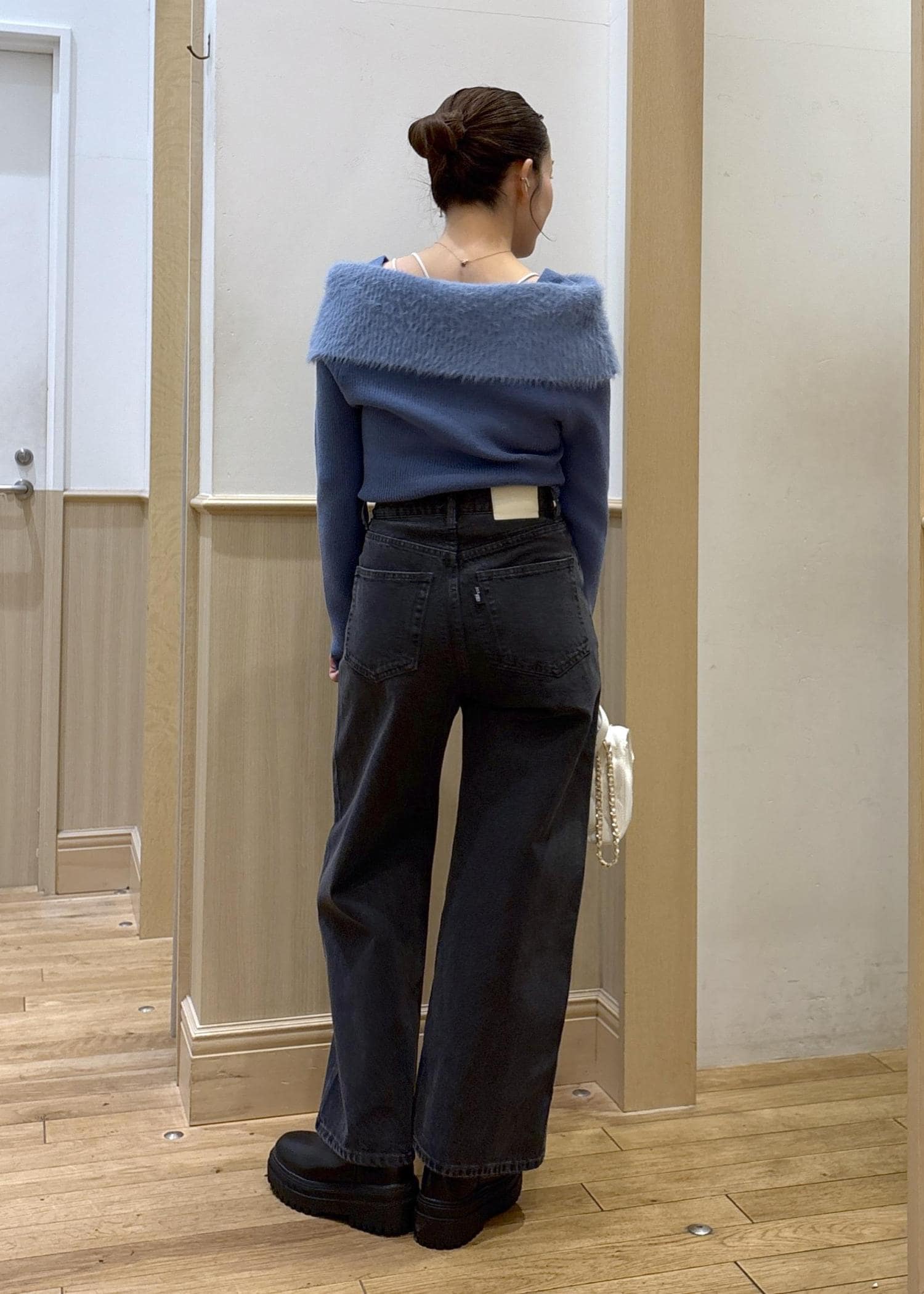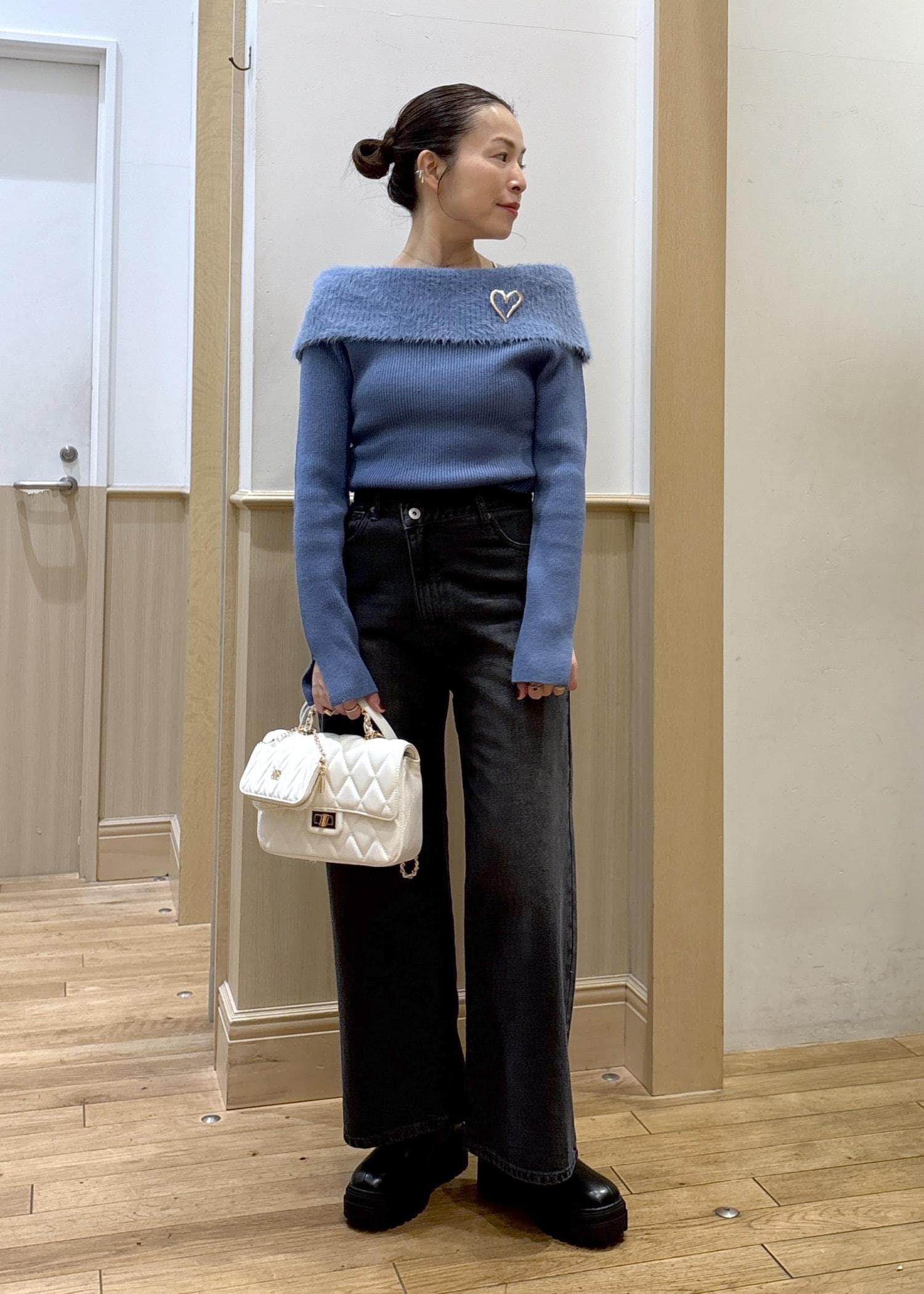 甘めなオフショルニットなのでデニム合わせてカジュアルなスタイリングにしてます。