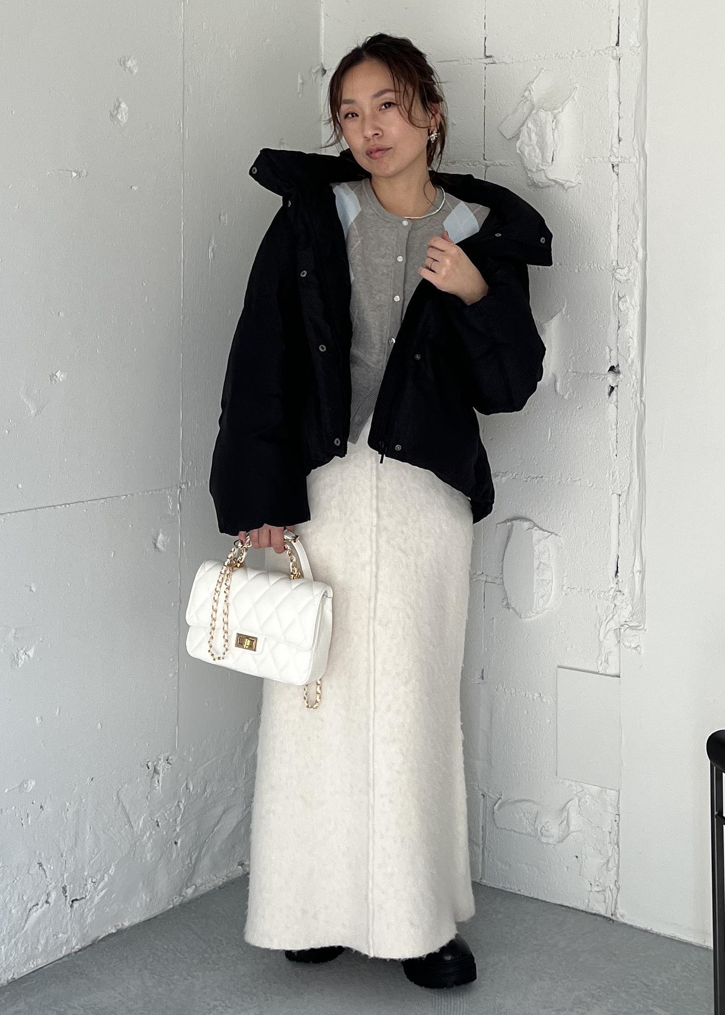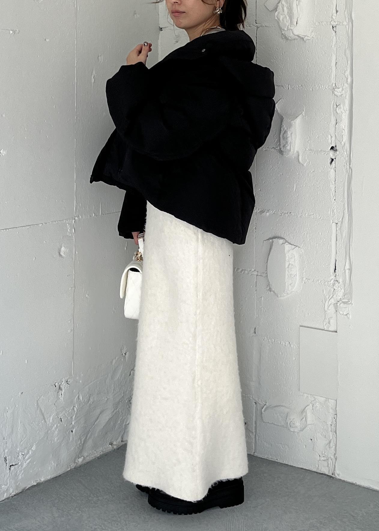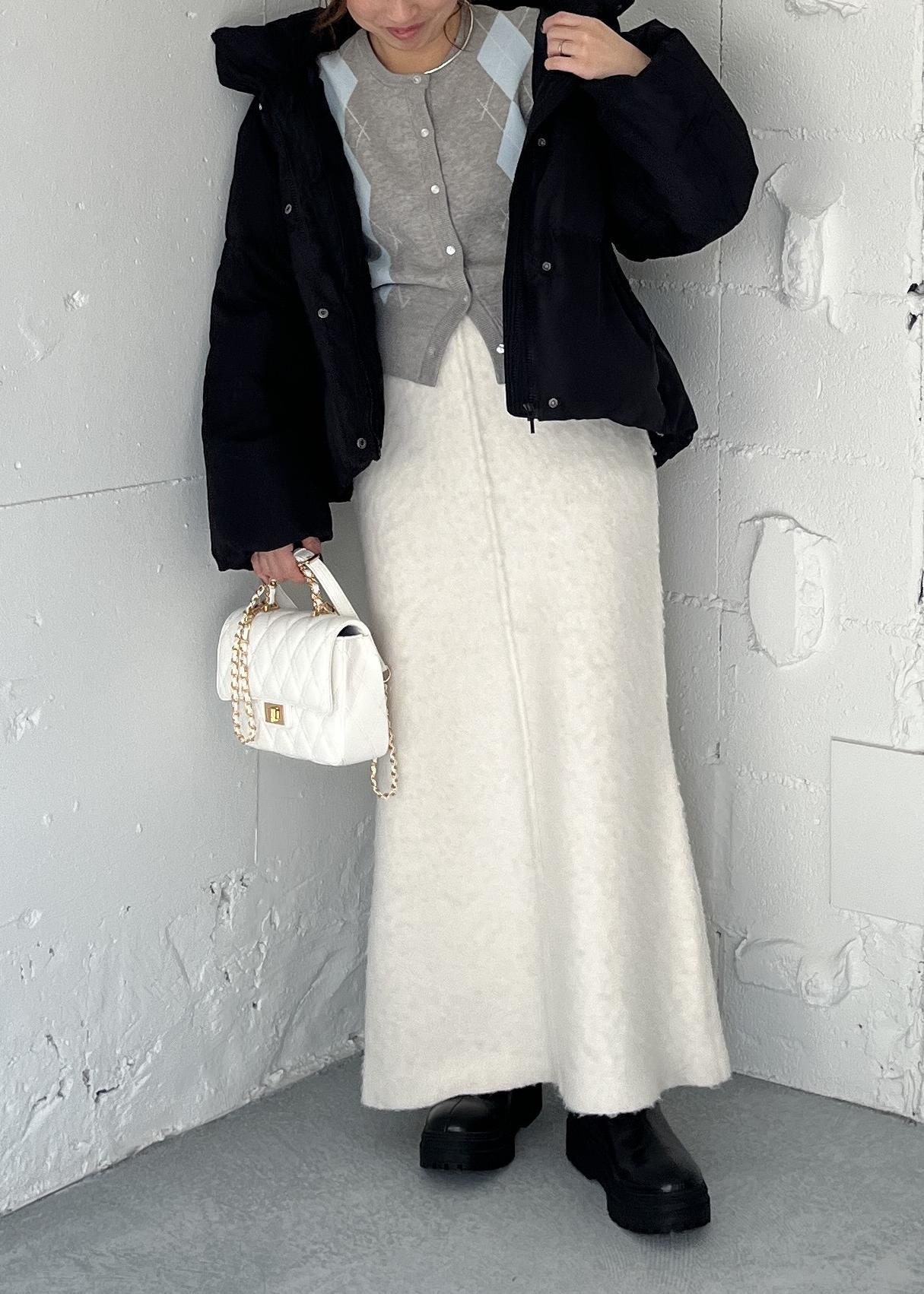 トップスにデザイン性がある分、ボトムは起毛感のあるアイボリースカートでなじませて、やわらかいトーンをキープ。
