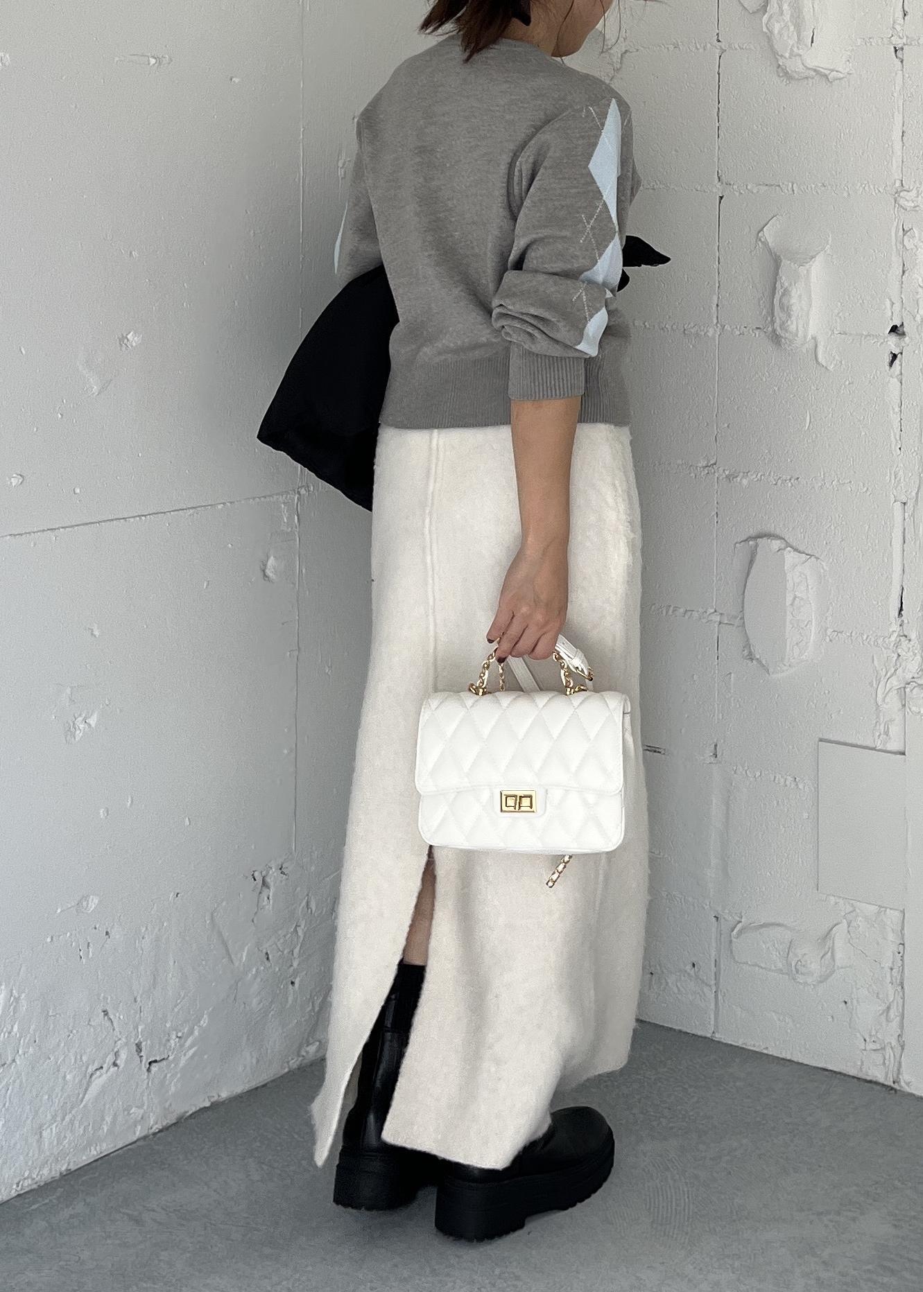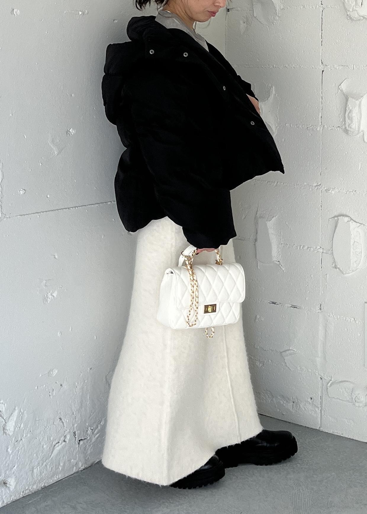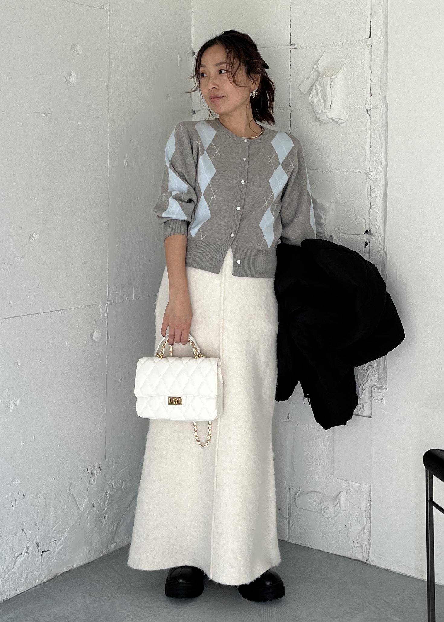 トップスにデザイン性がある分、ボトムは起毛感のあるアイボリースカートでなじませて、やわらかいトーンをキープ。