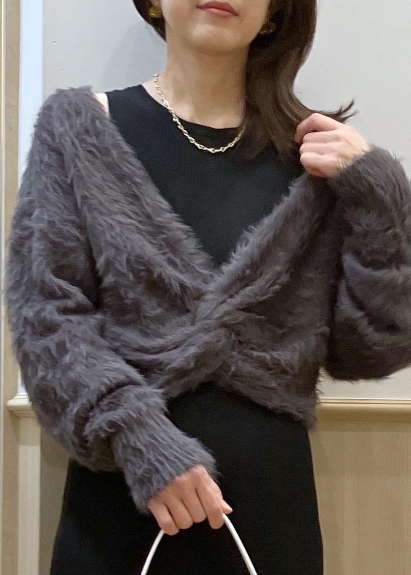 インナーは肌見せデザインの華やかなニットワンピと合わせて女子感高めに!