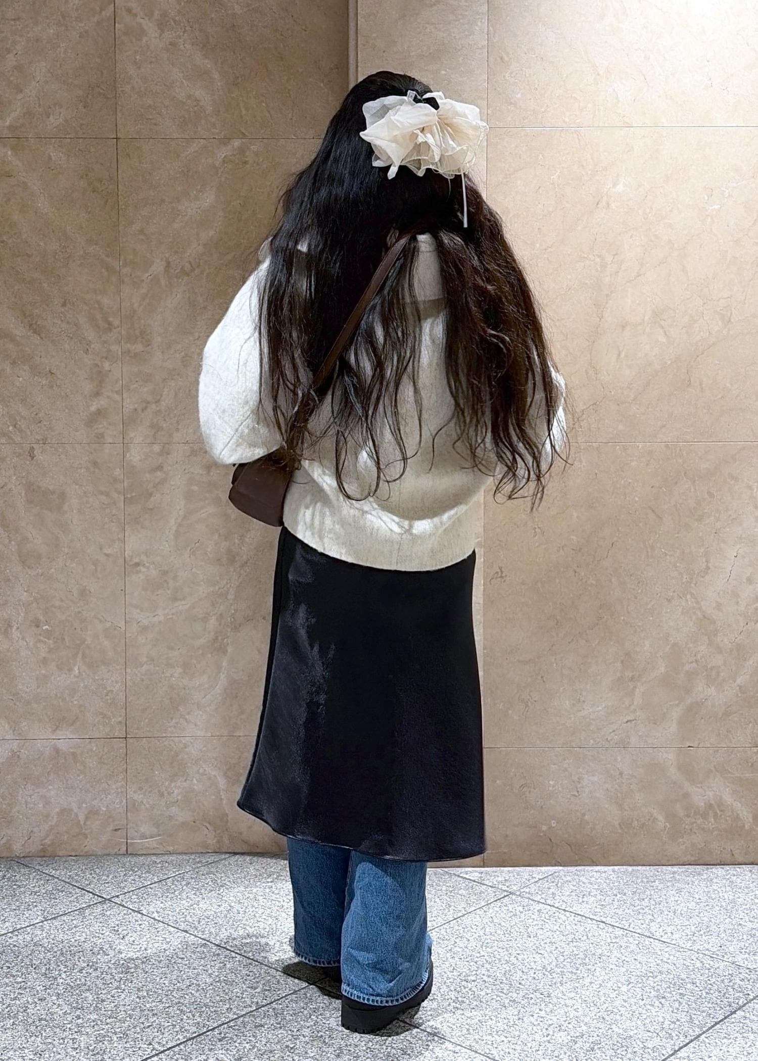 VISシャイニーナローフレアスカートブラック / F¥6,589レビュー見た目がキラキラとしていて動いても可愛いスカートです。今回は胸元まで上げて重ね着してみました◎可愛い、、、
