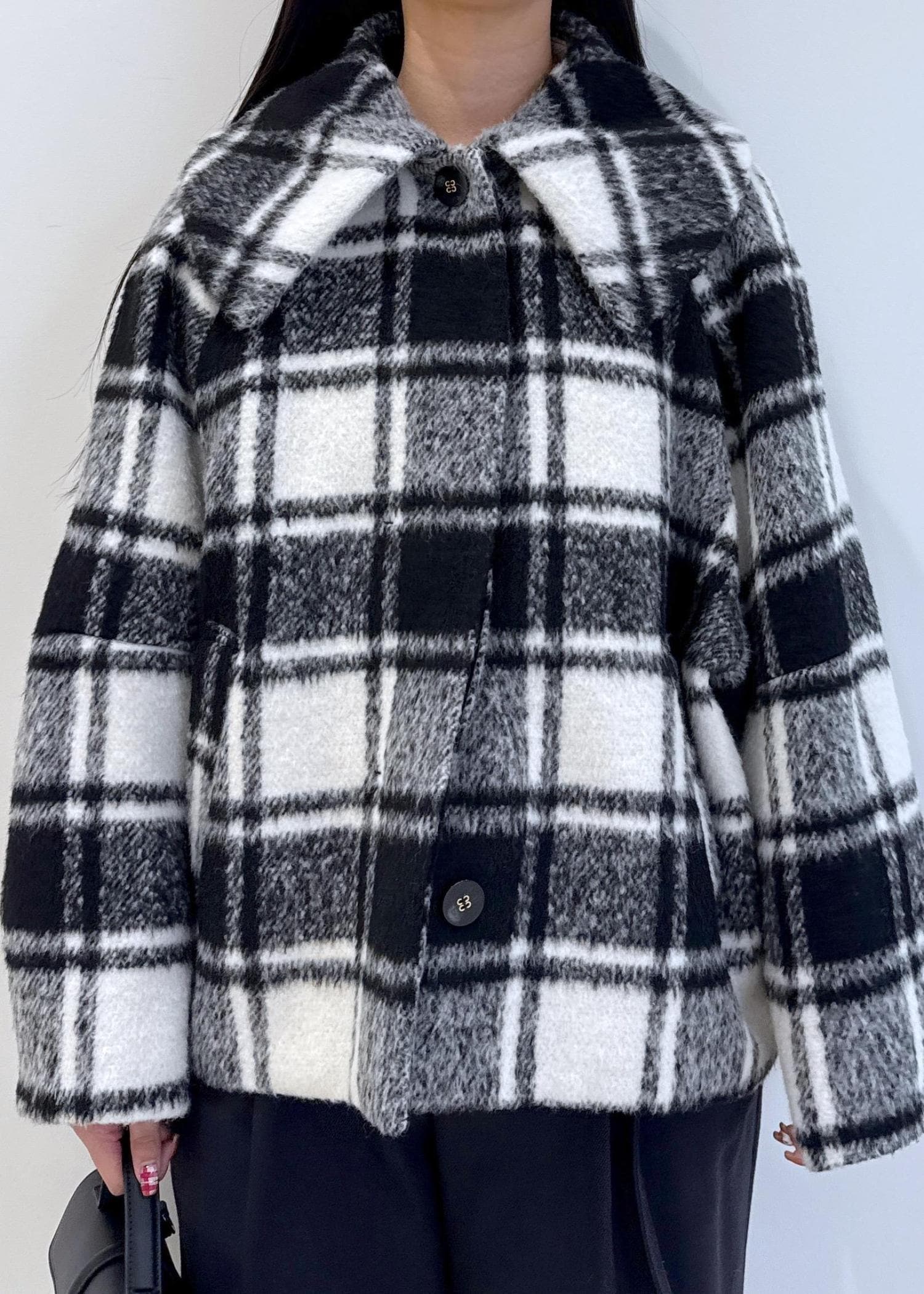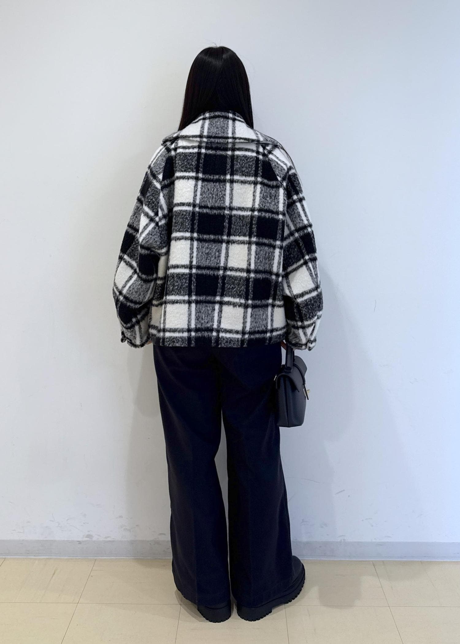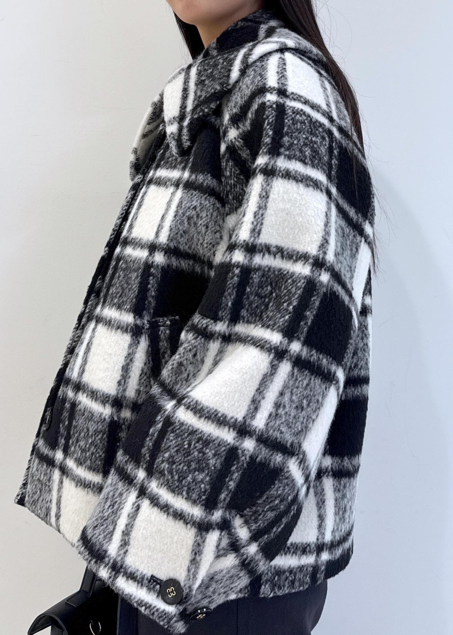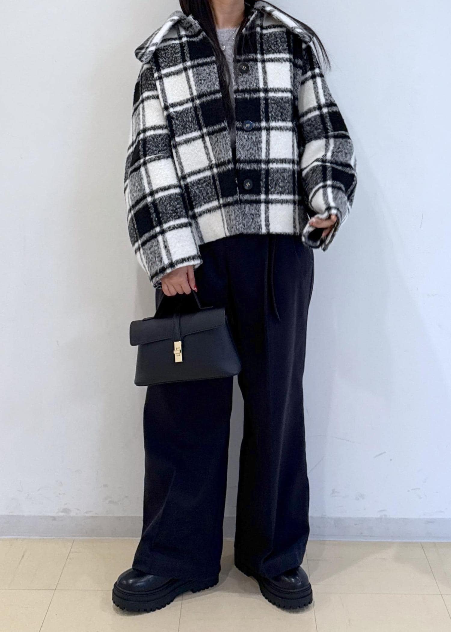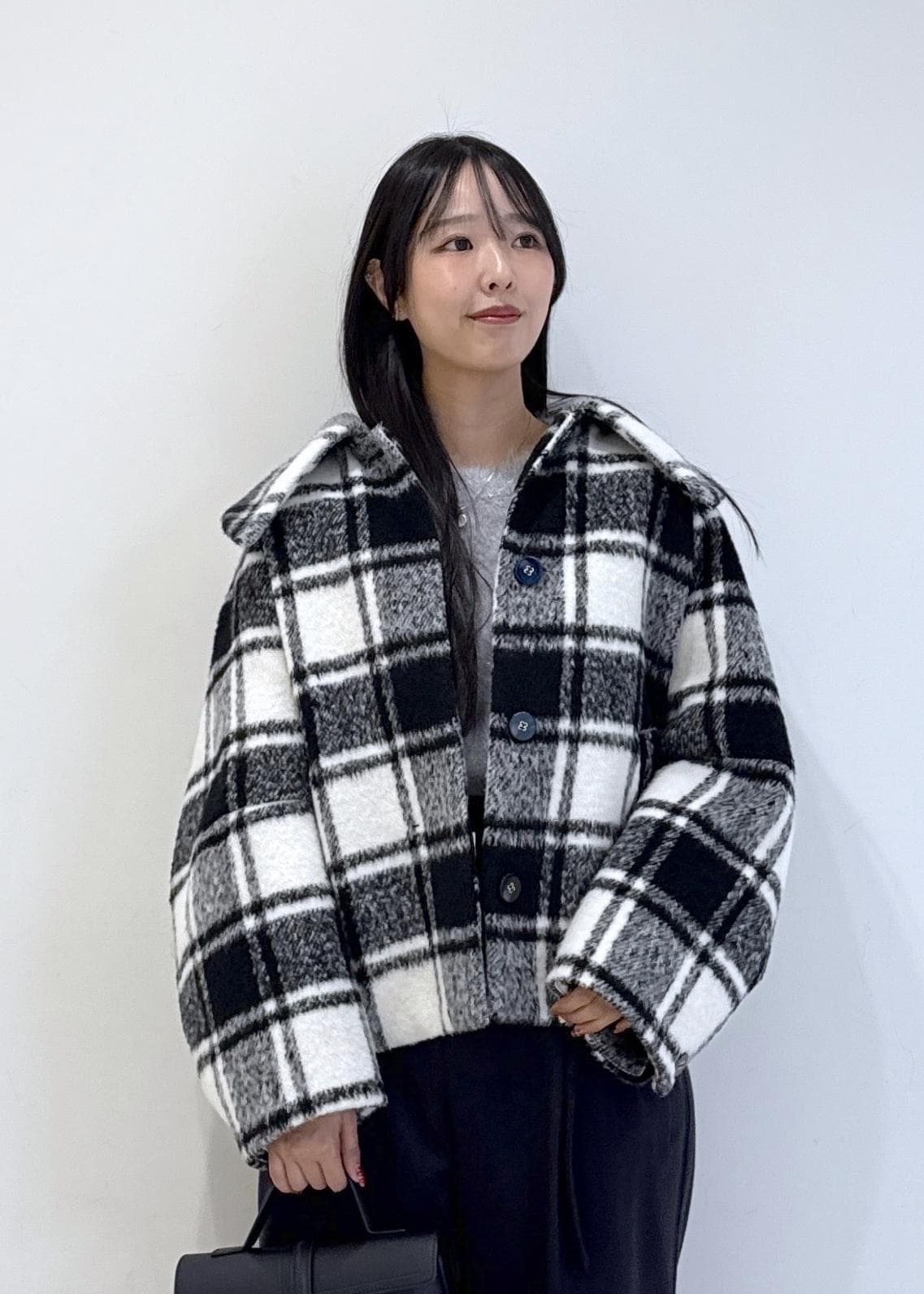 大きなモノトーンチェックのアウターは、韓国らしさを感じる柄です