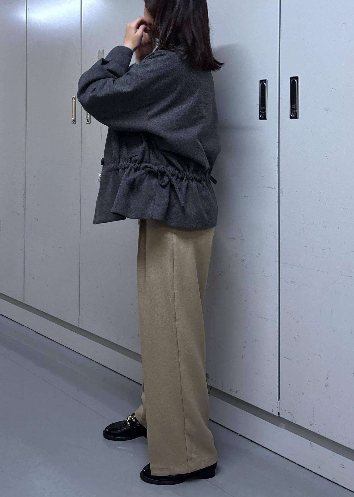 VISドロストペプラムブルゾングレー / F¥14,080レビューゆったりサイズでかなり余裕ありました。厚手のニットもしっかり羽織れそうです。生地は硬めです。丈もお尻かかる長さですが、絞れるのですっきり見えはします。