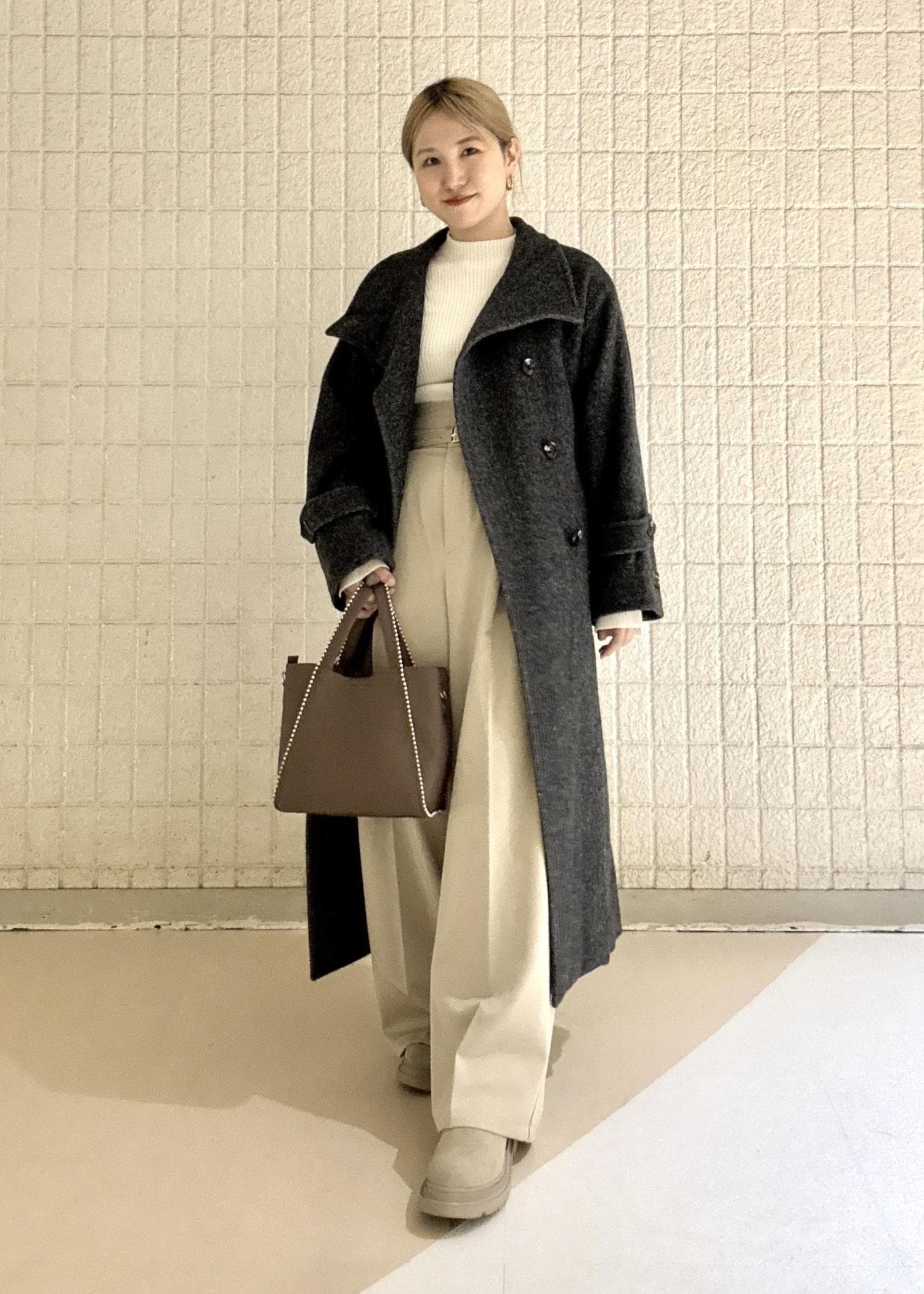 柔らかい生地感なので広がらず落ち感が綺麗に出るので低身長の方でも合わせやすいと思います。 -