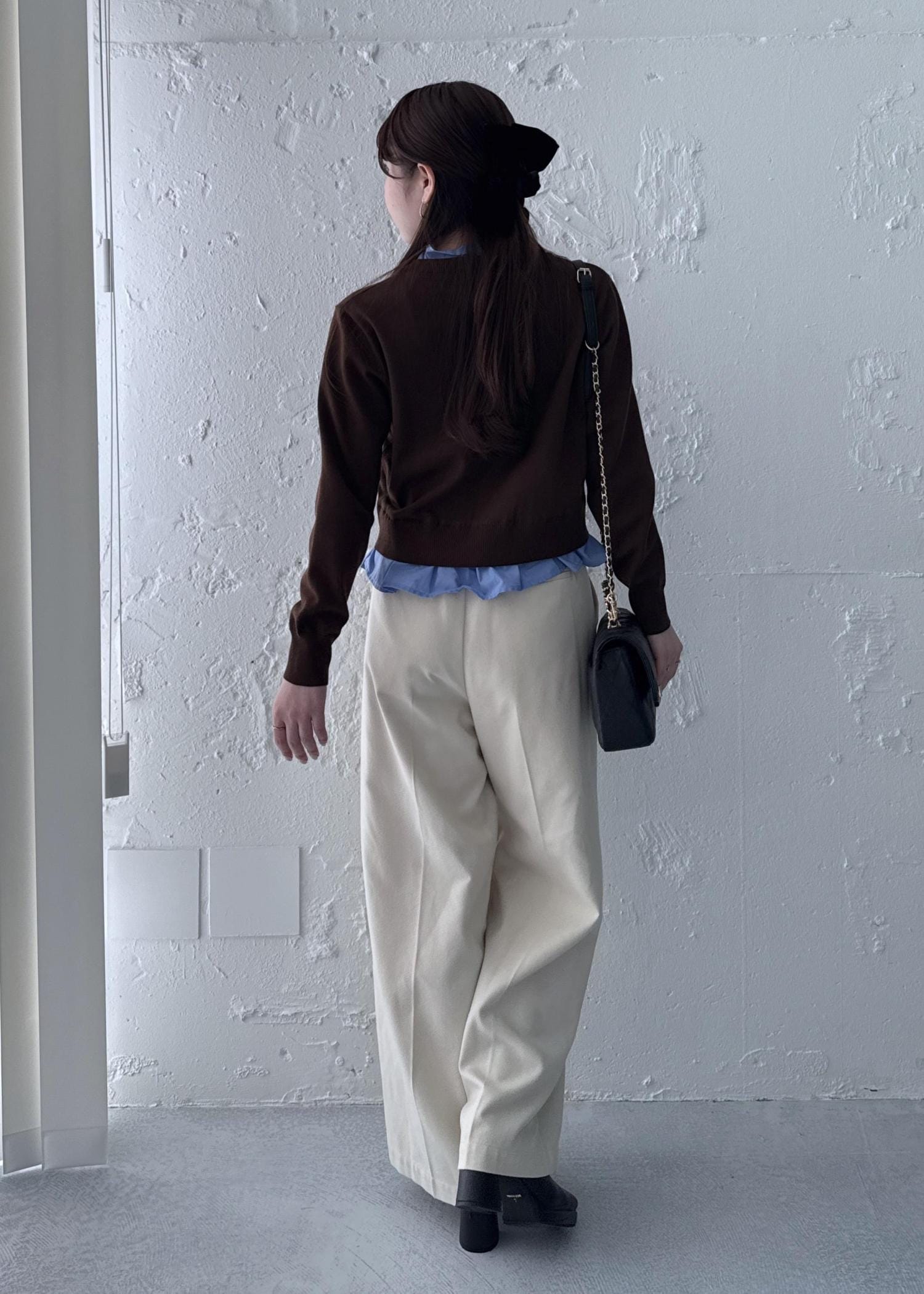 襟元と裾のフリルがポイント!華やかだけど落ち着きのある大人っぽパンツスタイル◎