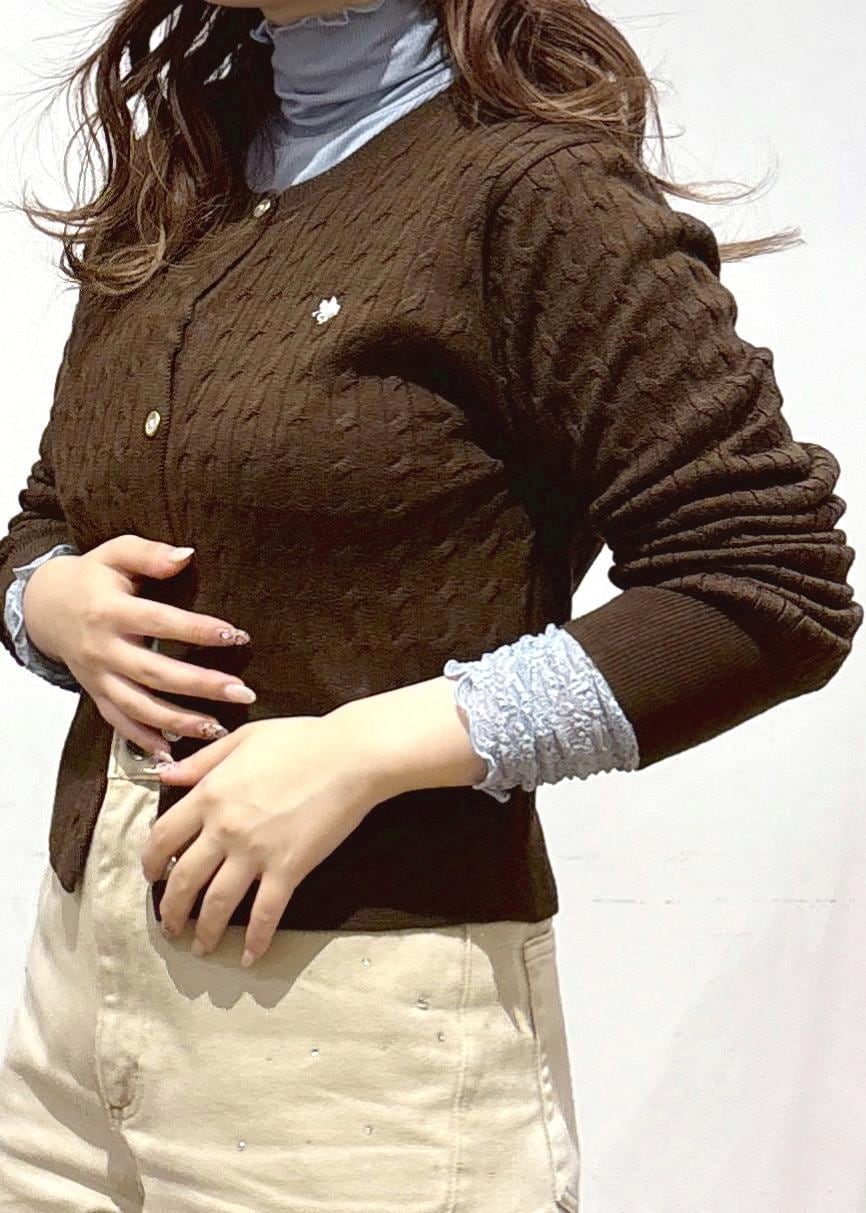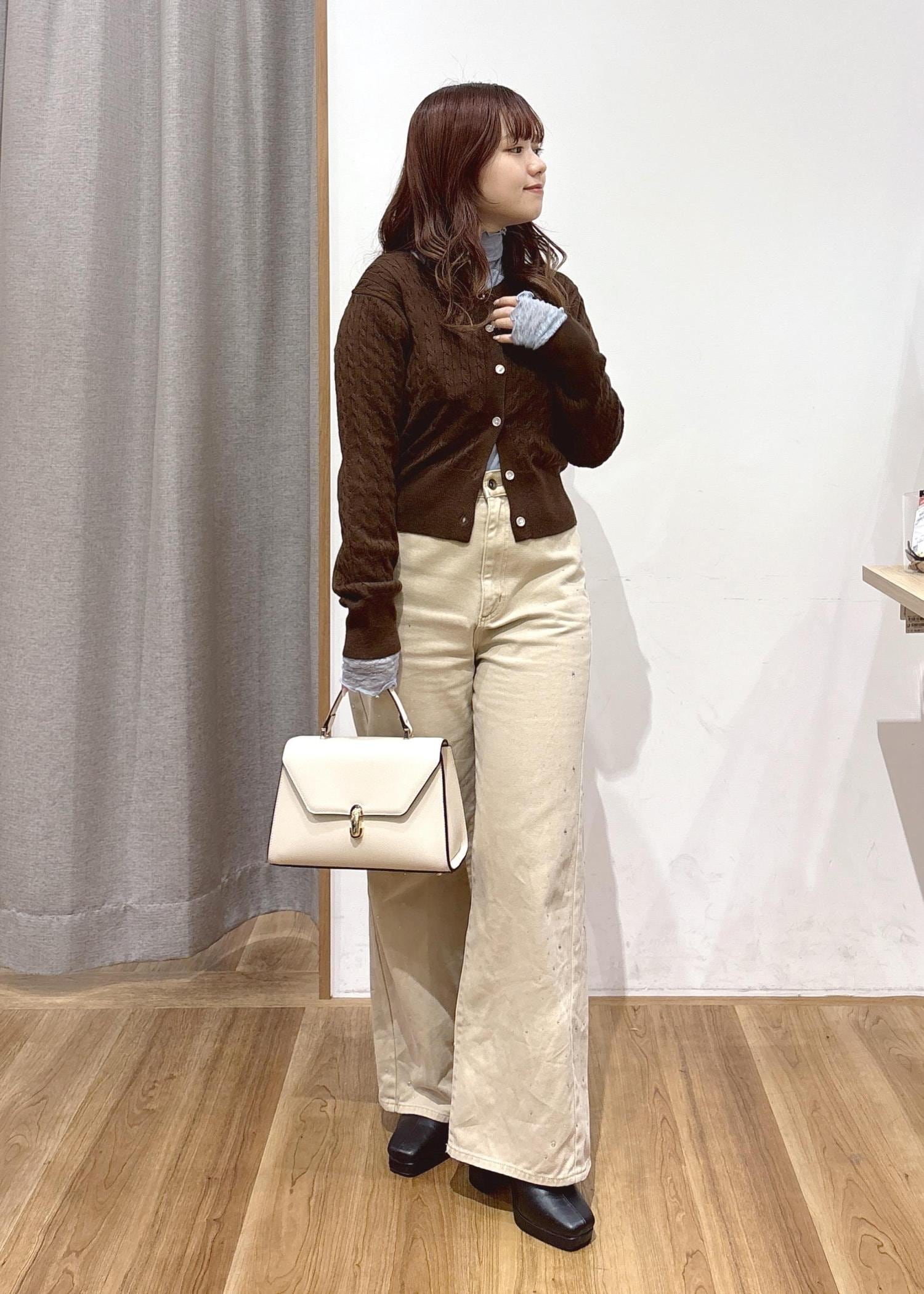 POLOのブラウンカーディガンをメインに、差し色としてブルーのハイネックインナーをプラスしたコーディネートです。