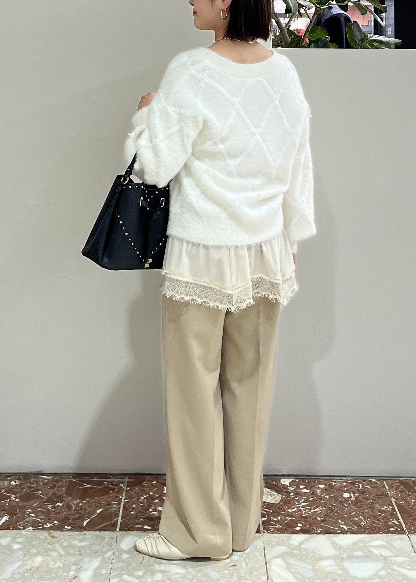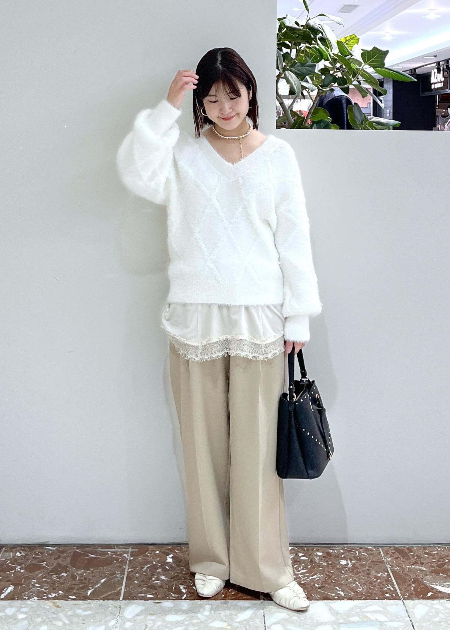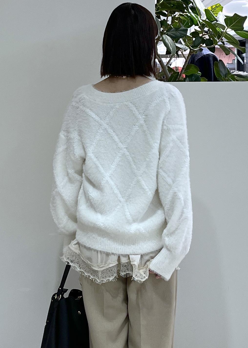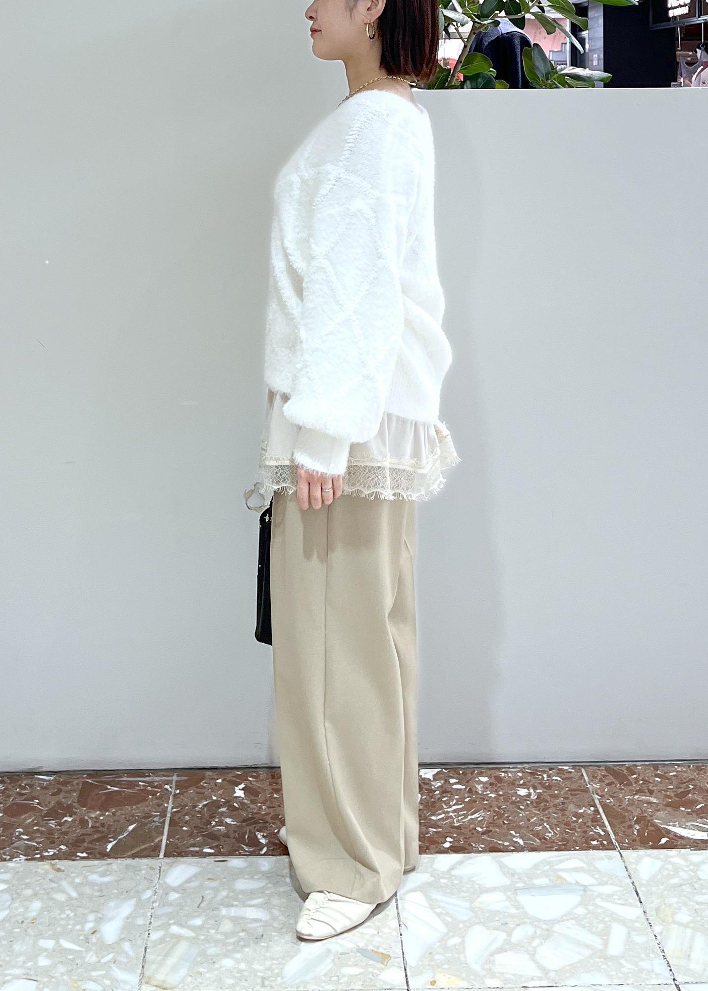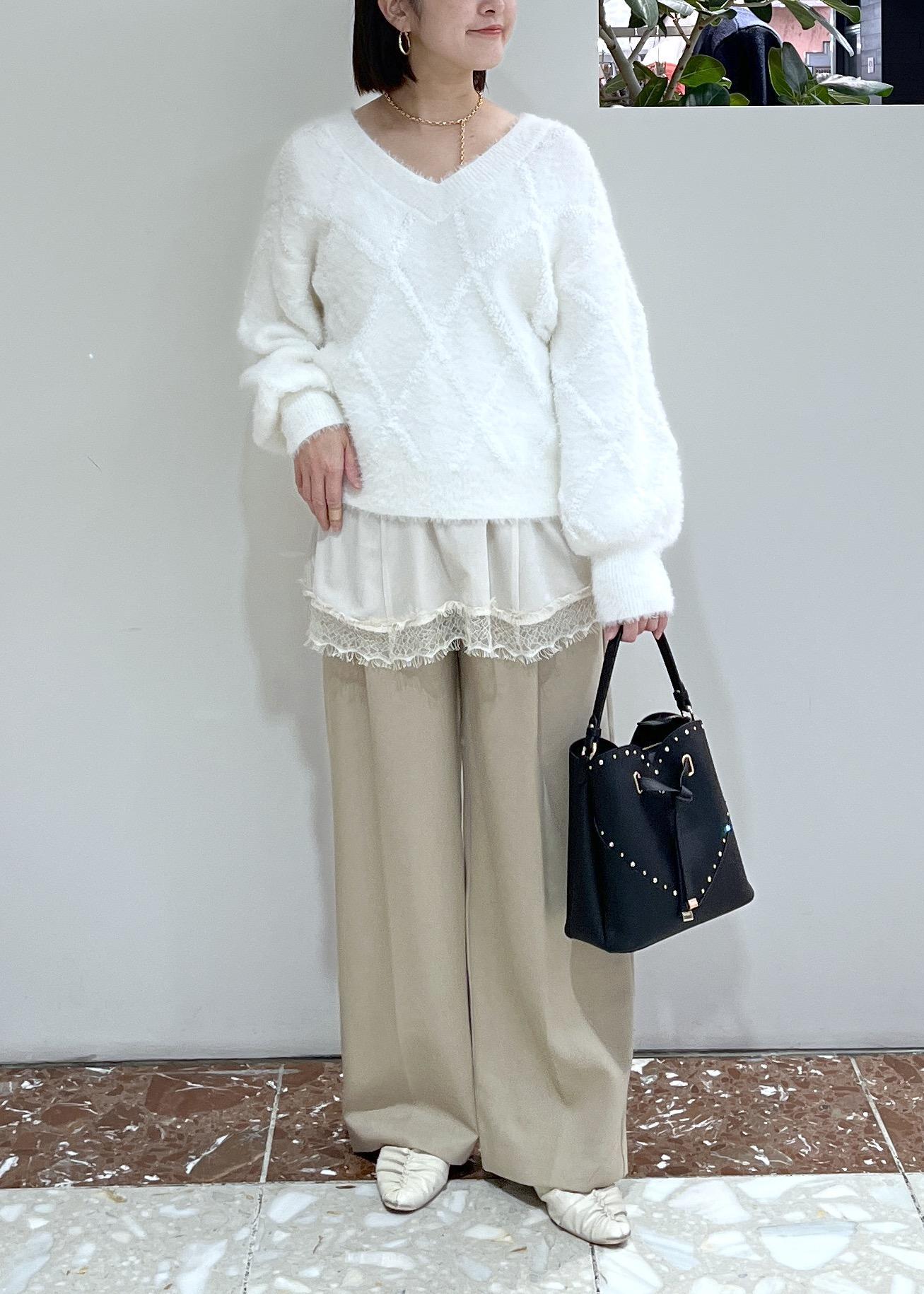 VISアーガイルフェザーニット/2WAY・イージーケアオフホワイト / F¥6,589レビュー前後2wayで着用できます。袖がポワンとした可愛い印象です。