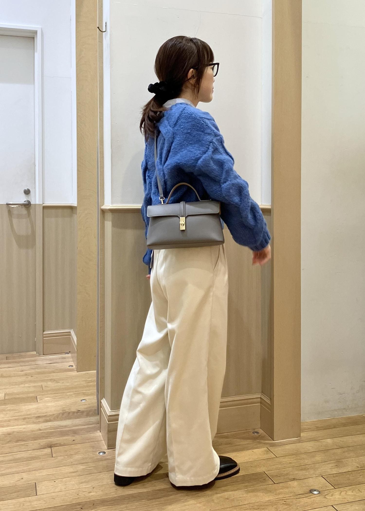 ブルーのカラーが綺麗なケーブルニットをホワイトカラーのワイドパンツを合わせて好印象間違い無し!