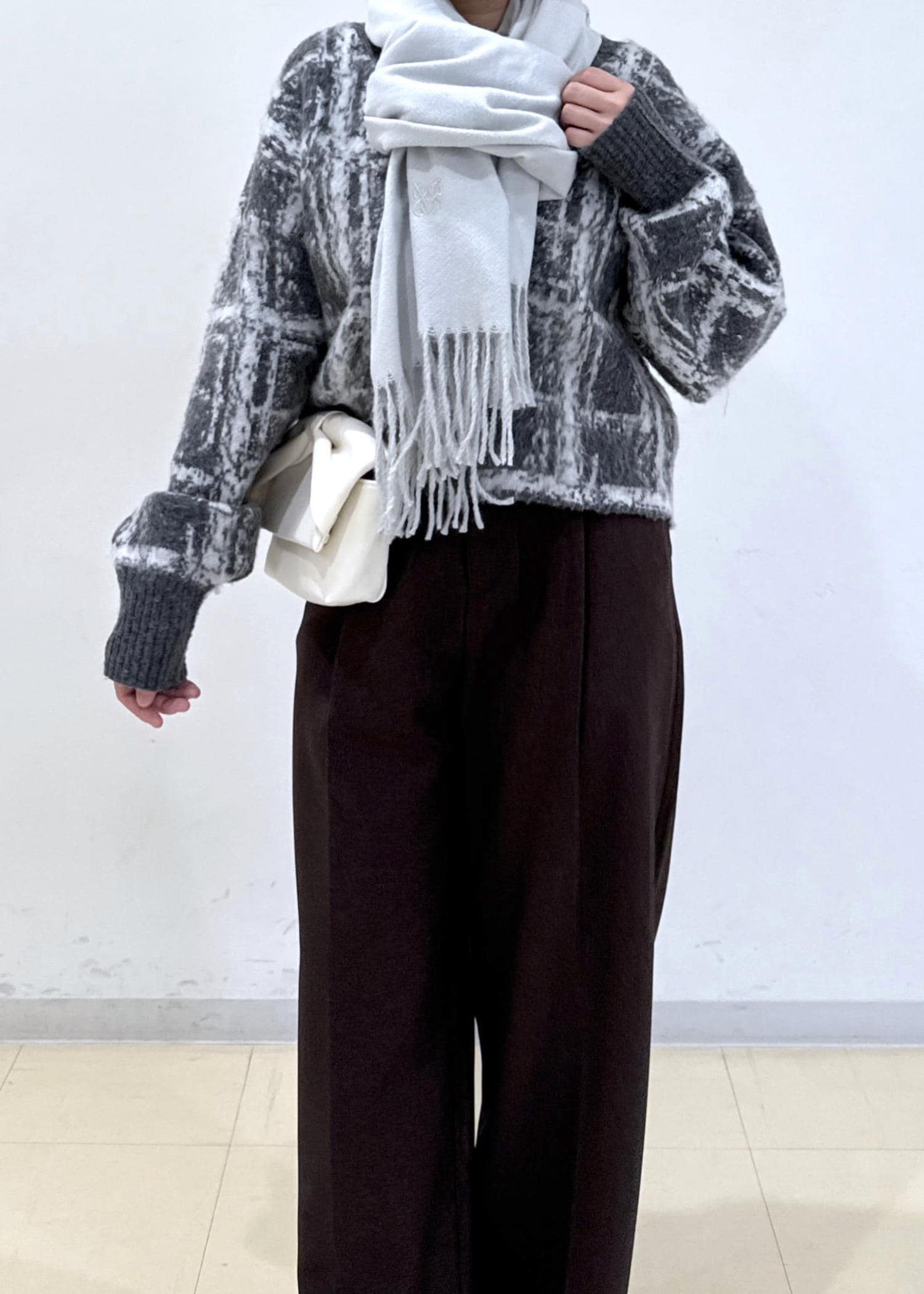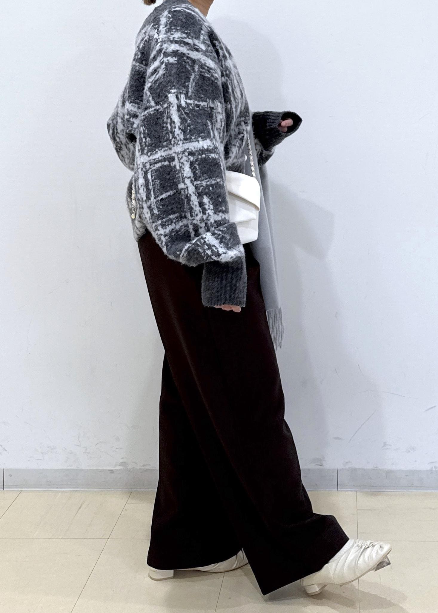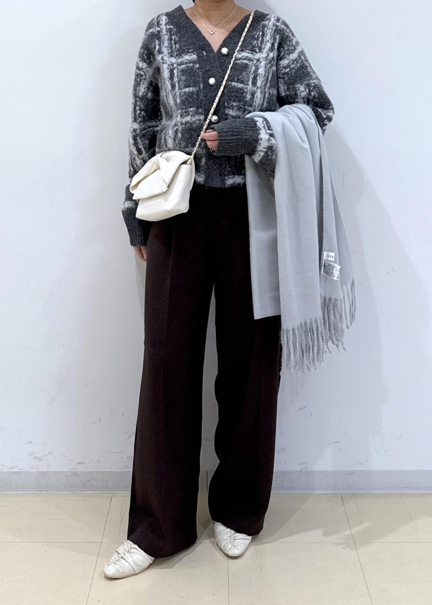 甘めのカーディガンをパンツに合わせることで甘すぎない冬のデートコーデにしました。