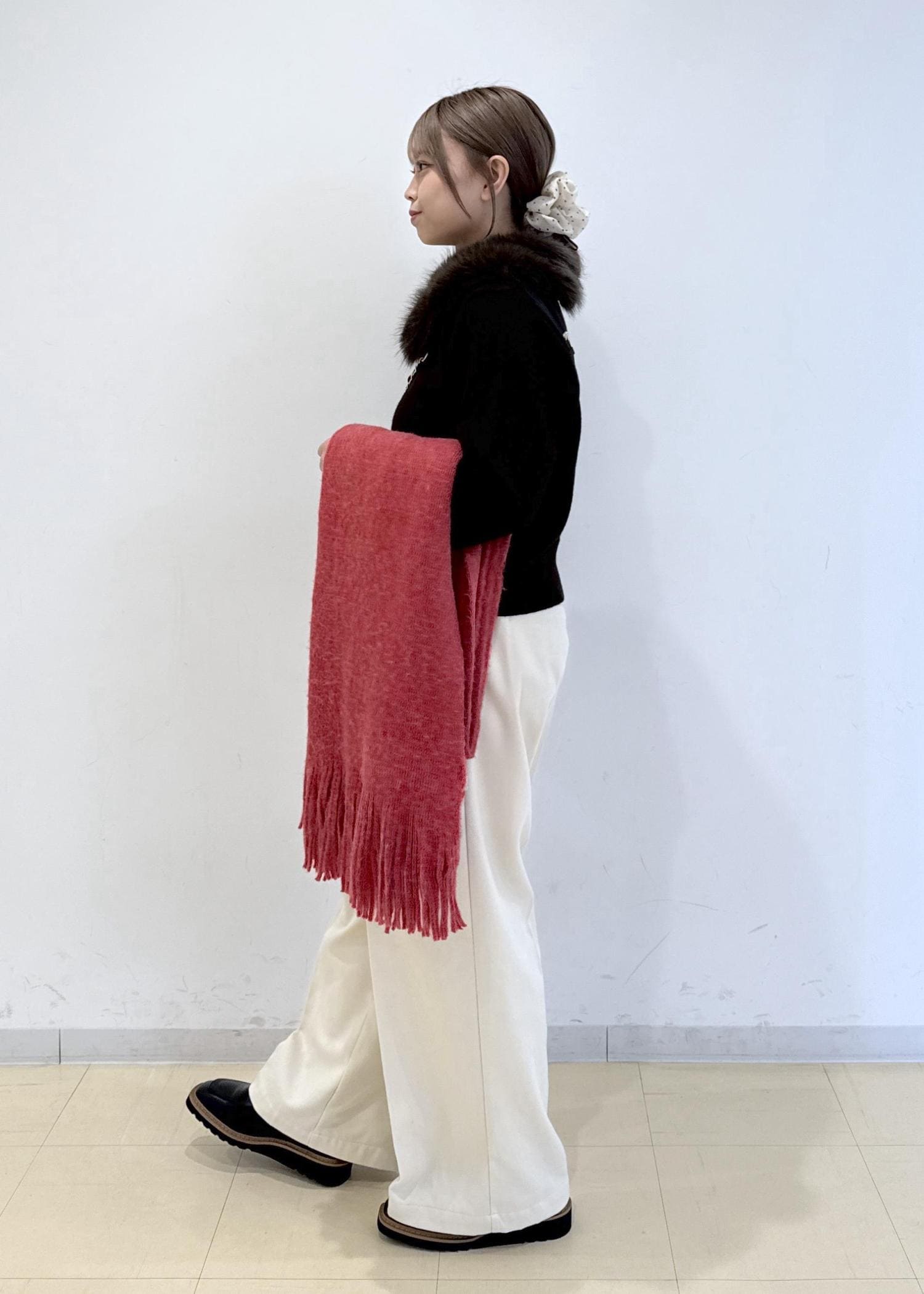 ブラウンのカーディガンとホワイトのパンツの組み合わせに赤のマフラーを持ち、冬感を出せるように意識しました。