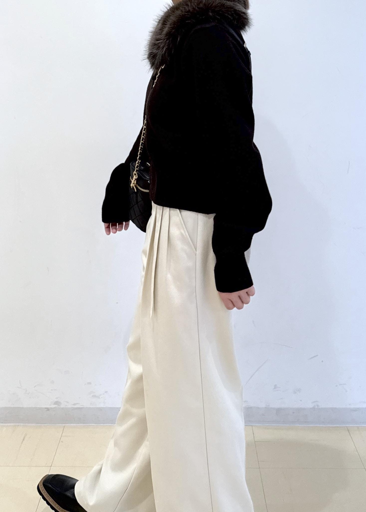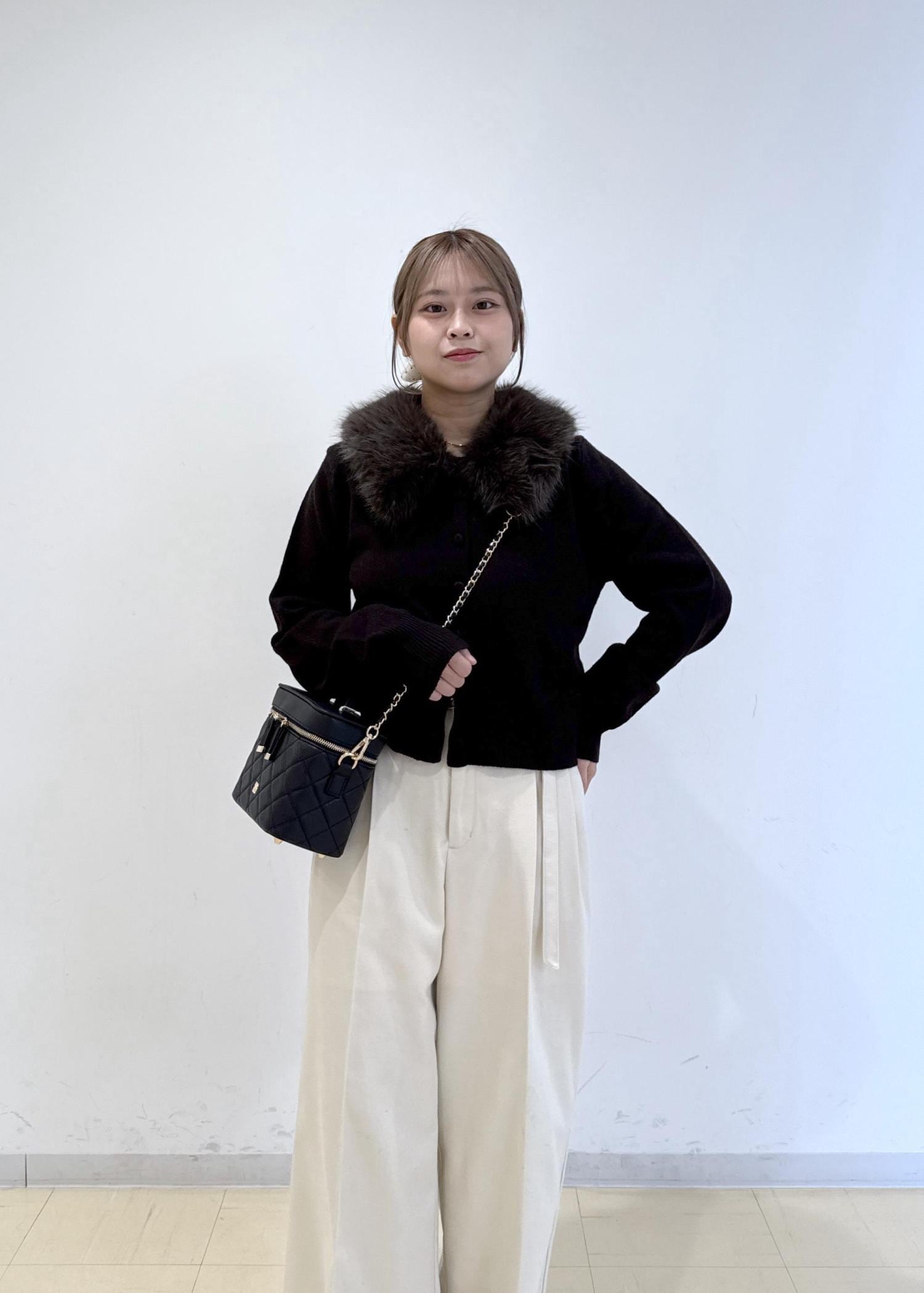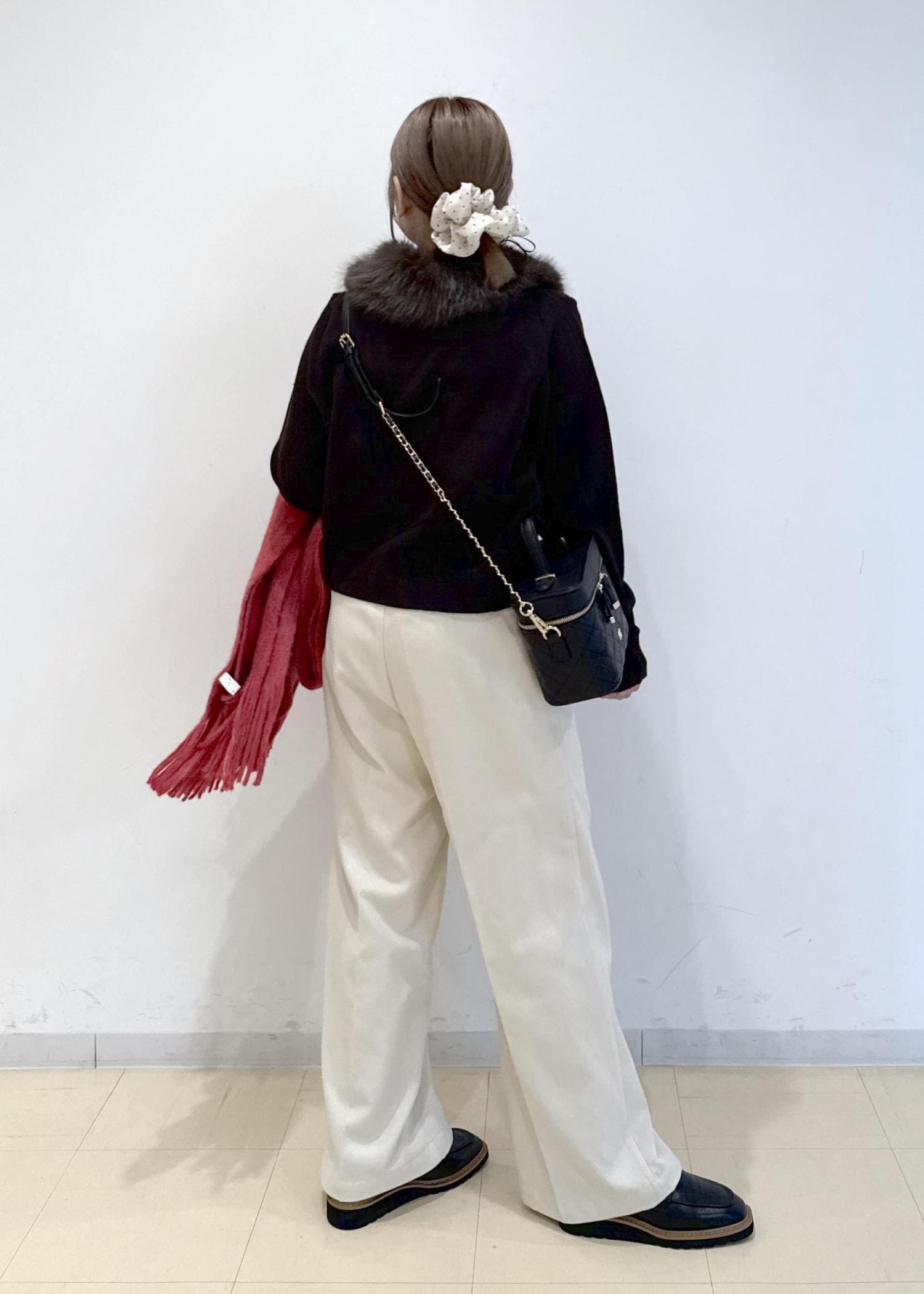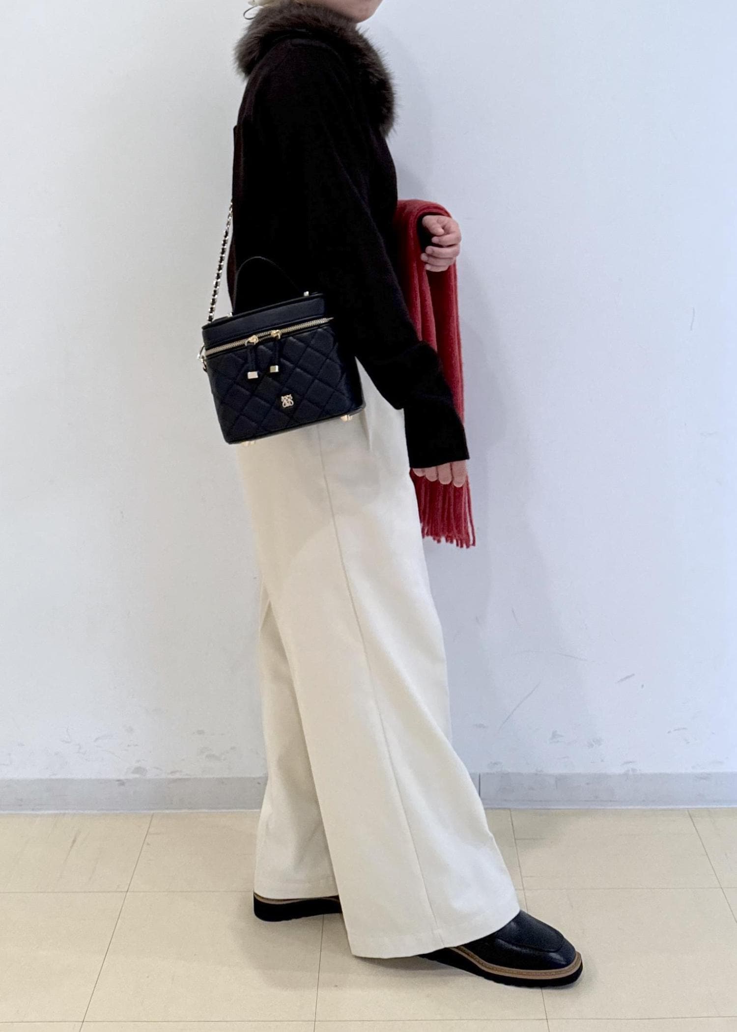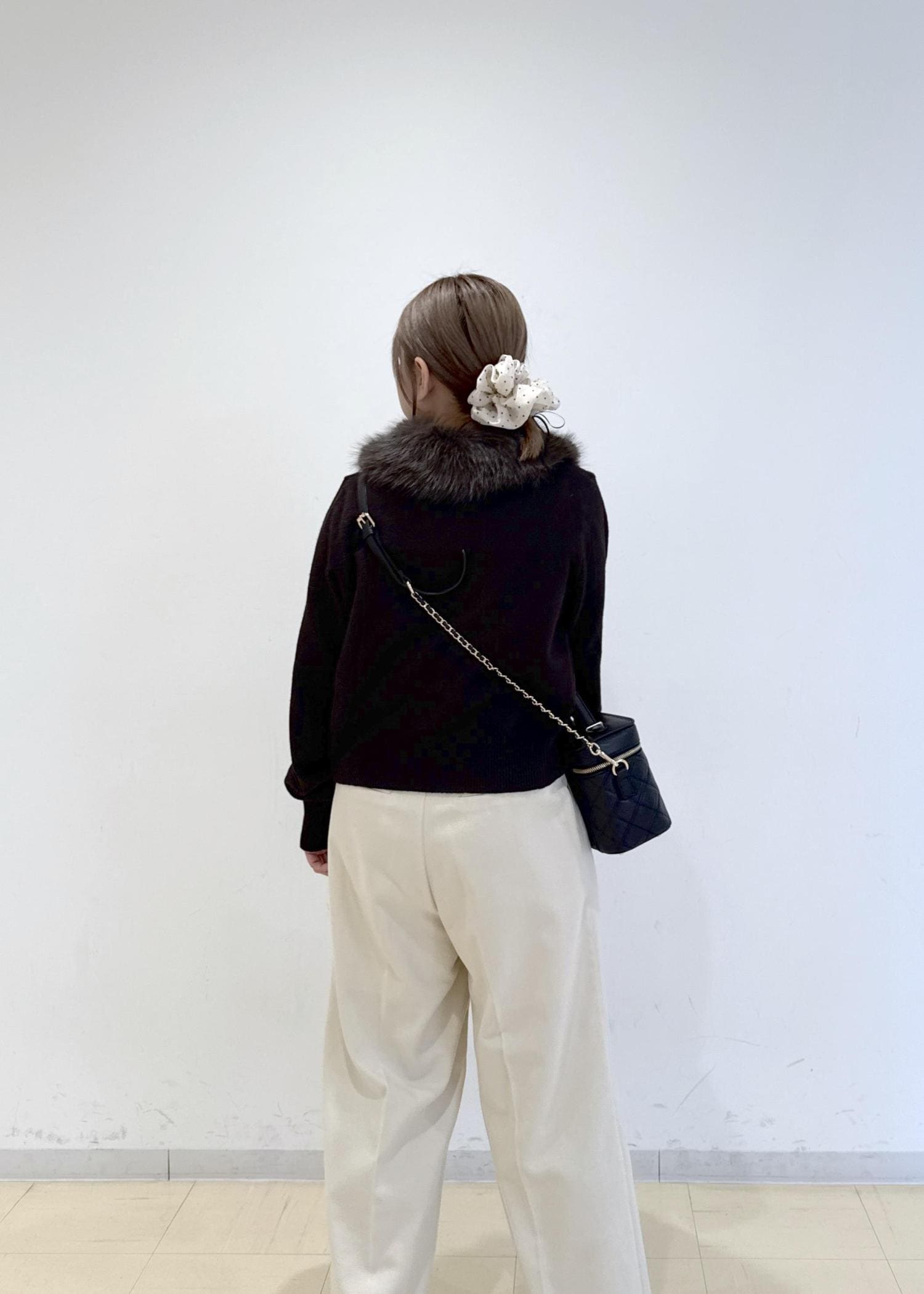 衿がファーの綺麗めなカーディガンなのでバッグはバニティにし、パンツスタイルのフェミニンコーデにしました♩