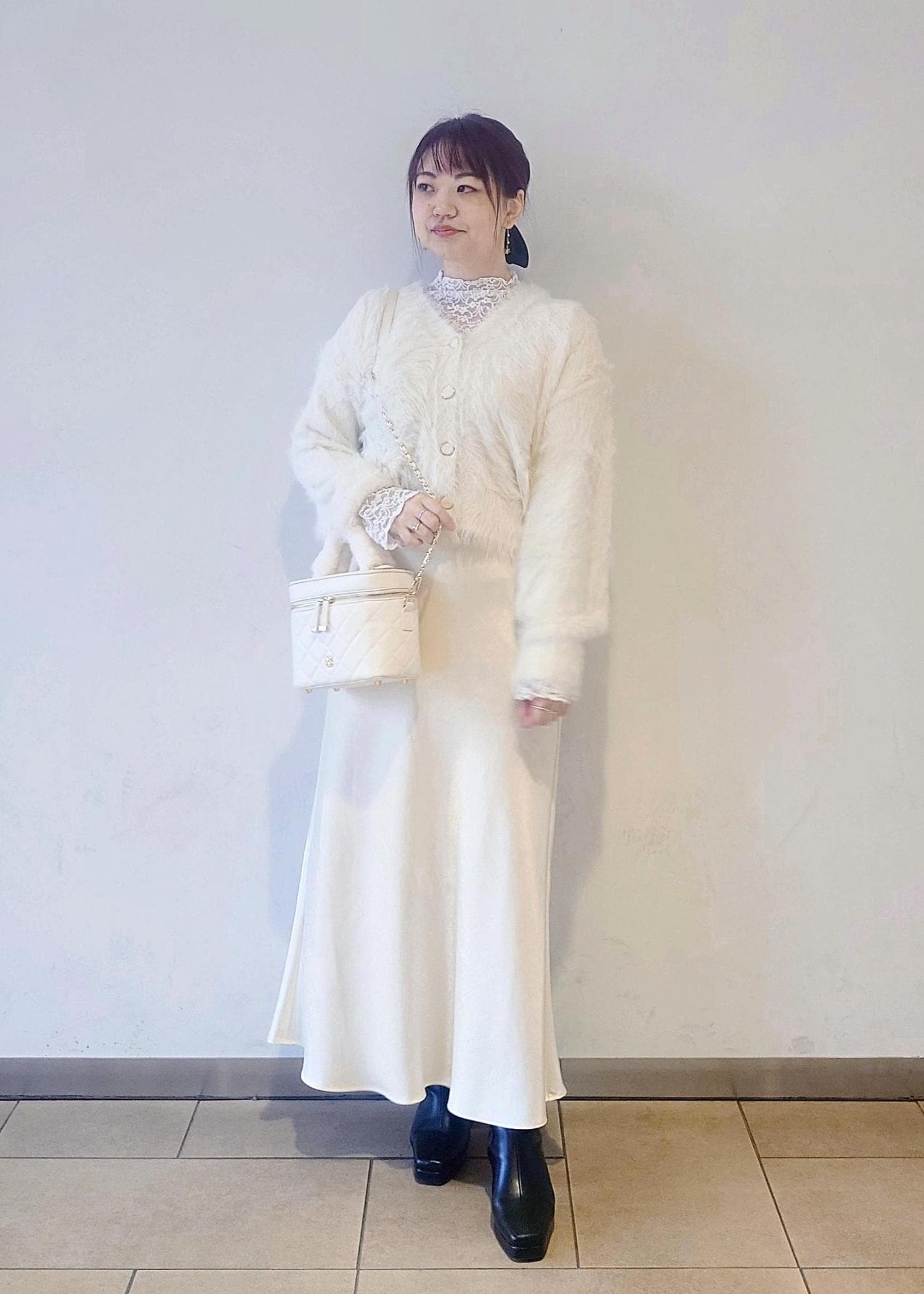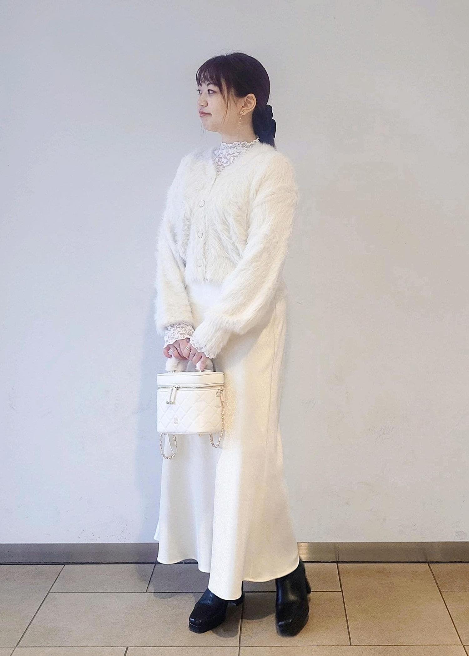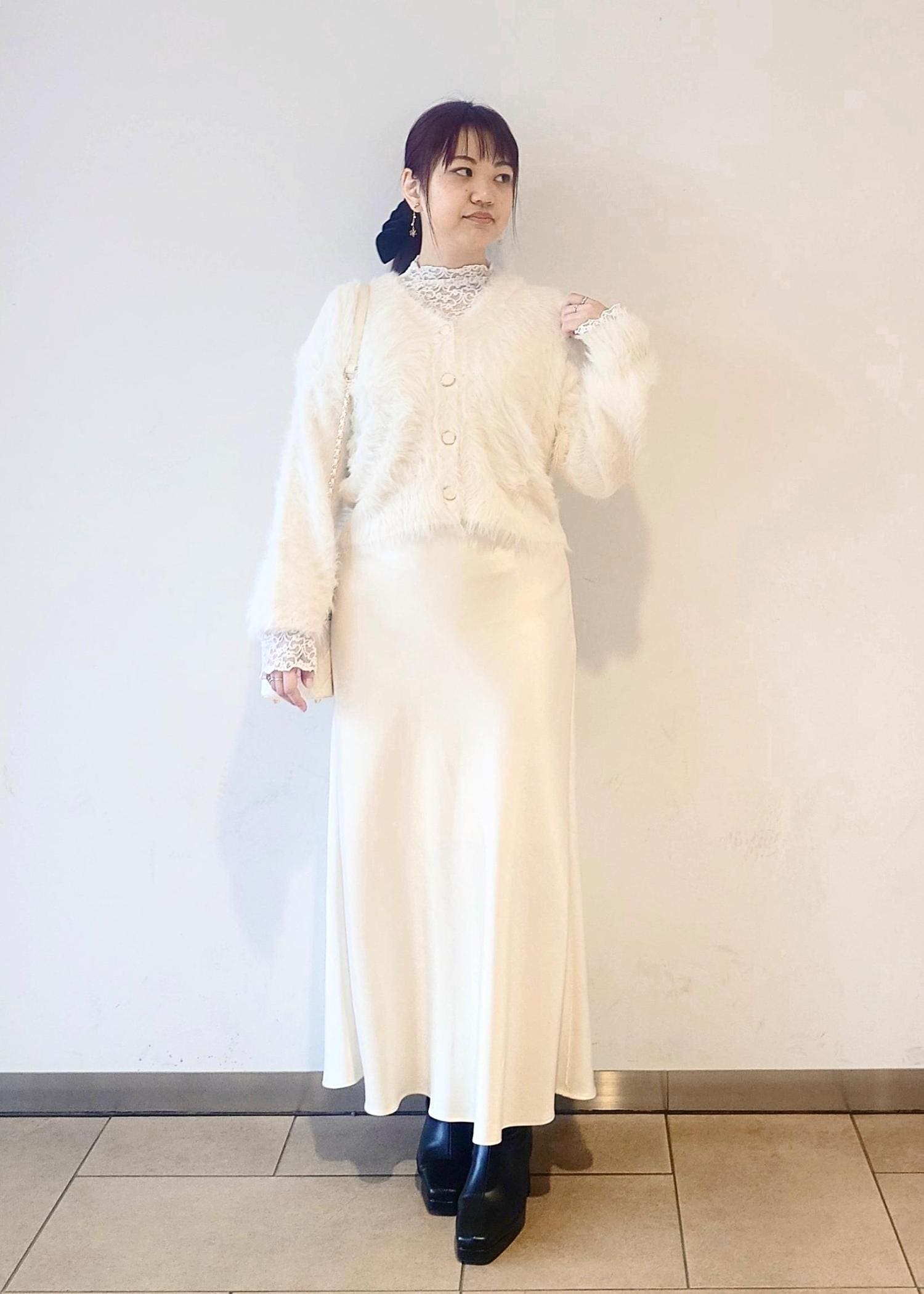 足元はブラックのブーツで汚れが目立ちにくいので、オールホワイトとは少し違う普段使いしやすいホワイトコーデにしました。