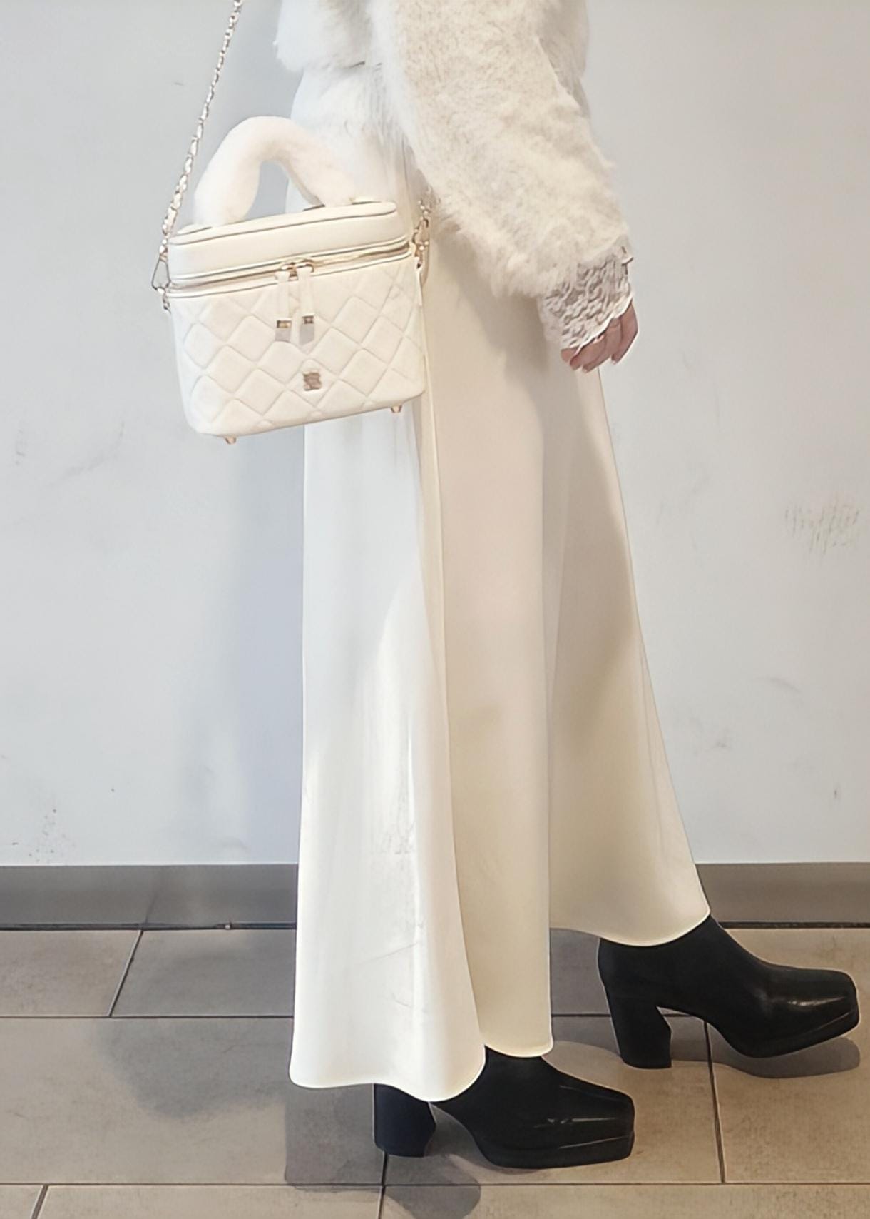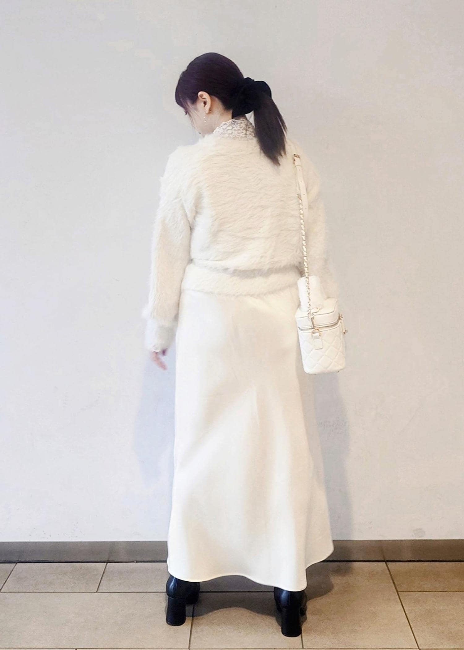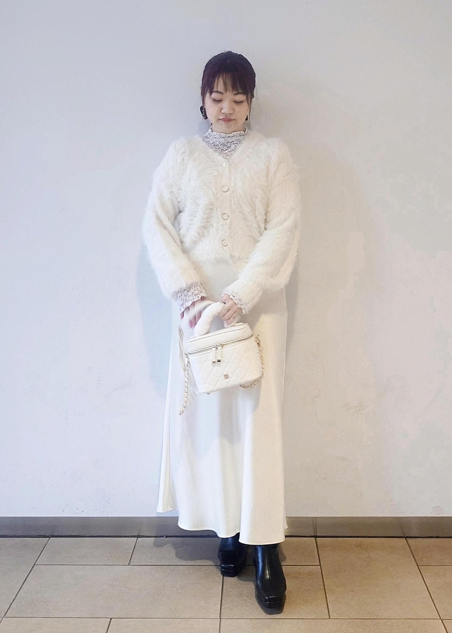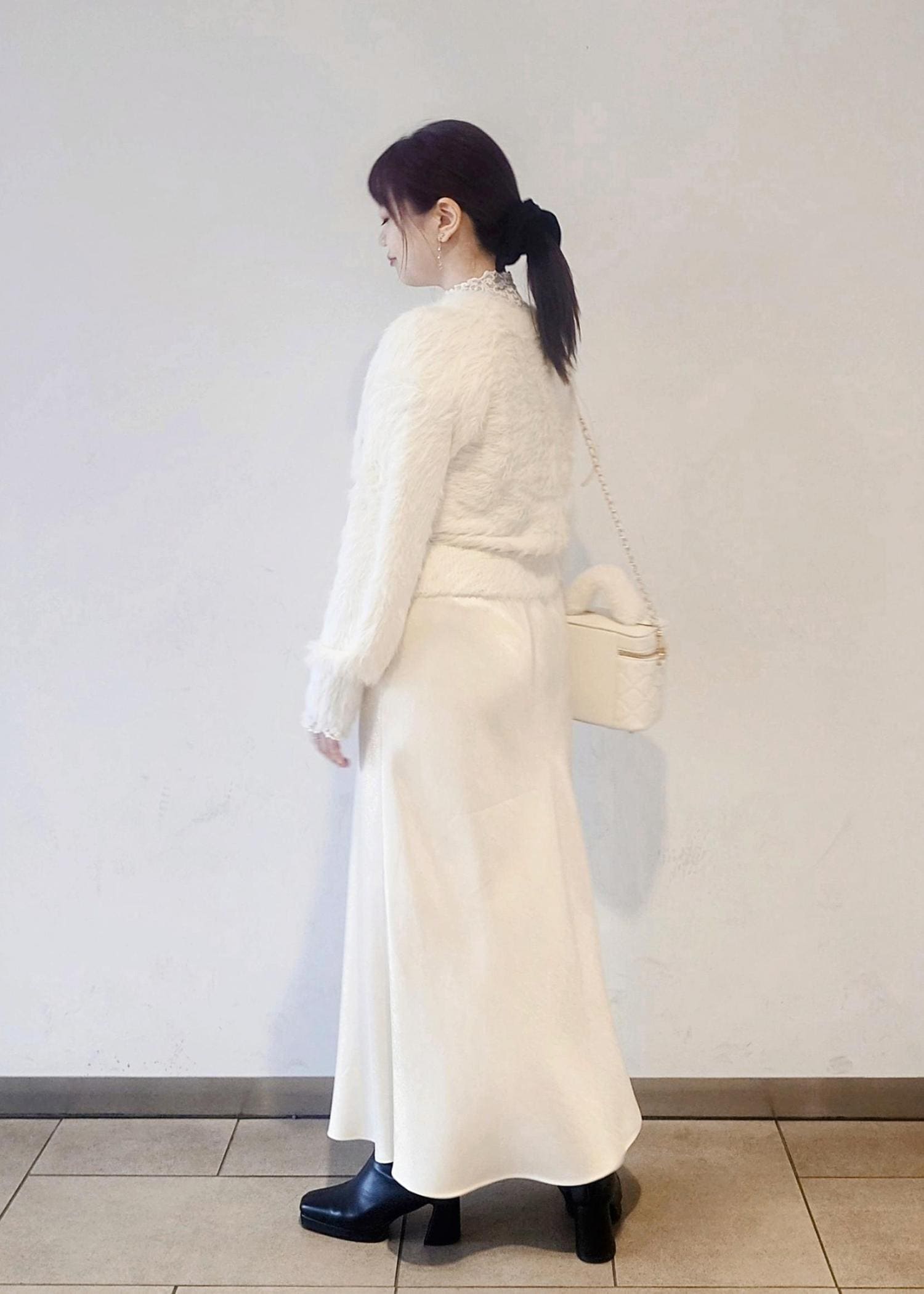 足元はブラックのブーツで汚れが目立ちにくいので、オールホワイトとは少し違う普段使いしやすいホワイトコーデにしました。