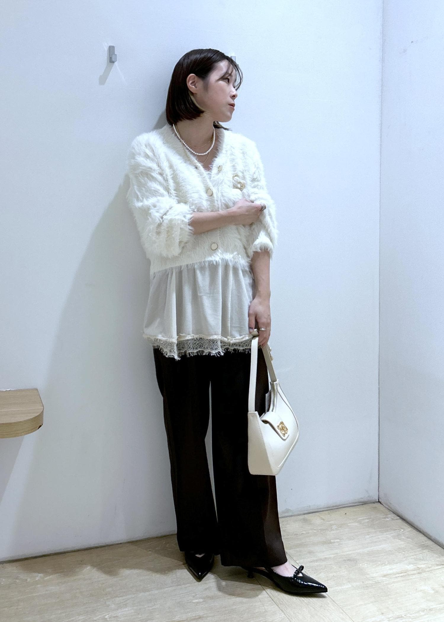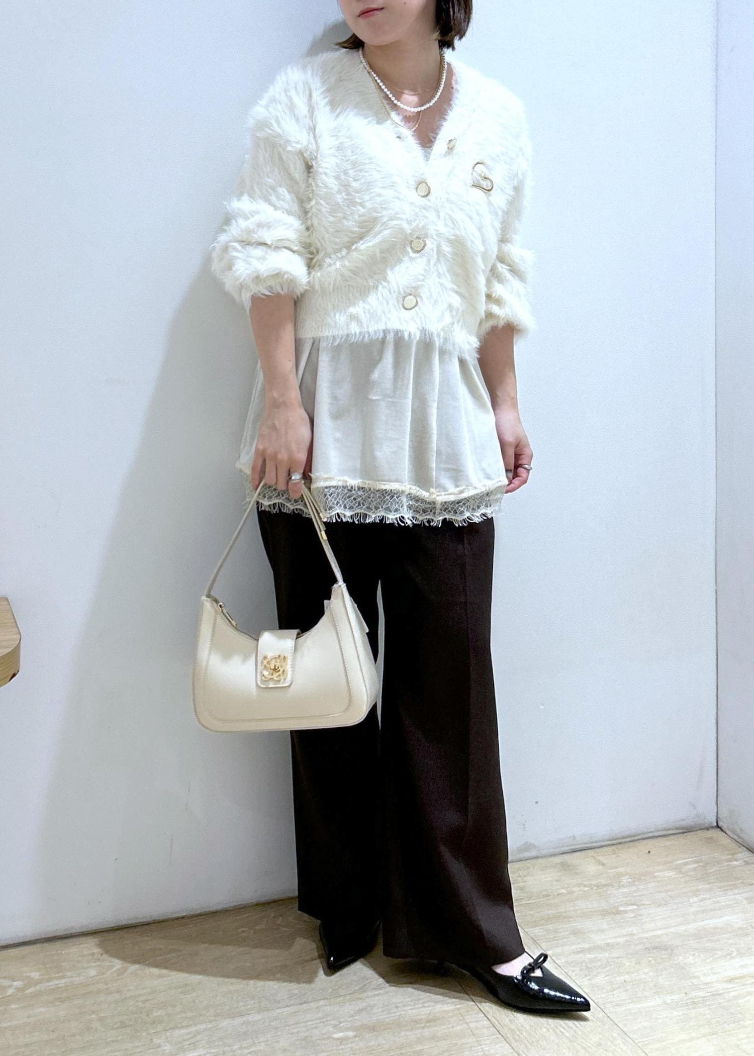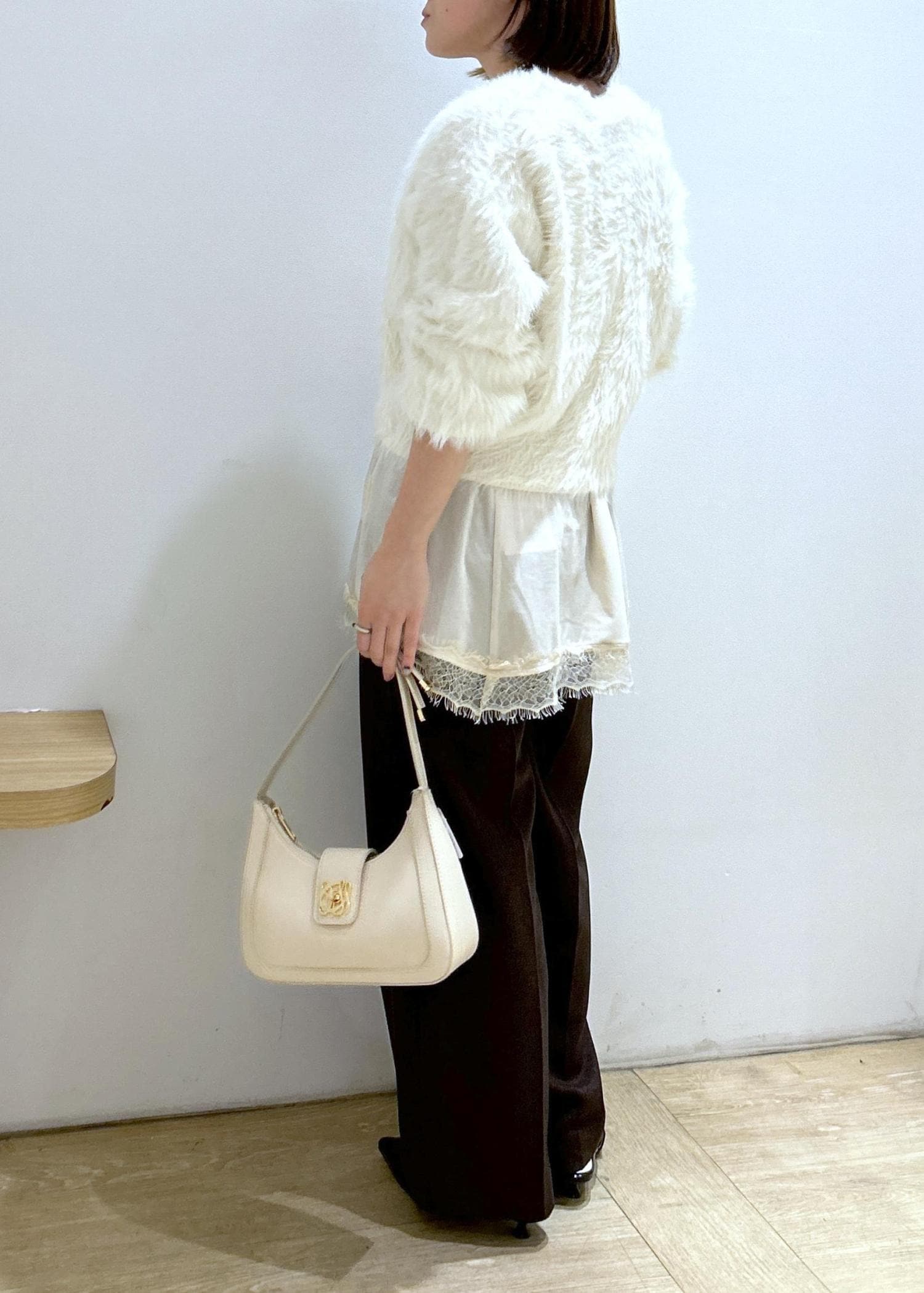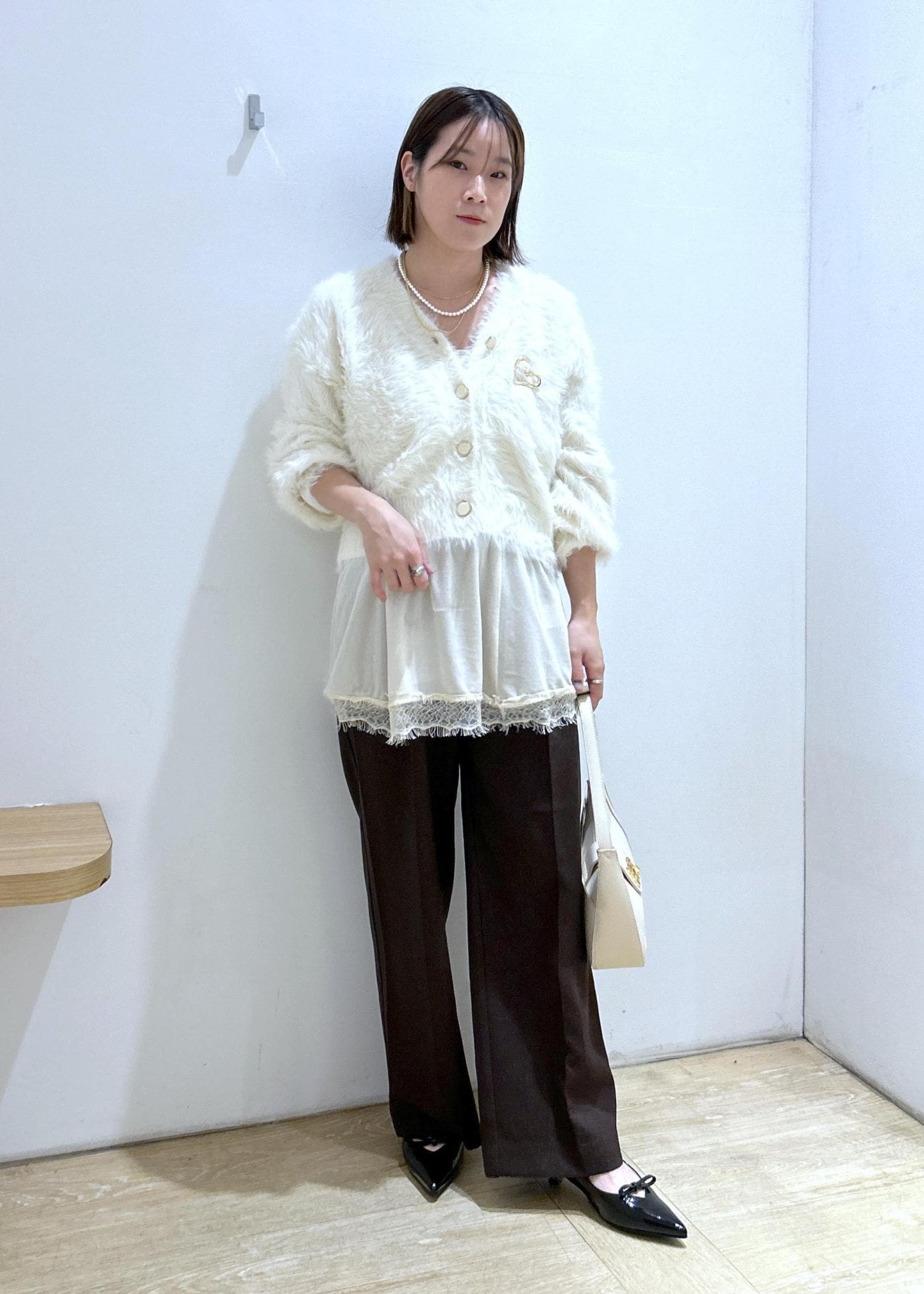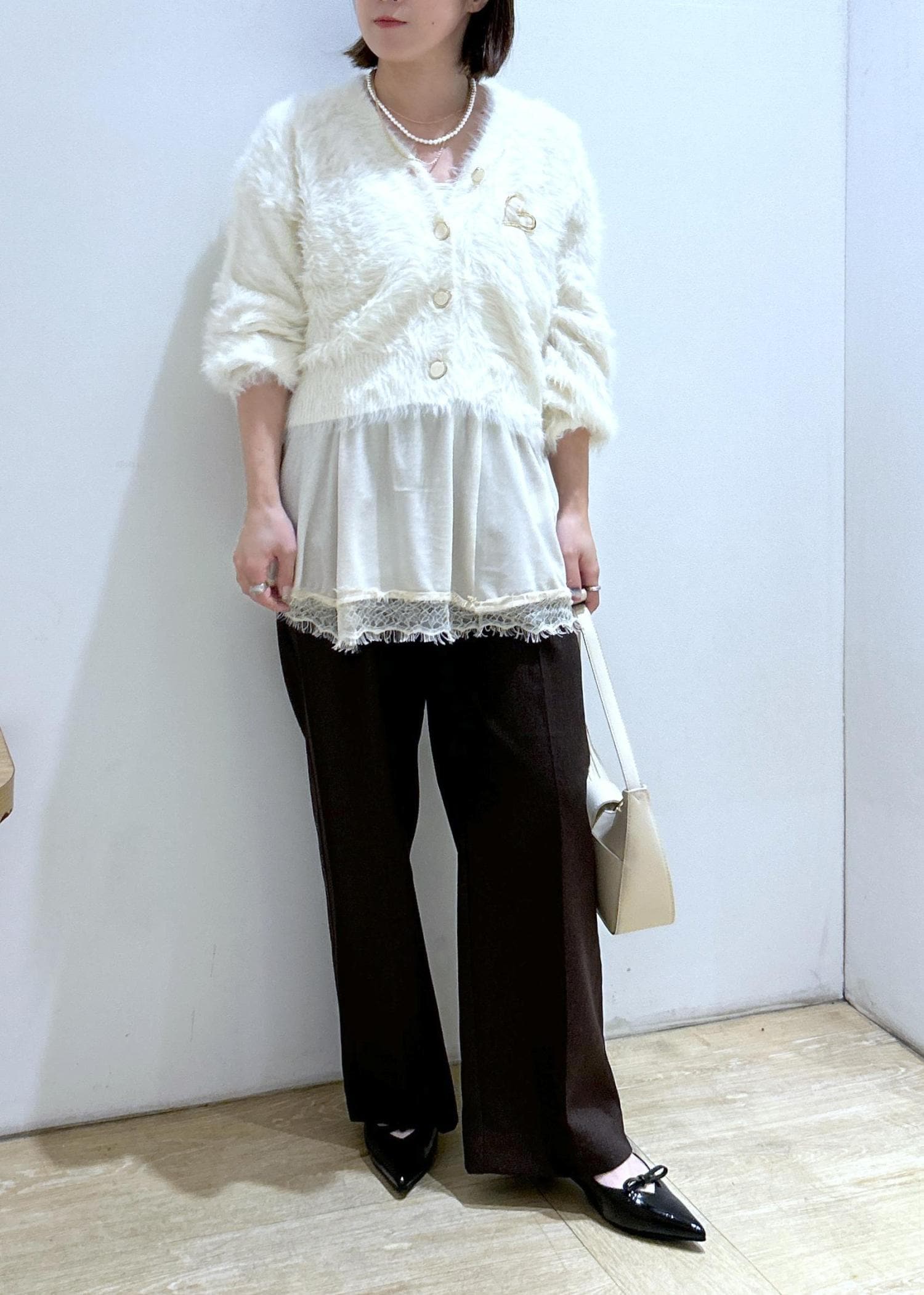 VISラビットファーVネックカーディガン/イージーケア・WEB限定カラーオフホワイト / F¥5,929レビューふわふわの手触りで暖かいです。分厚すぎないニットなので、アウターも羽織れます。丈は腰にかかるくらいで、袖丈は長めですが、リブで止まります。