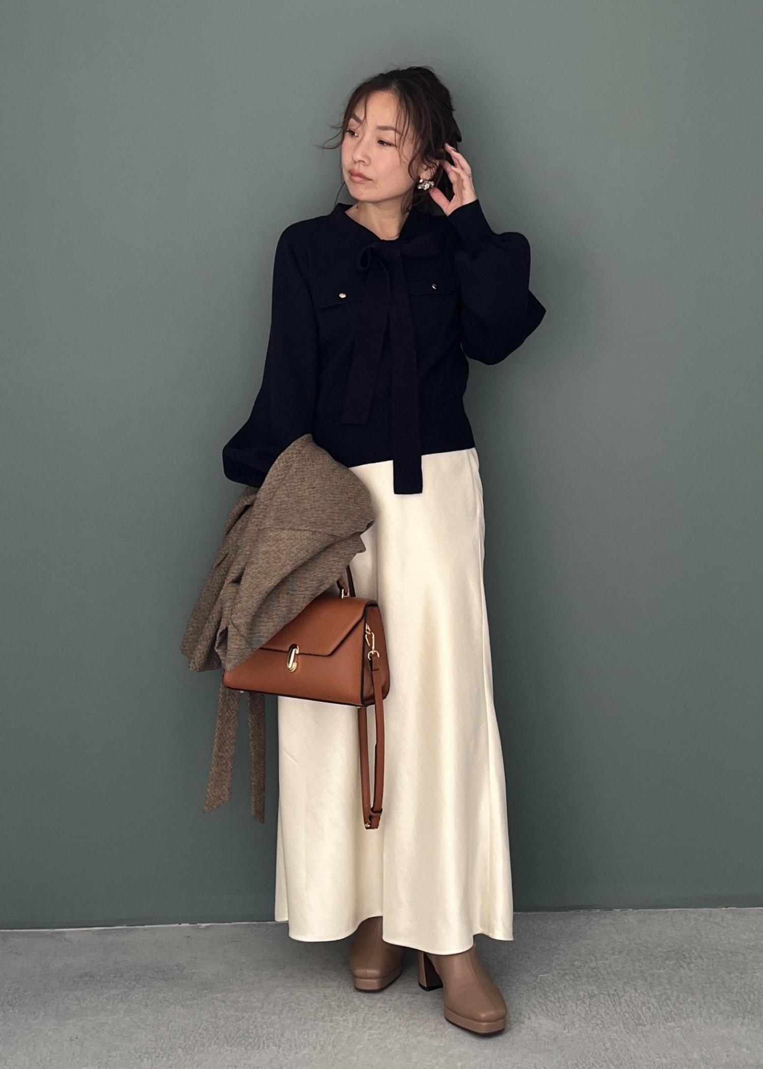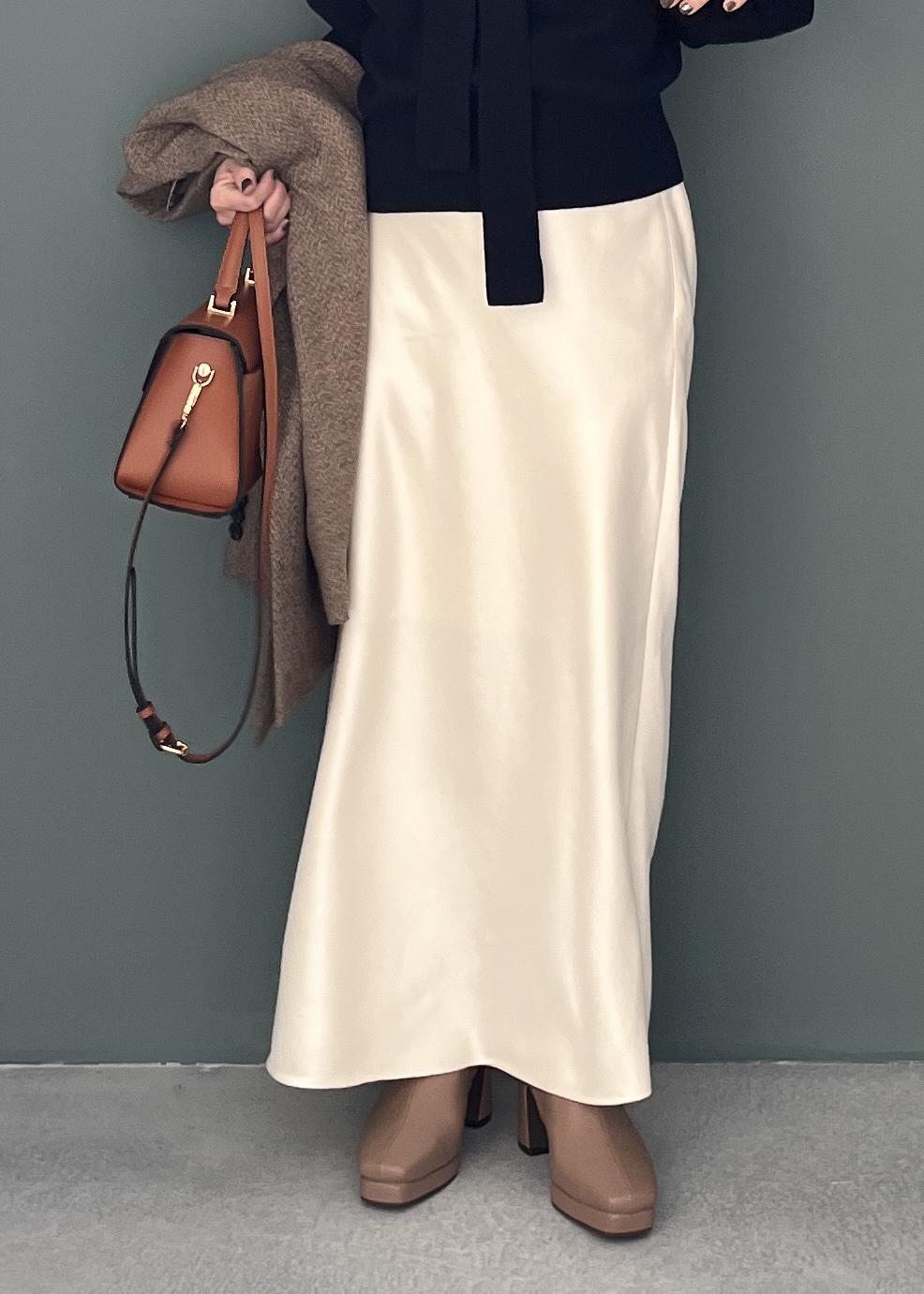 光沢のあるアイボリースカートが動くたびに上品に揺れて、全体を一気に女性らしく仕上げてくれます。