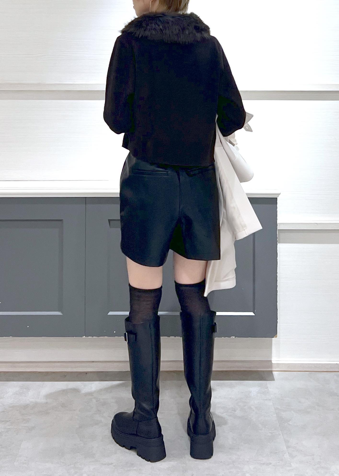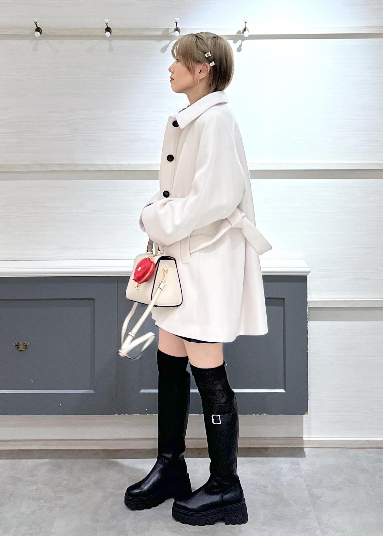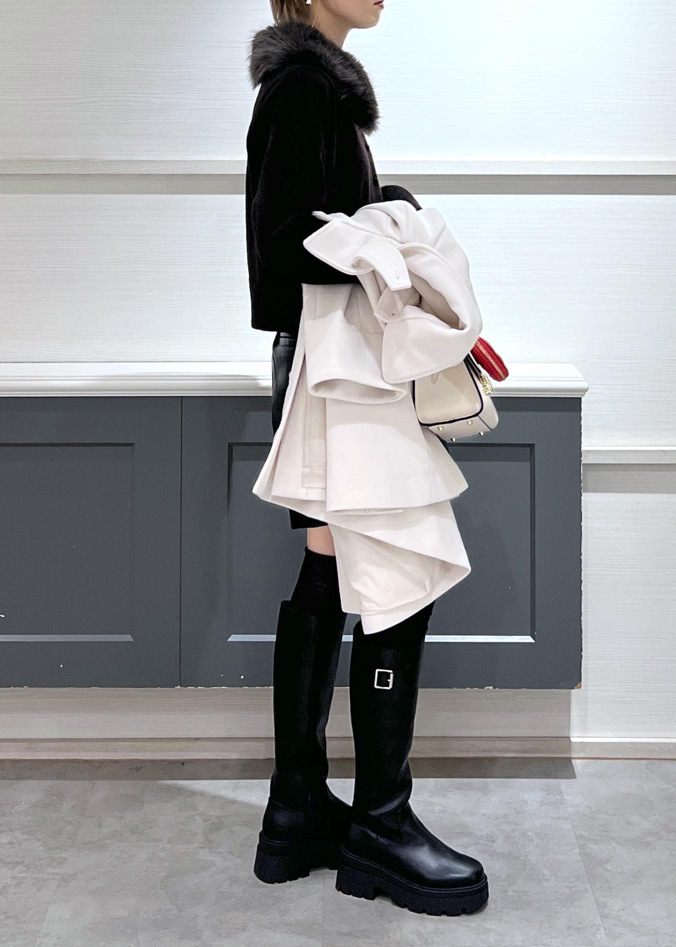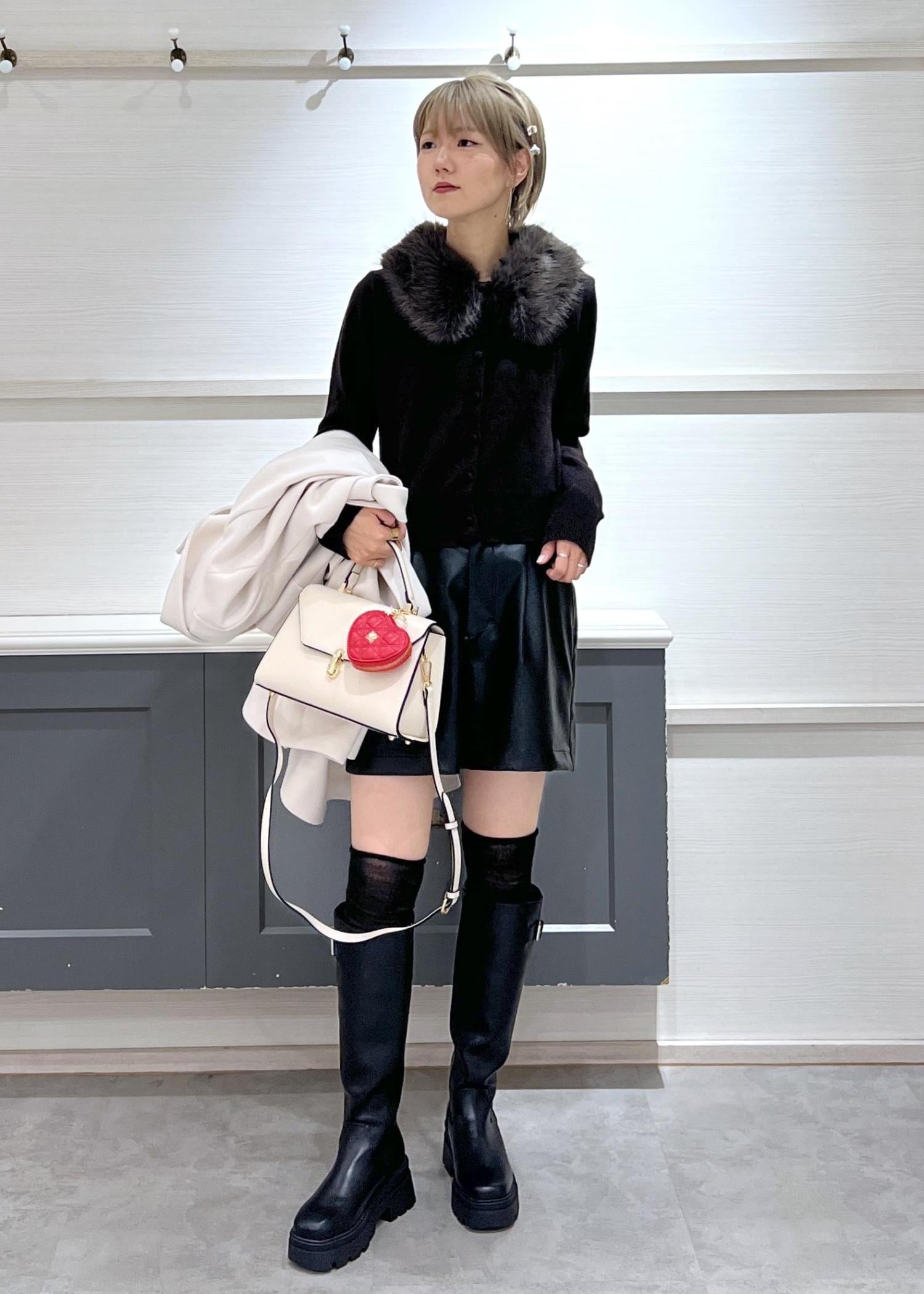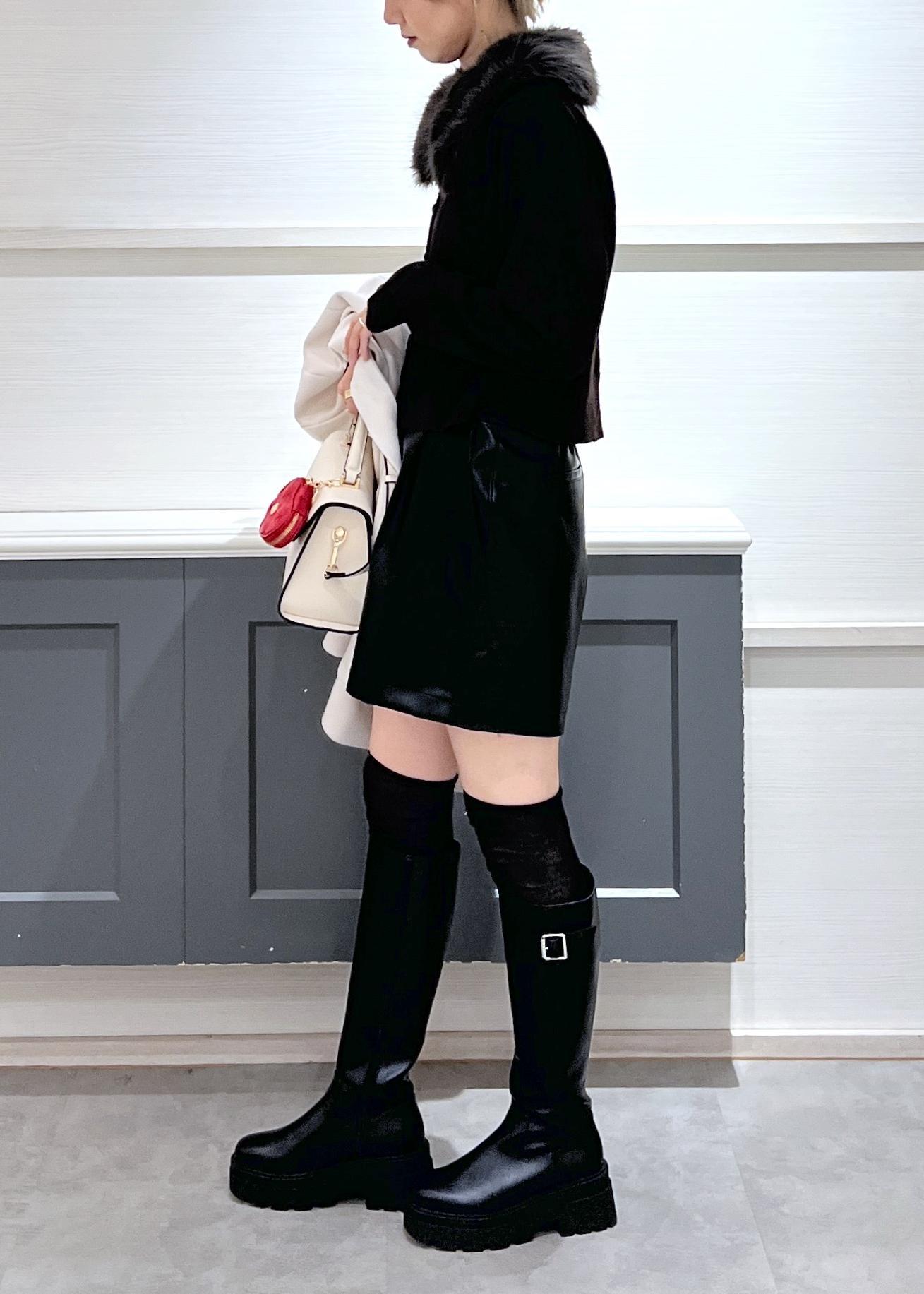 ミニ×ロングブーツの王道バランスで、美脚シルエットが際立つスタイル。