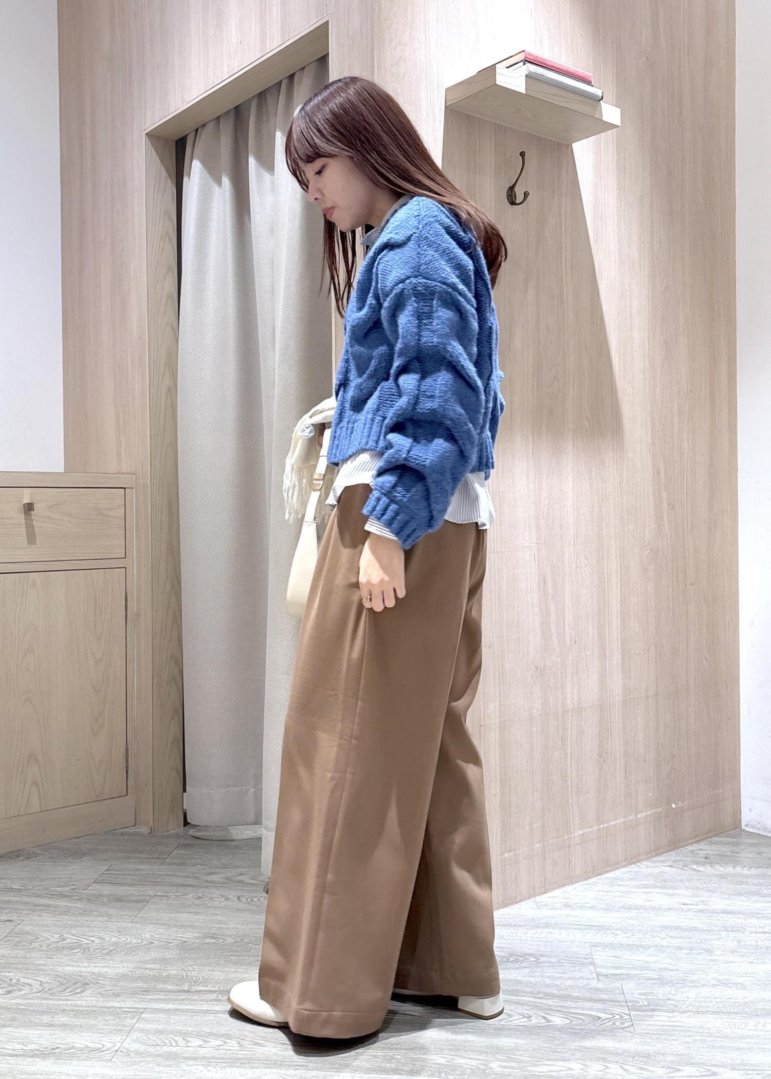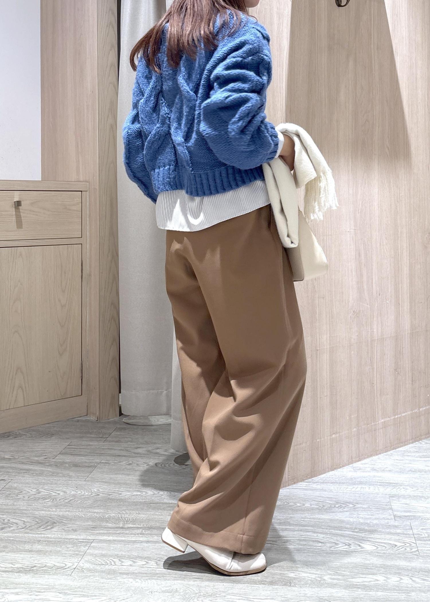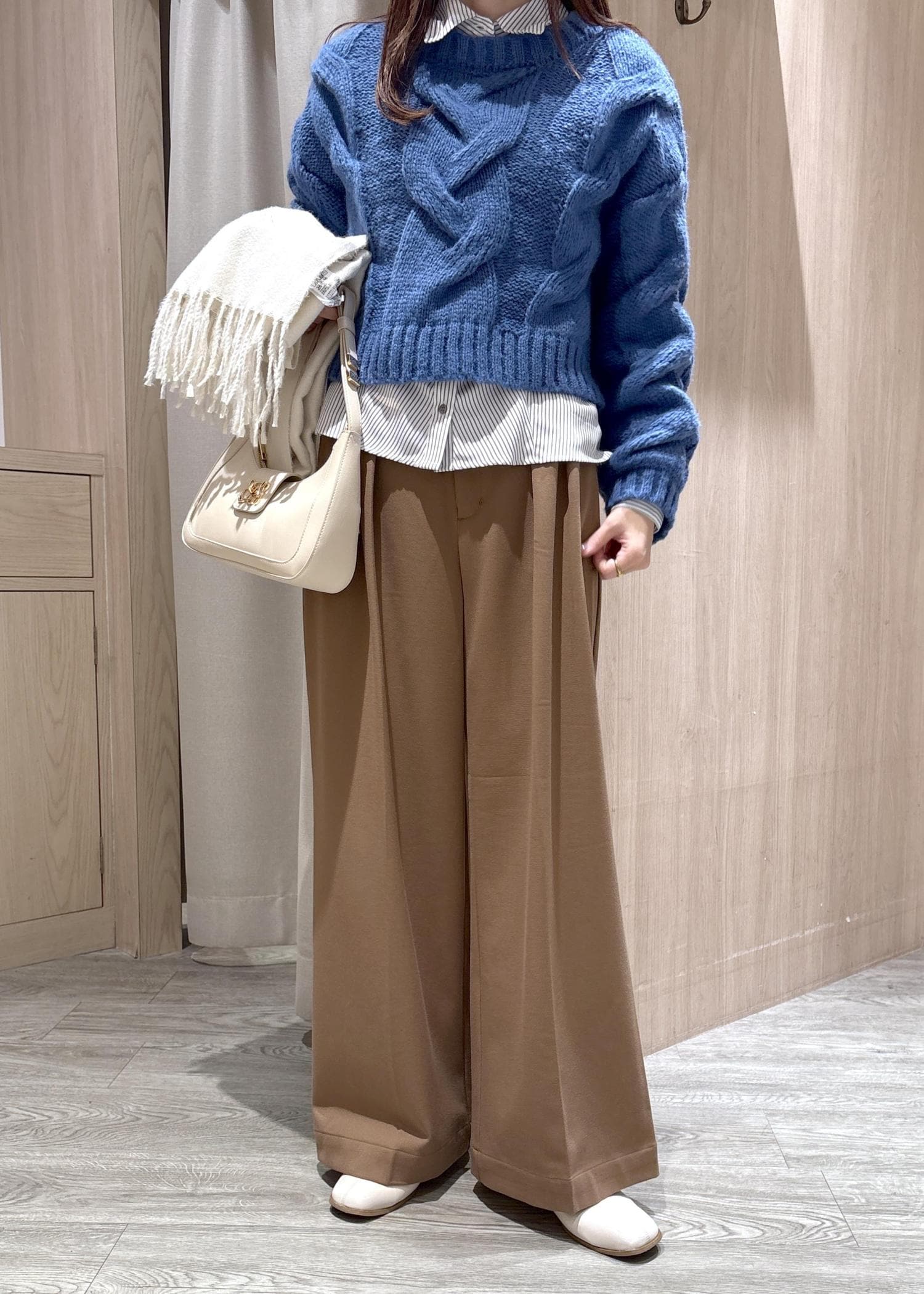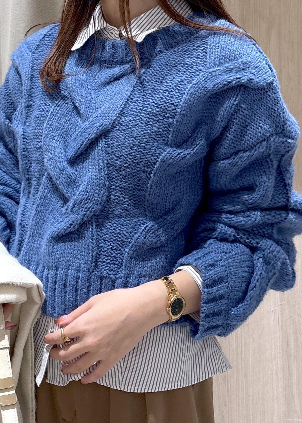 ブルーのニットはケーブル模様が可愛いく、全体的にボリュームがあるので1枚で主役になるアイテムです♪