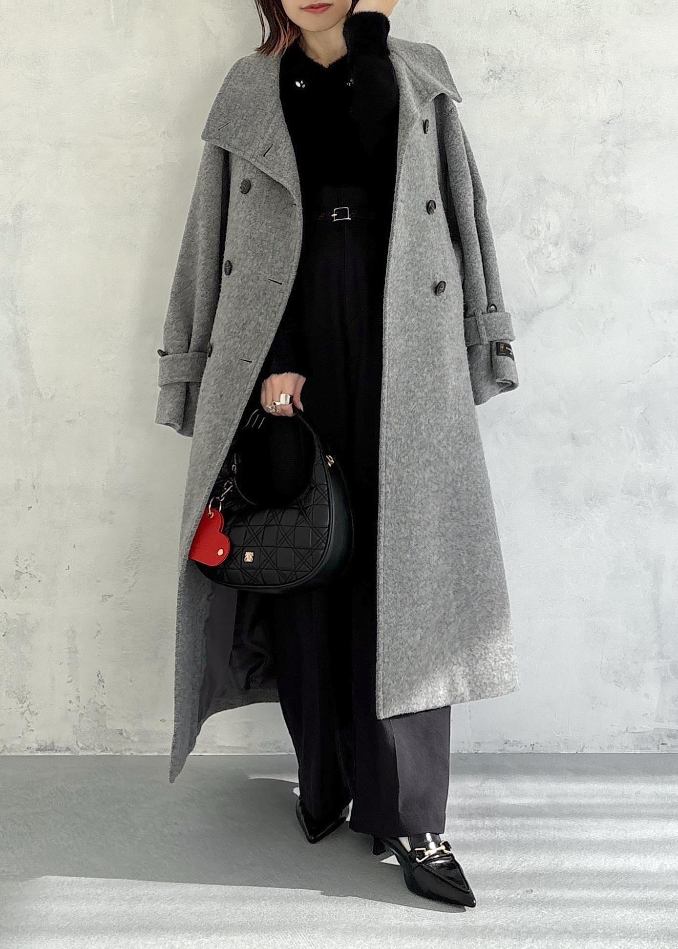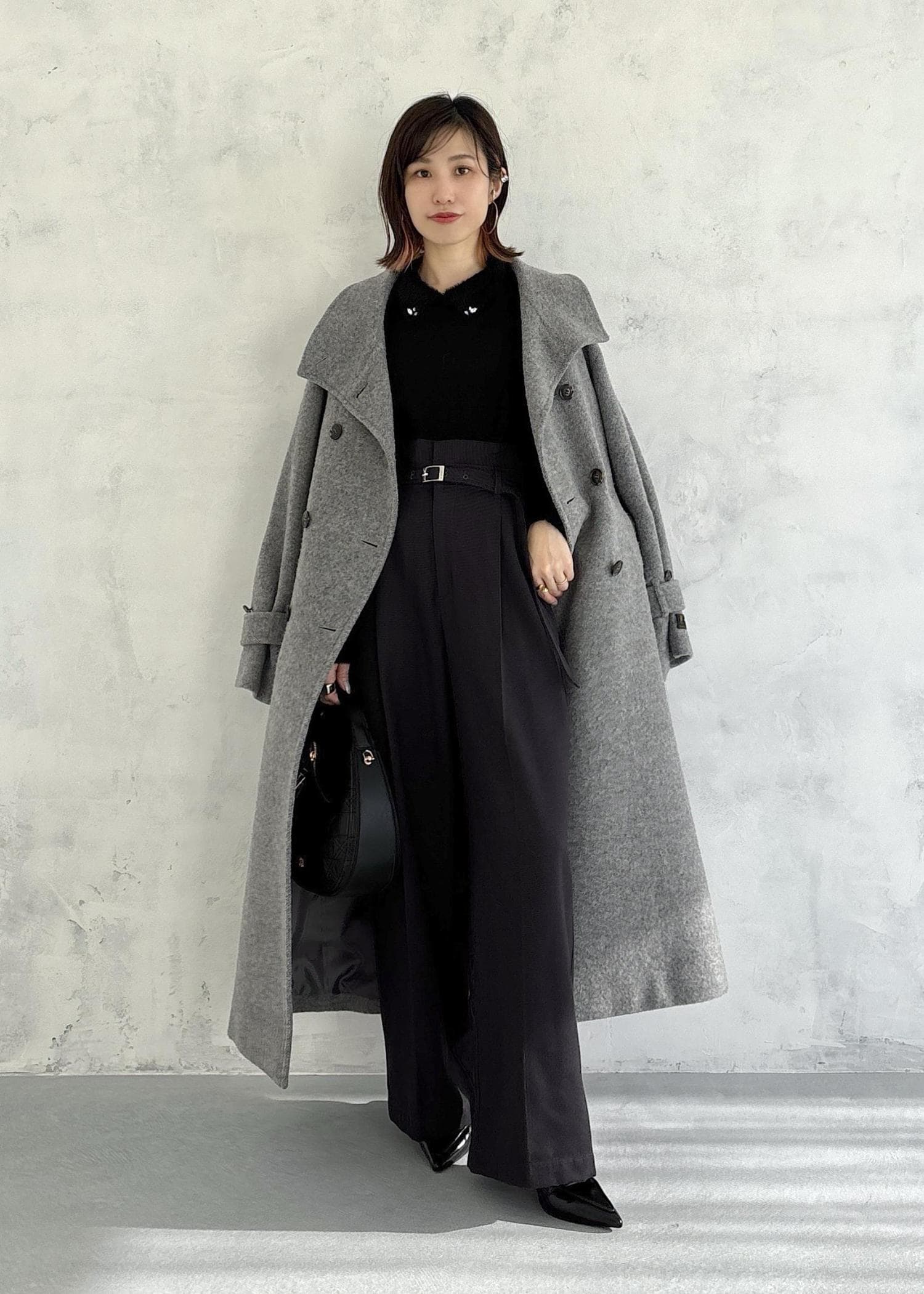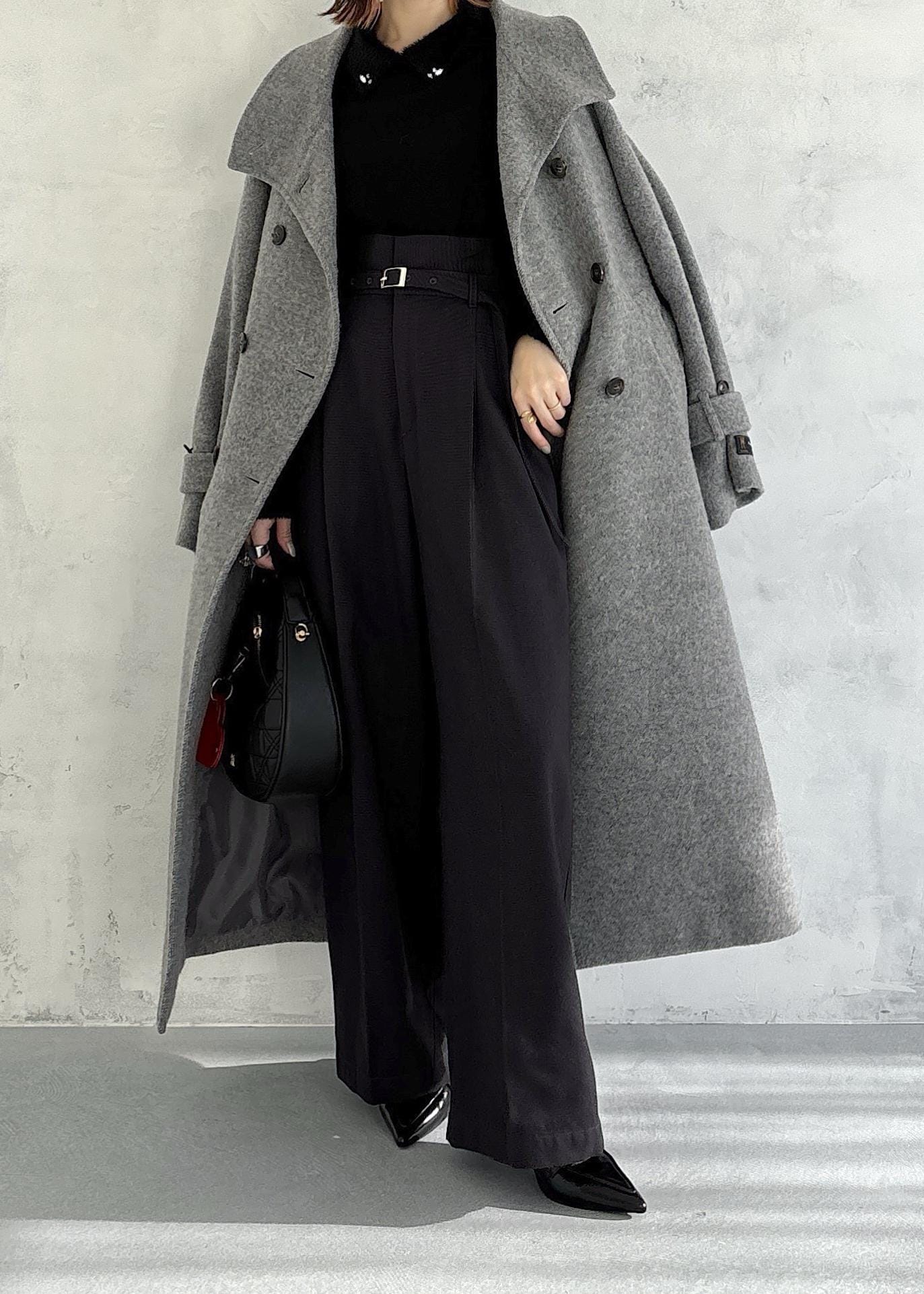 冬の人気コート、尾州ウールのロングコートは軽くて柔らかく、何より暖かくて冬欠かせないアイテムです♪今回はお仕事でキチンとした印象に見えるよう、ダークトーンでスッキリとしたニットとハイウエストのパンツでまとめました◎冬オススメのオフィスカジュアルコーデ。