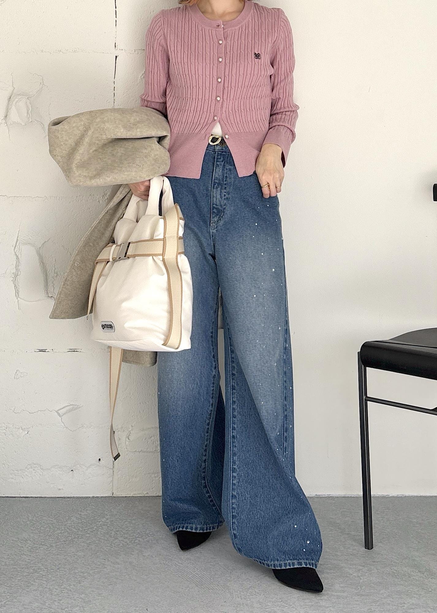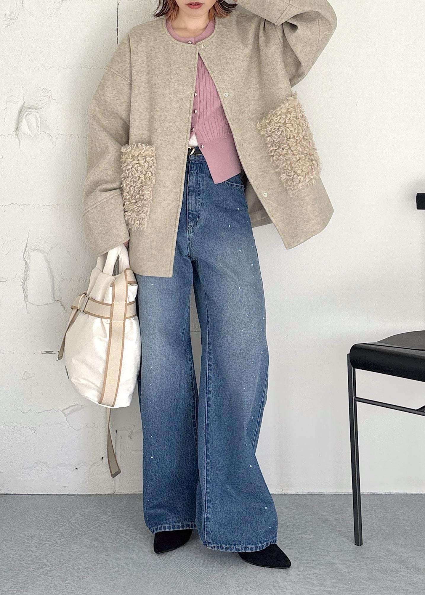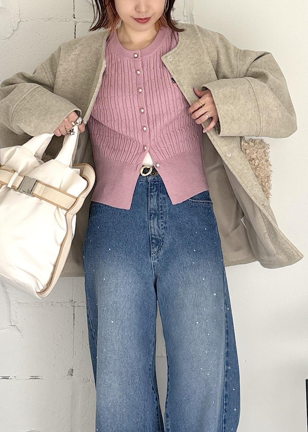 ふわふわボアのポケットが大人可愛いミドルコートをポイントに、ピンクのカーディガン、デニムとで合わせたカジュアルスタイル♪スッキリとしたノーカラーコートなので、中からちらっと見えるピンクをアクセントに、デニムコーデでも女性らしさをポイントにまとめました◎冬オススメの大人カジュアルコーデ。