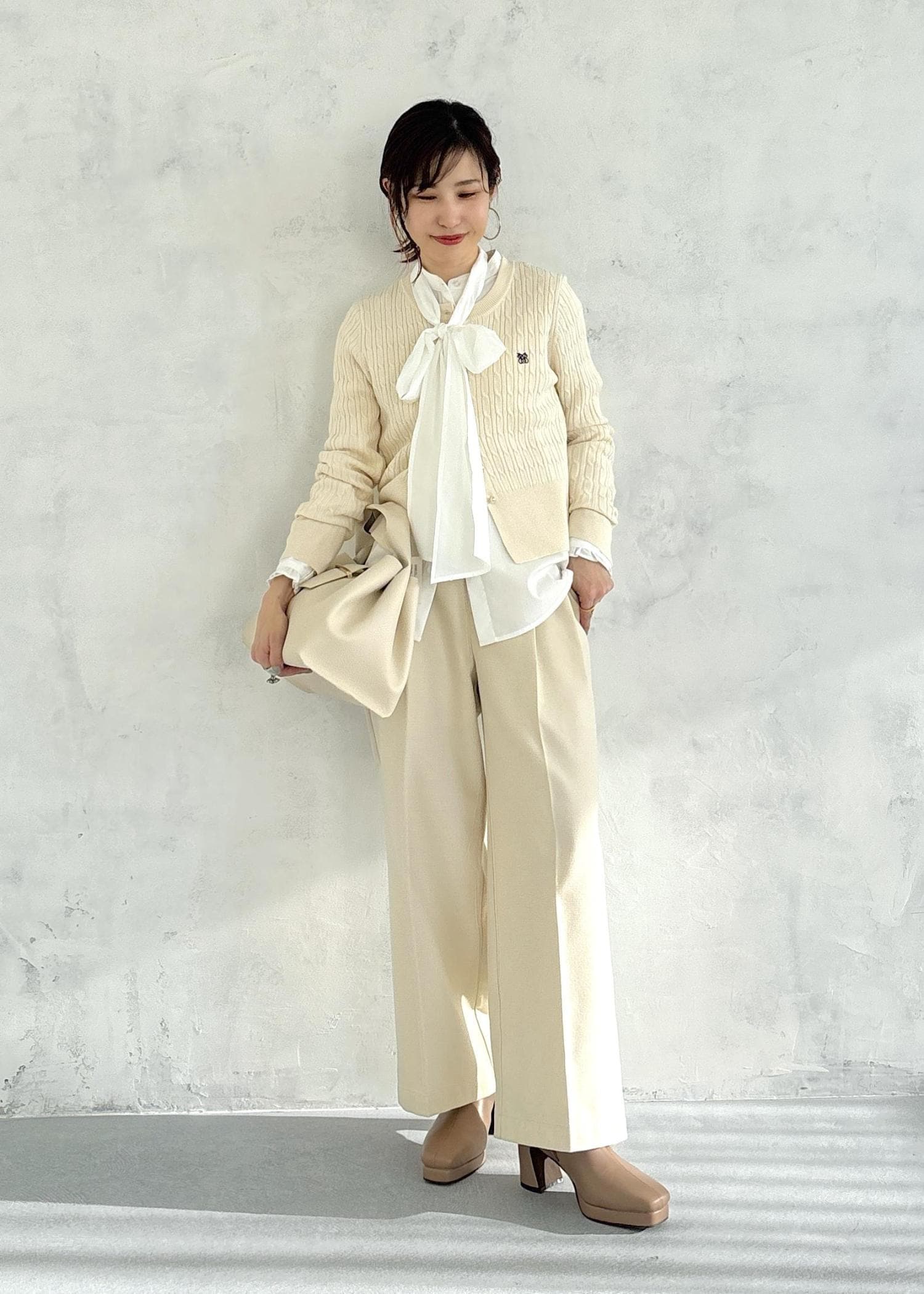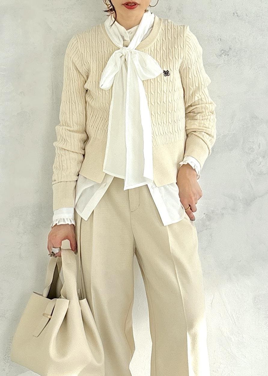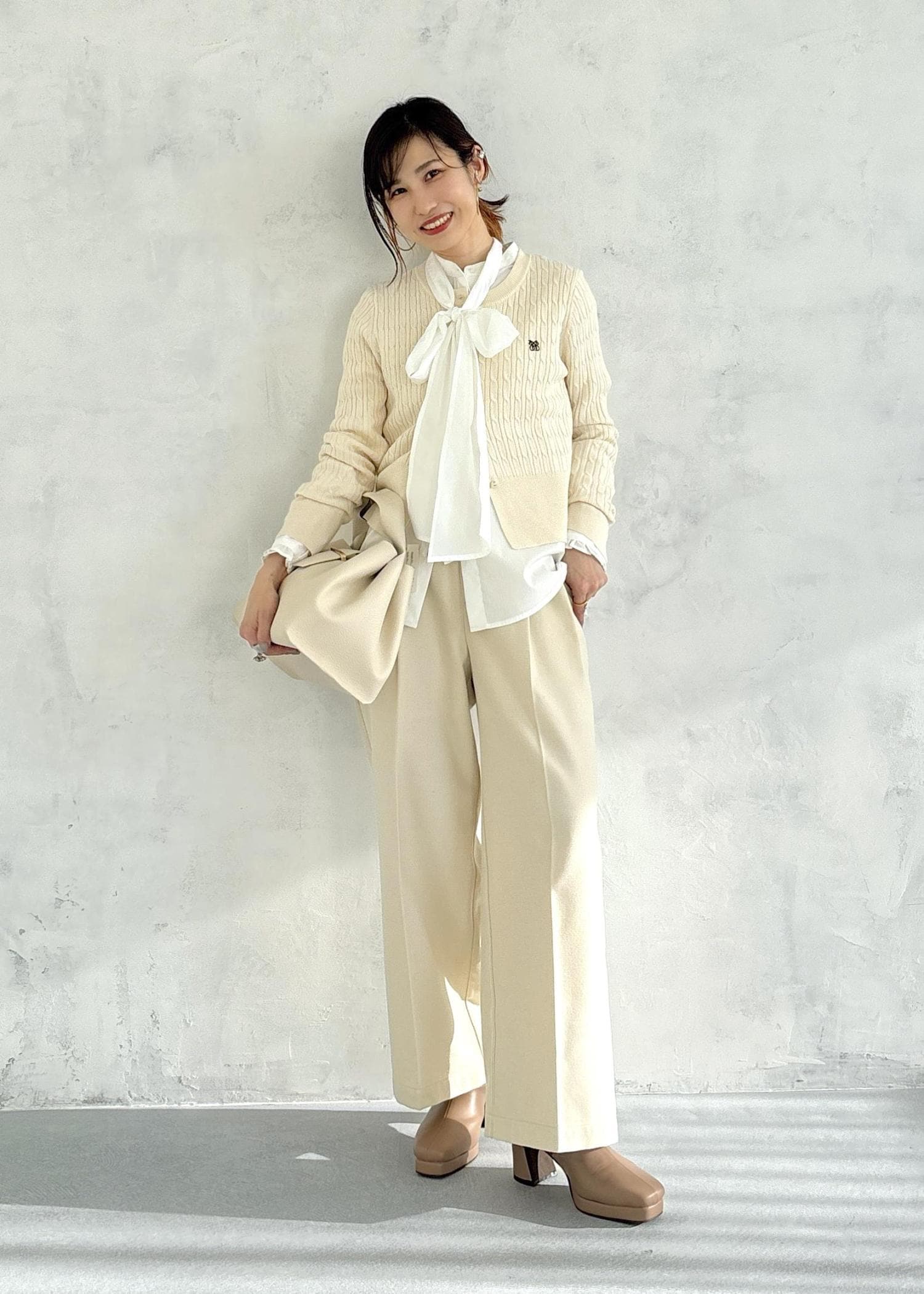 冬から春まで着れるホワイト系の淡色スタイル♪今年らしいボウタイブラウスにケーブルカーデ、ハイウエストのパンツとブーツでスタイルup見えをポイントに◎冬オススメの大人カジュアルコーデ。