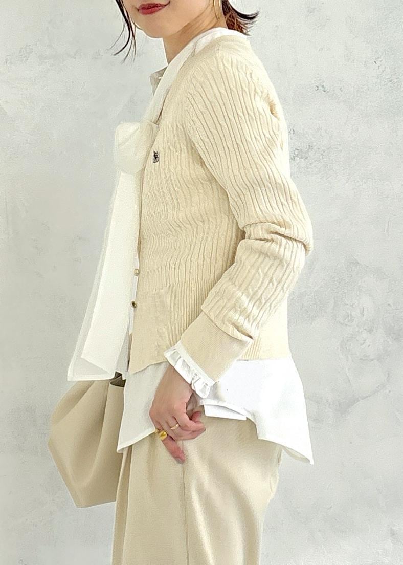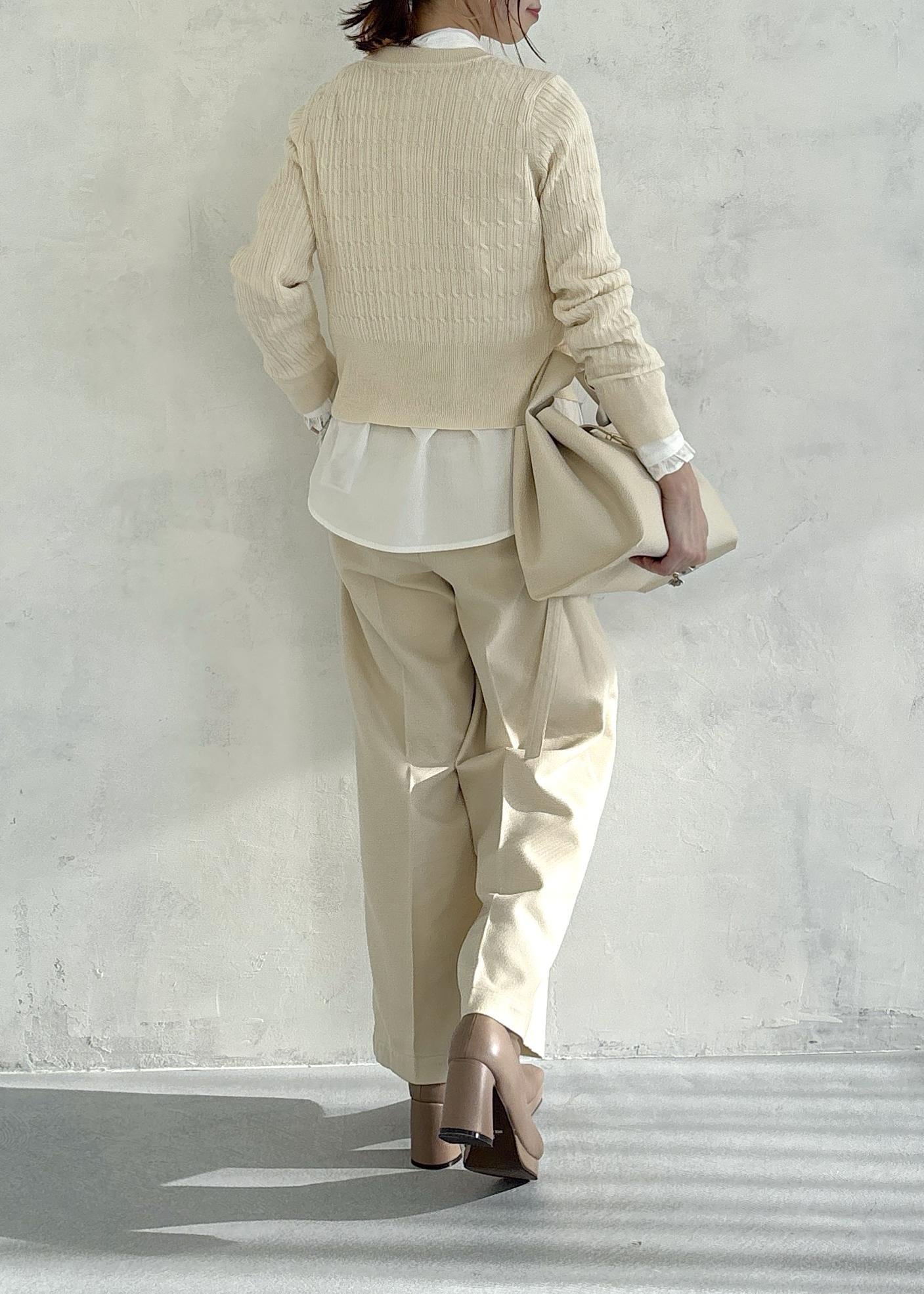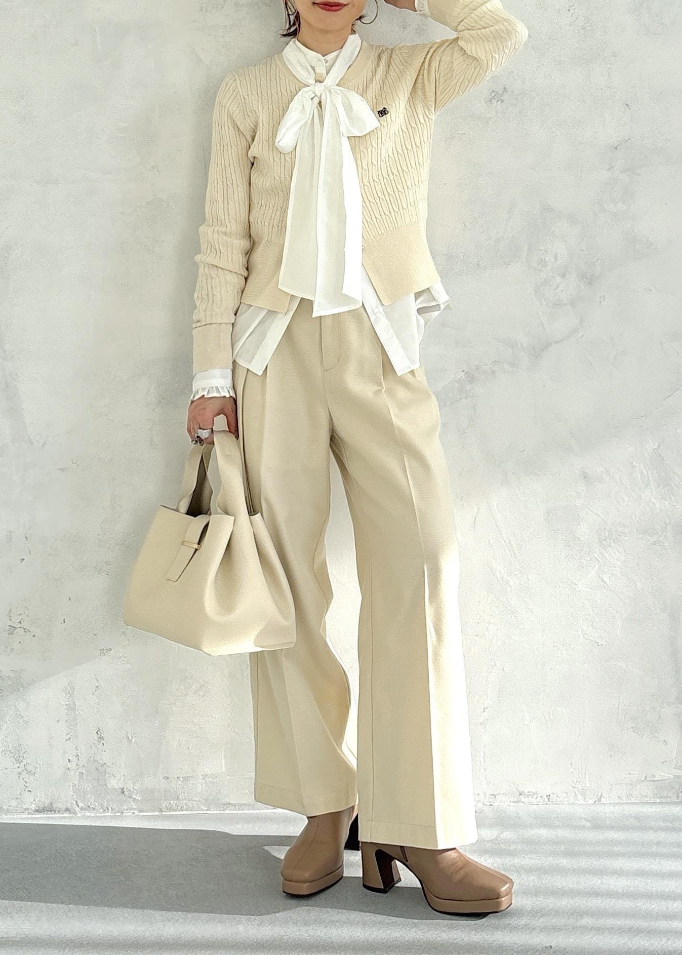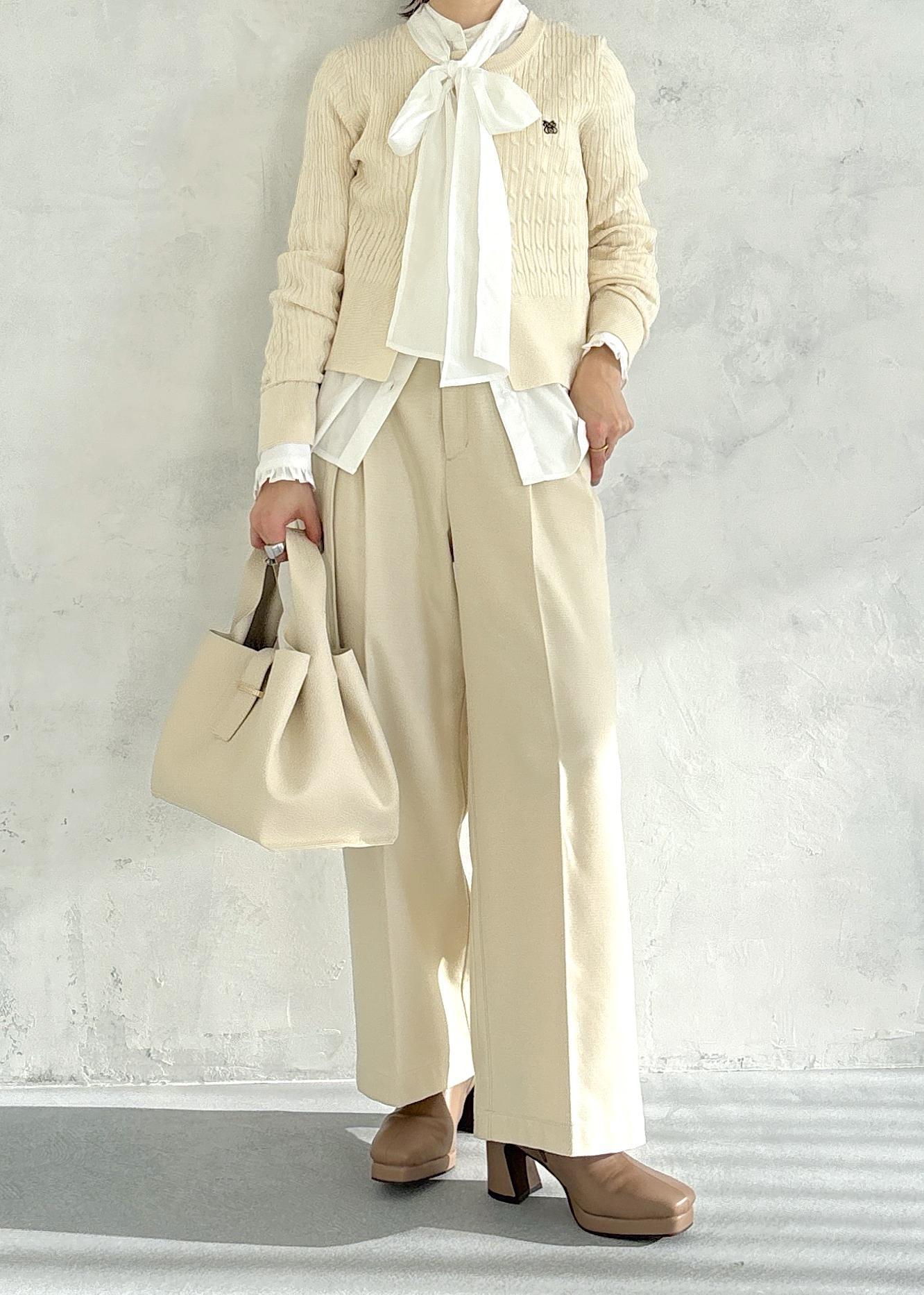 冬から春まで着れるホワイト系の淡色スタイル♪今年らしいボウタイブラウスにケーブルカーデ、ハイウエストのパンツとブーツでスタイルup見えをポイントに◎冬オススメの大人カジュアルコーデ。