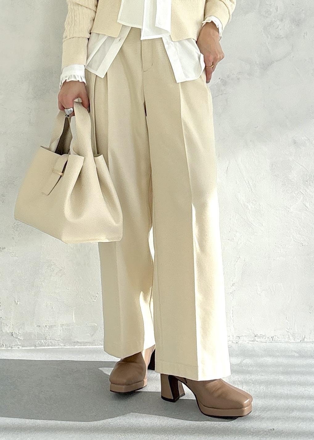 VIS起毛ウールライク版ベルトディテールタックワイドパンツキナリ / SS¥6,589レビュー季節を感じる起毛素材がさりげない、大人可愛いワイドパンツ♪ハイウエストデザインが脚長効果抜群で、スタイルupが叶う優秀パンツです。厚みは強くなく、優しい起毛の素材感が温かみのある印象◎154cmでSSサイズ着用、全体的に程よくゆとりがあり、着丈は足首が少しだけ見える長さでした。