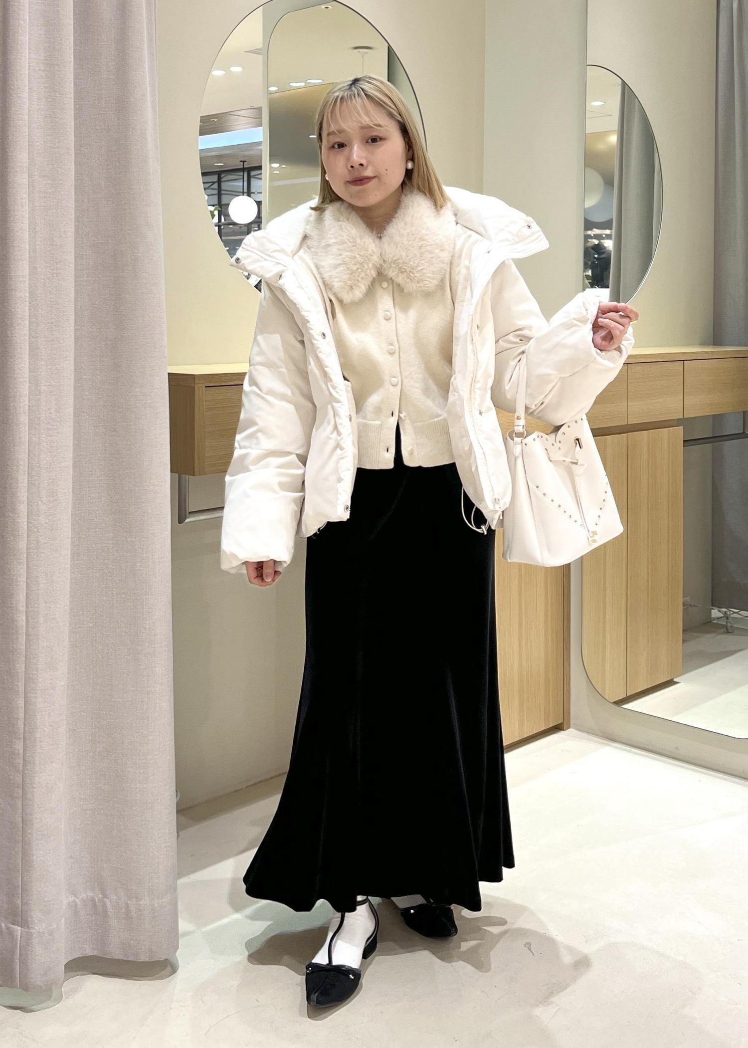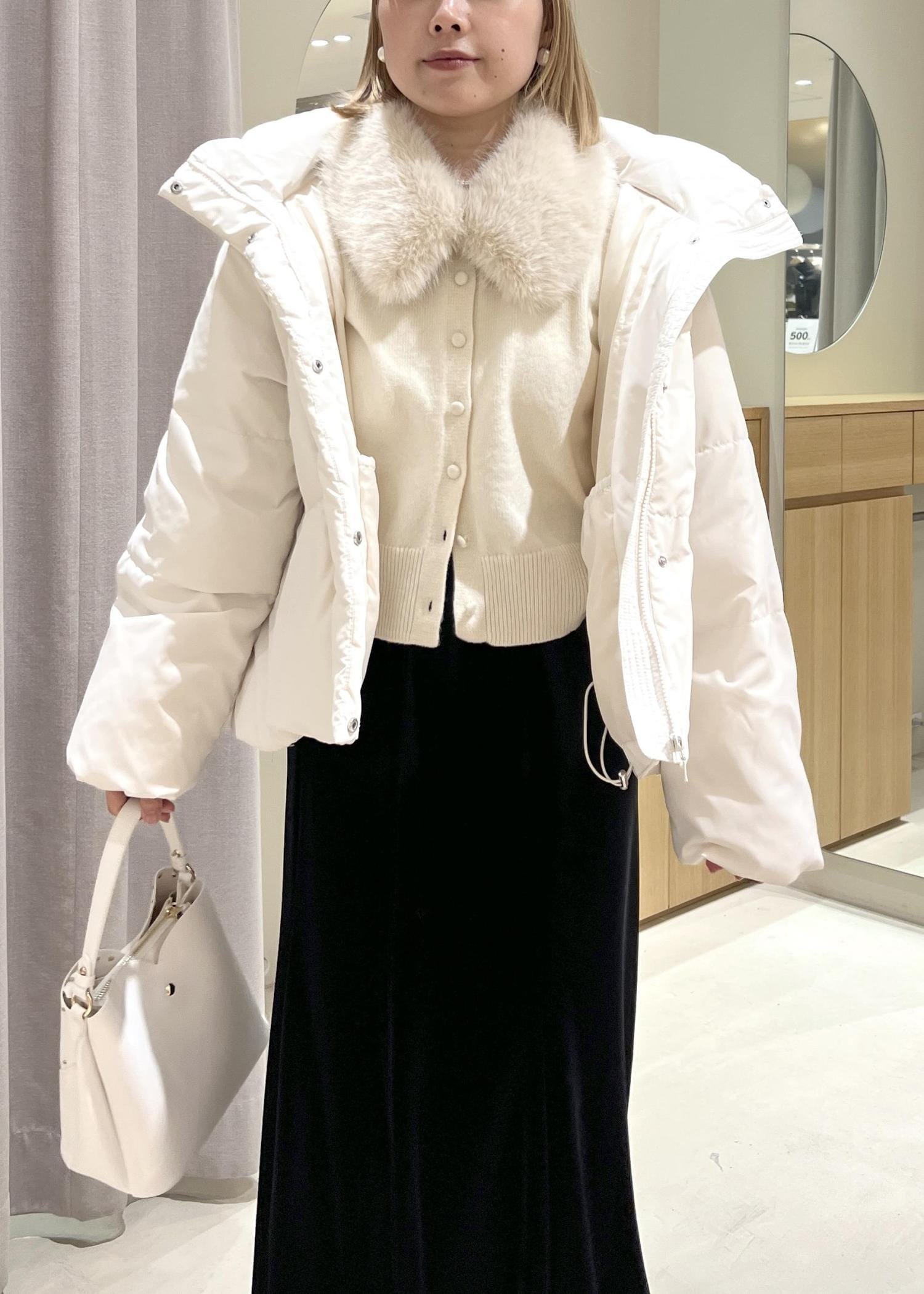 ホワイト×ブラックでまとめた、綺麗め冬コーデにしてみました!ダウンで暖かさを保ち、中のコーデはすっきりとした綺麗めコーデにしてみました!