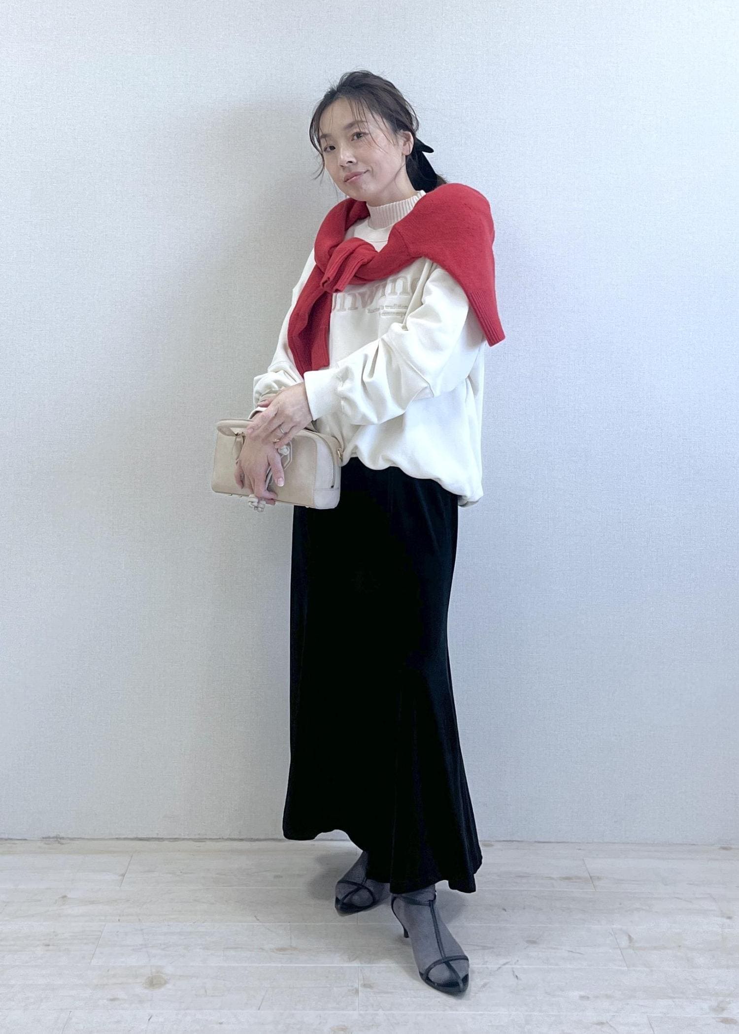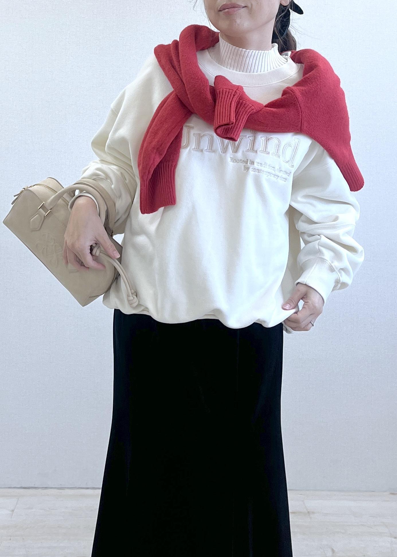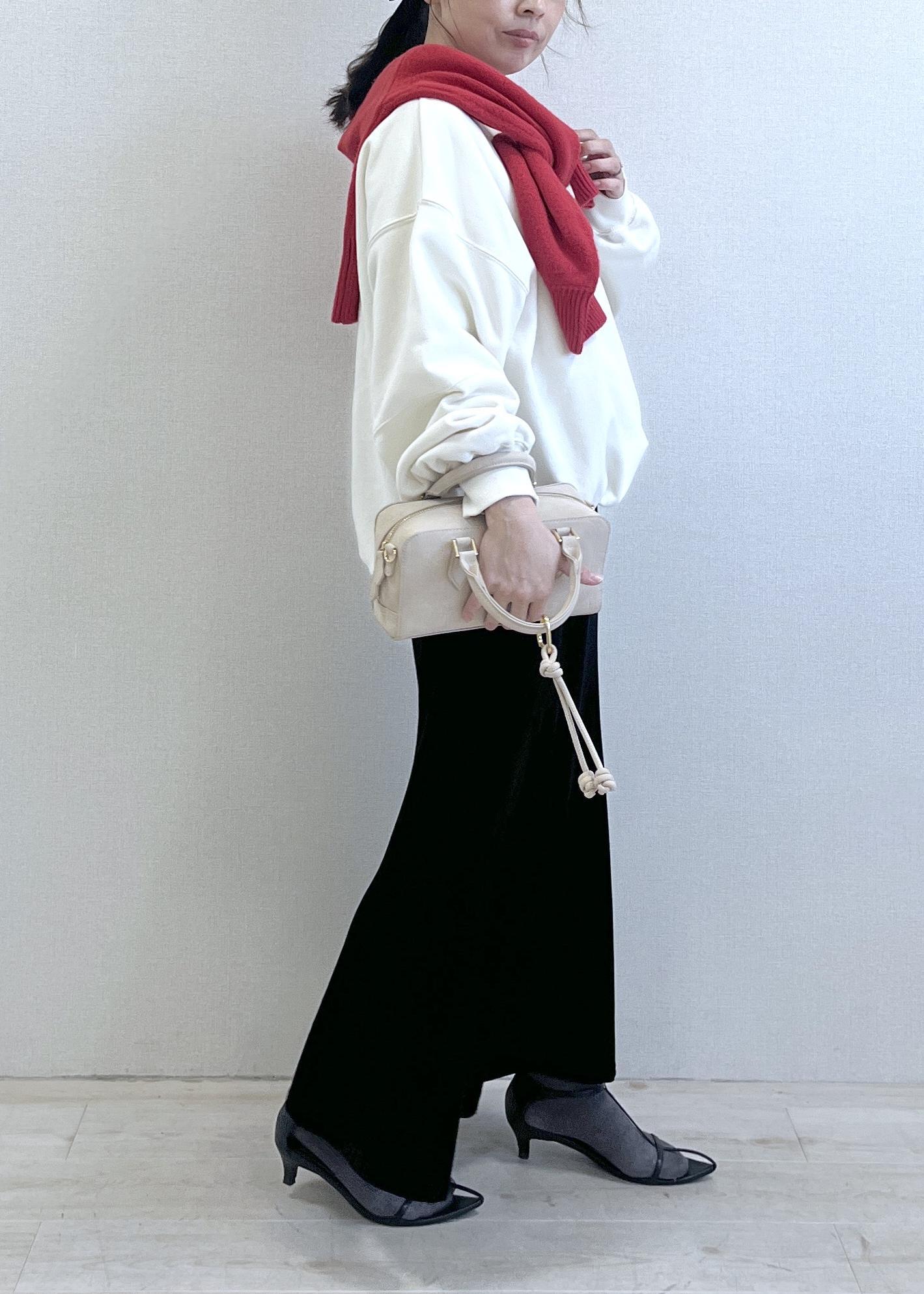 白スウェットを大人スタイルに、レッド差しの華やぎコーデ