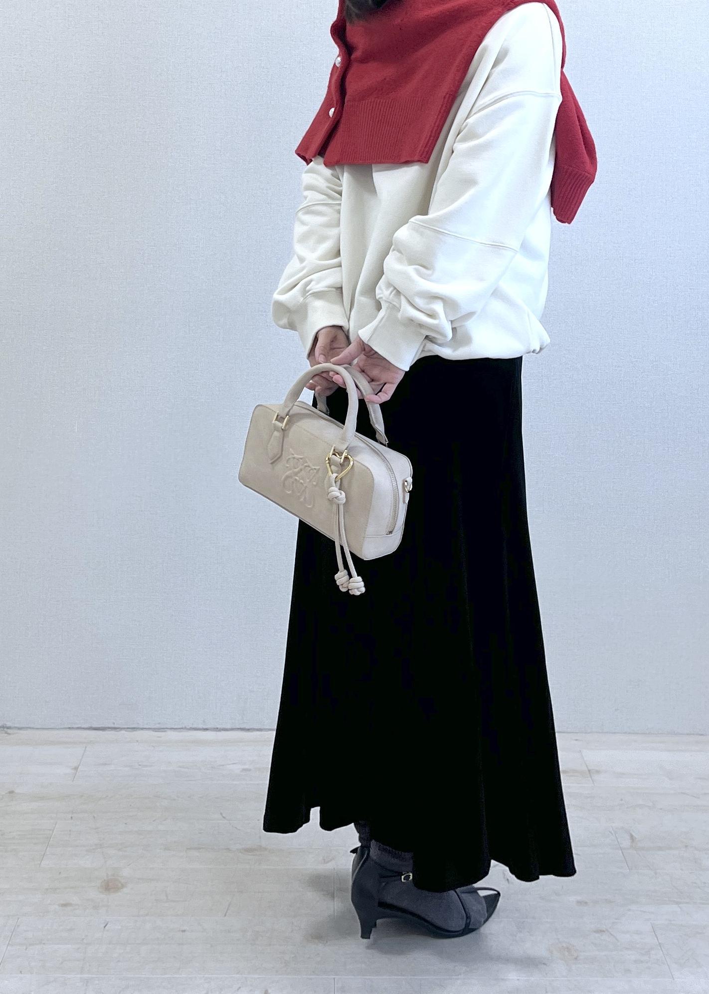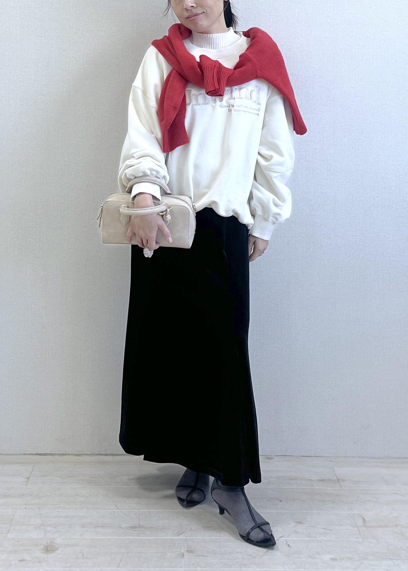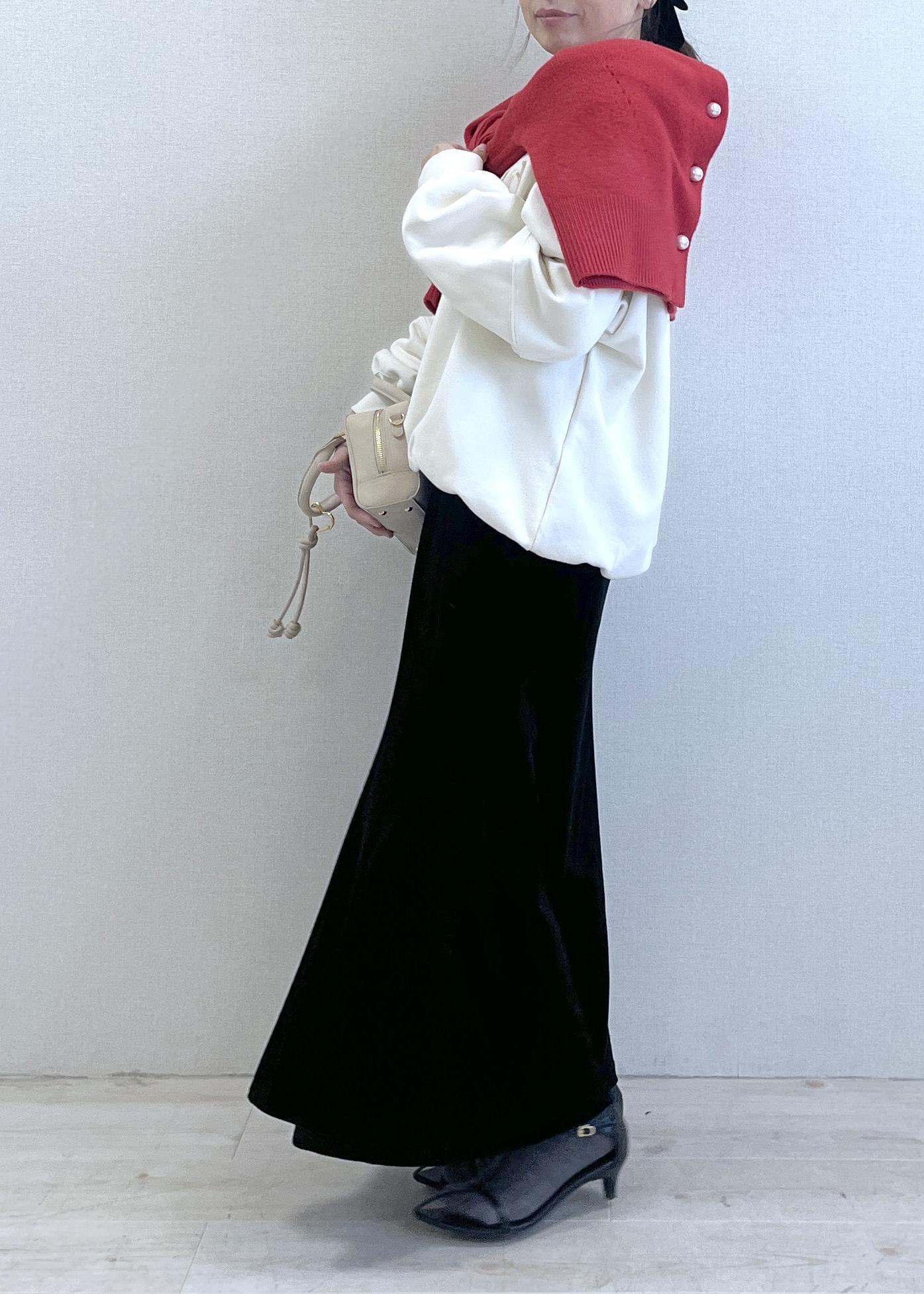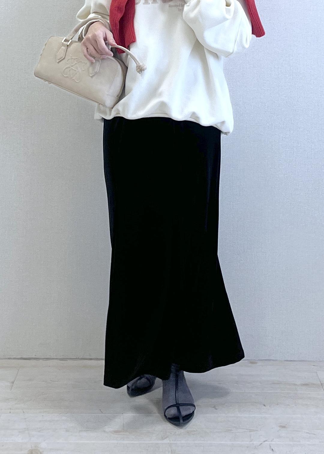 ボトムはブラックのフレアスカートで、縦のラインがすっときれいに出る大人シルエット。