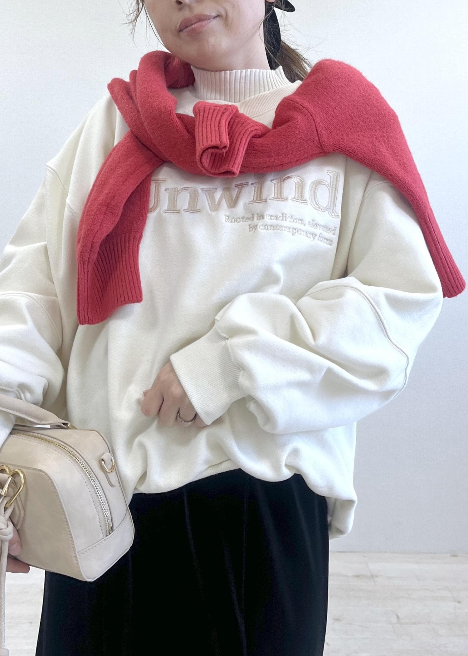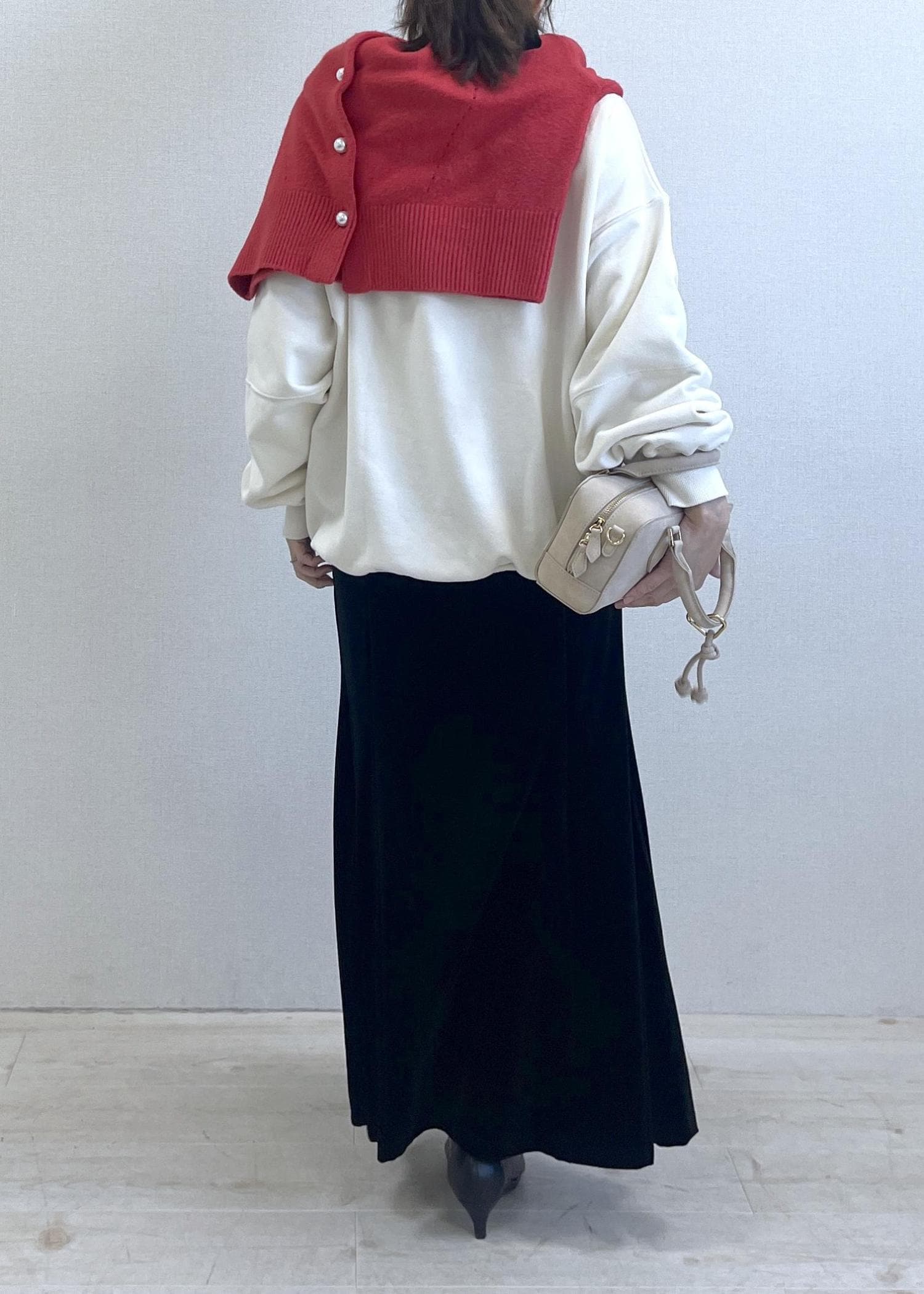 肩にかけた赤ニットが、冬の装いに鮮やかなアクセントを添えてくれます。