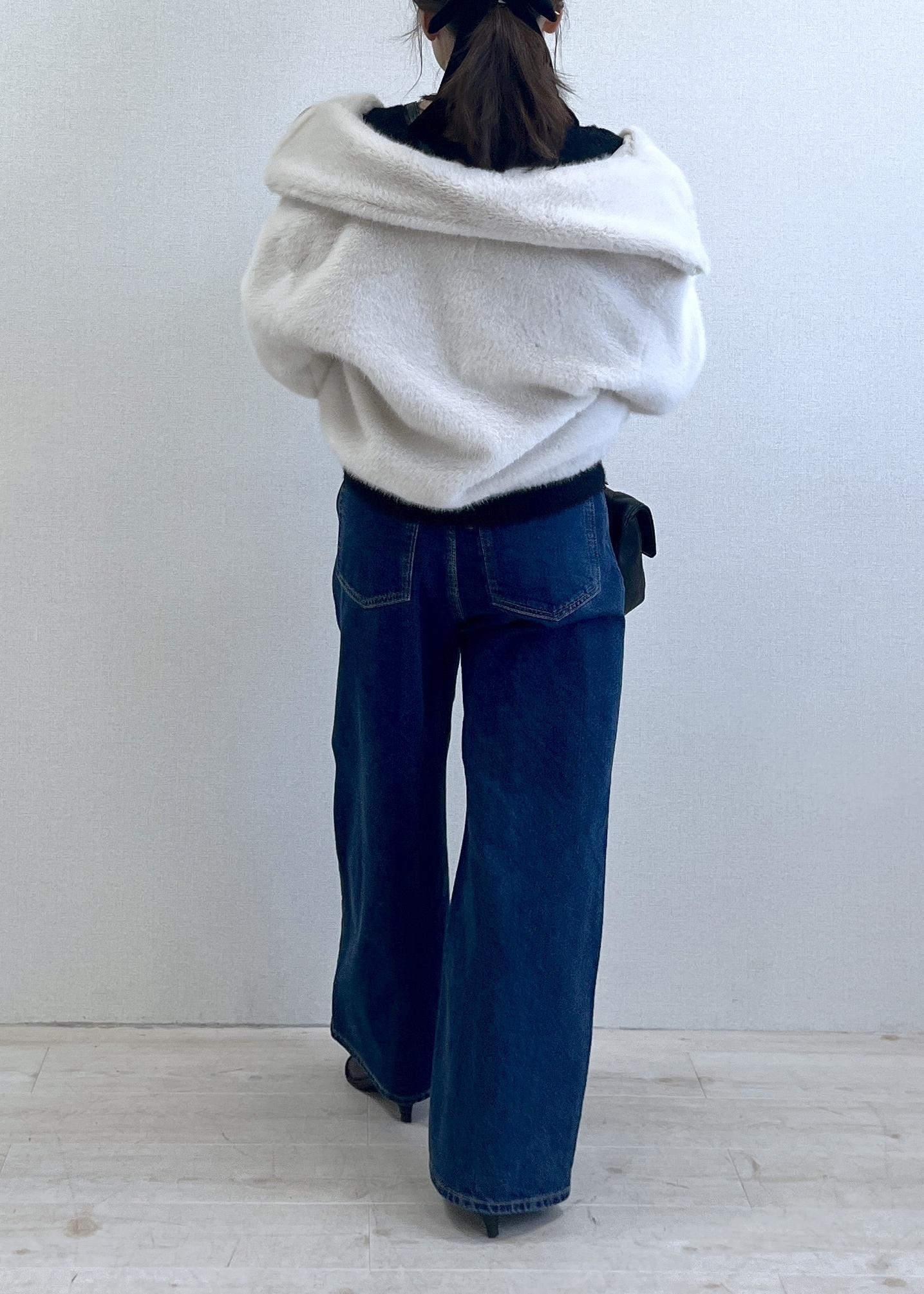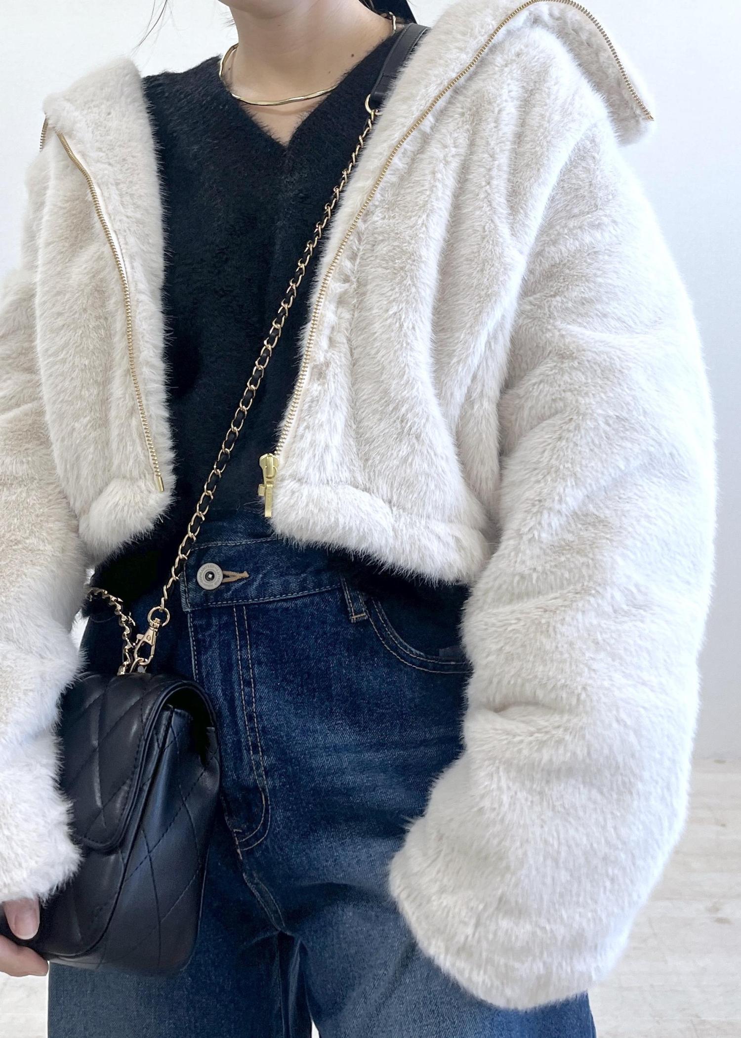 冬らしい“ふわもこ”質感がかわいいホワイトアウターを、あえて軽く肩落としで着て抜け感をプラス。