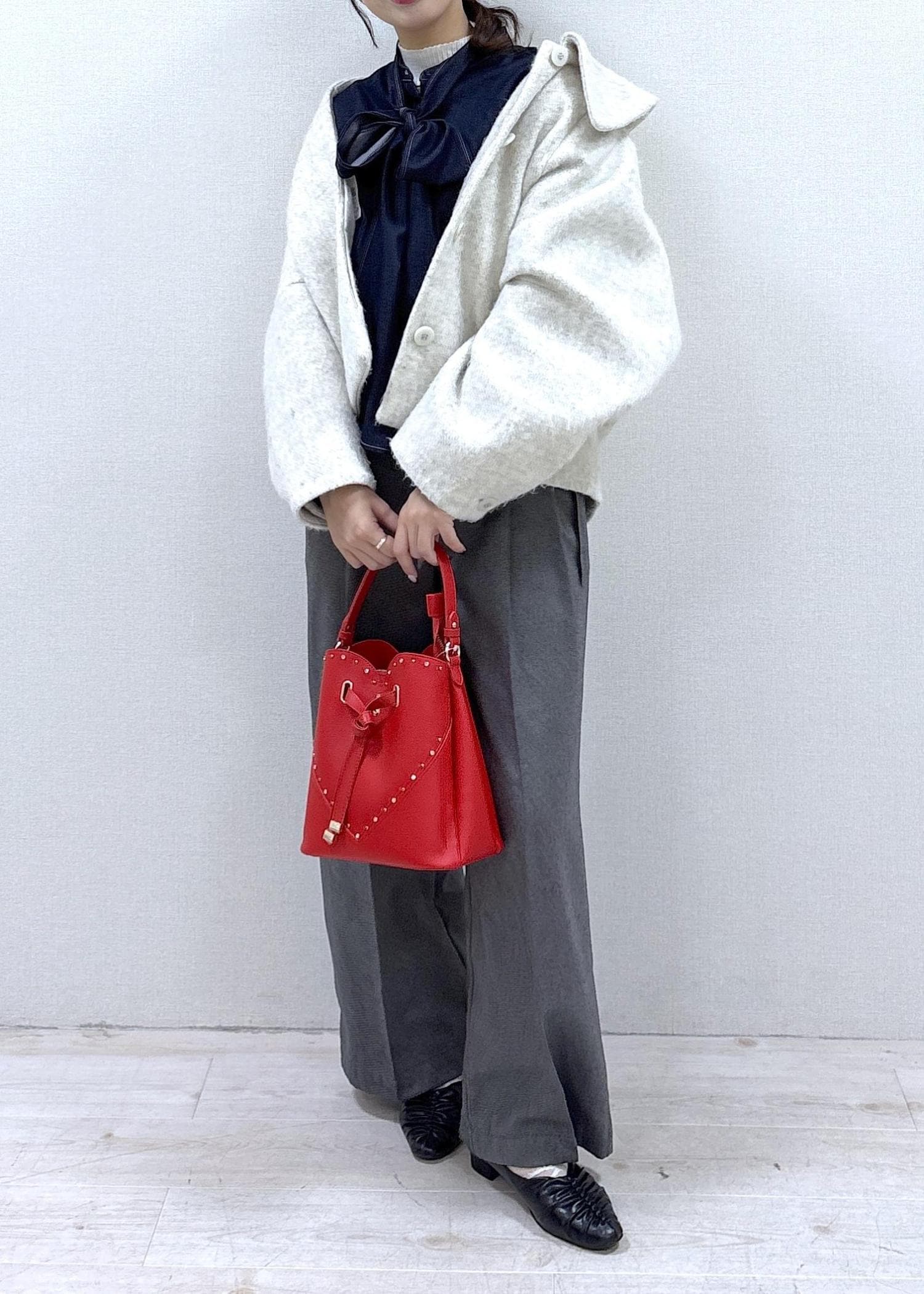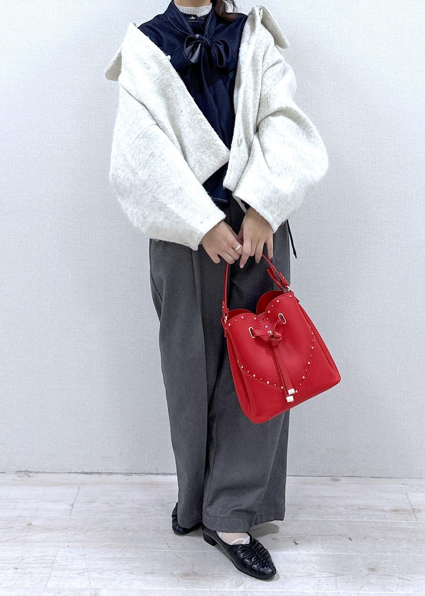 鮮やかなレッドなのでモノトーンで落ち着きがちな冬のコーデによく映えます♡