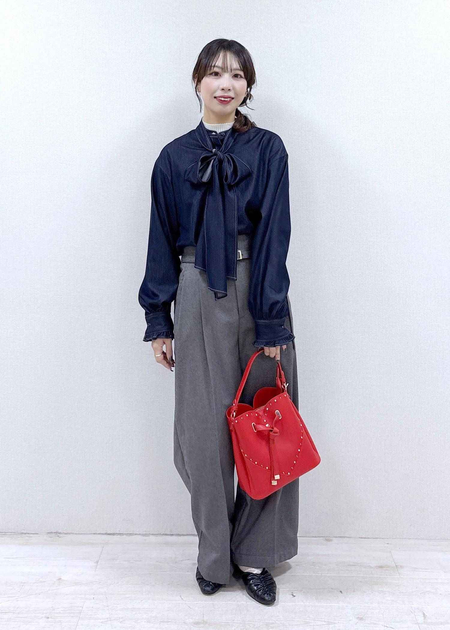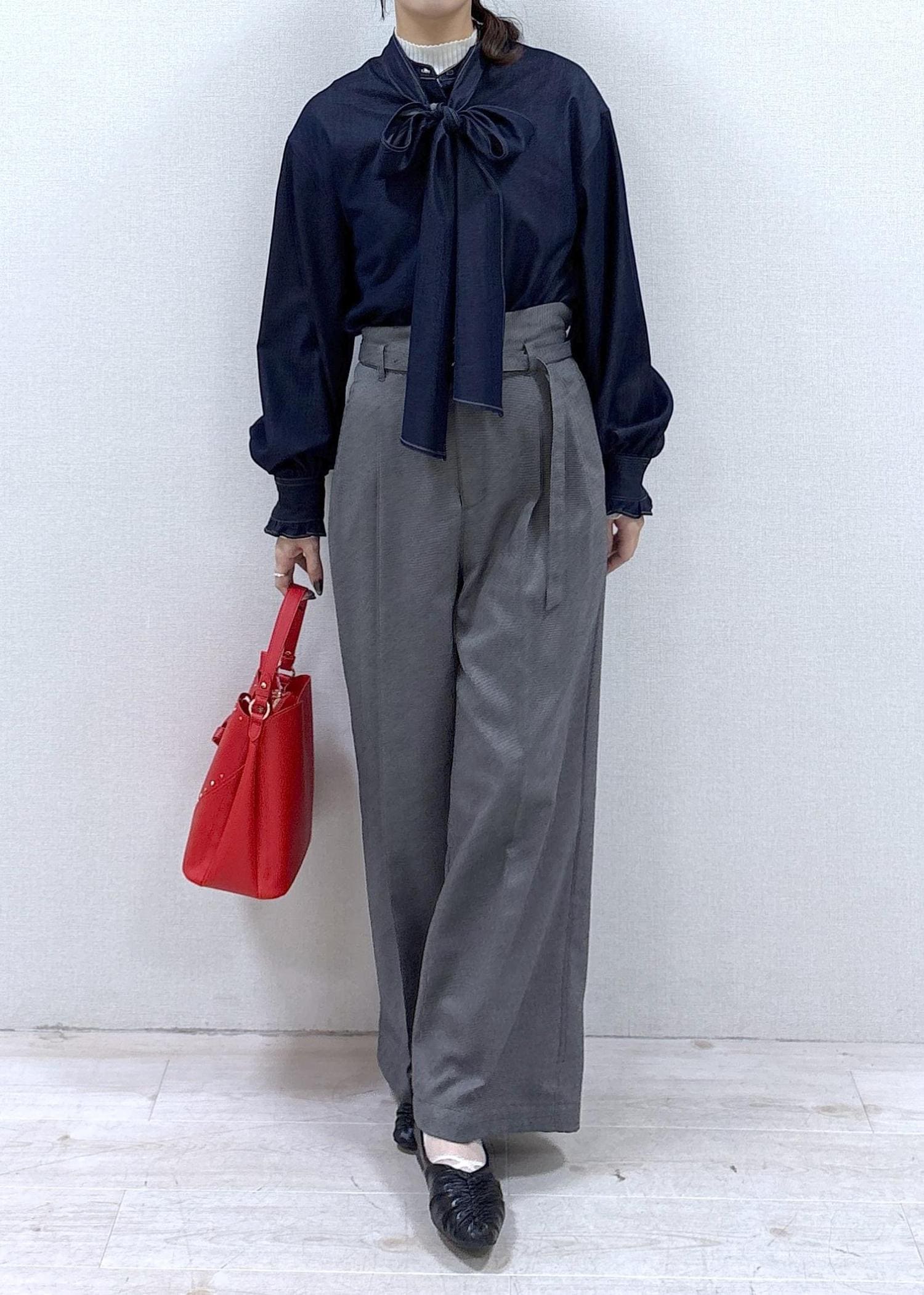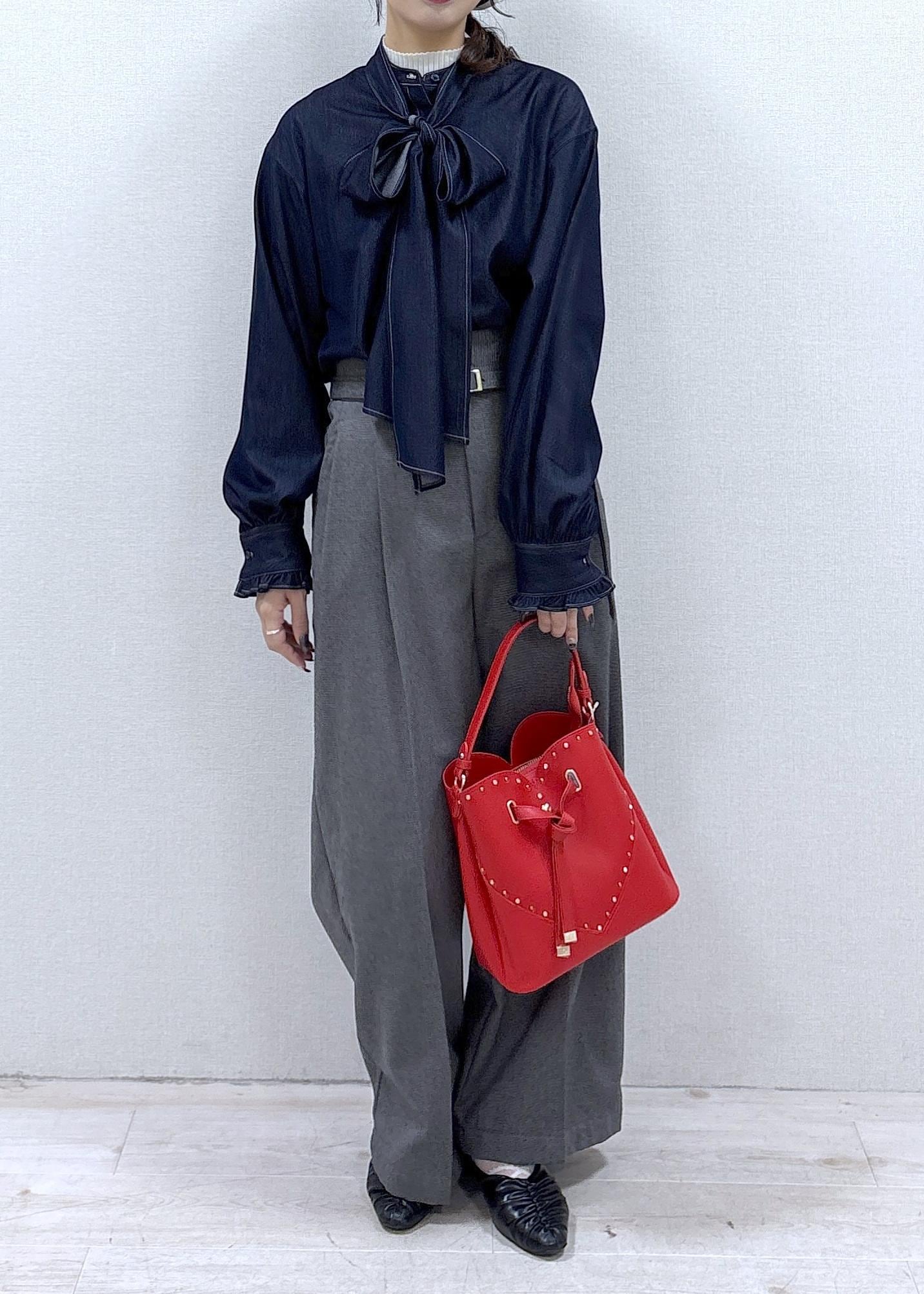VISチェック&デニムアソートボウタイリボン付きスタンドカラーシャツネイビー系 / F¥6,589レビューボリュームスリーブが華やかで可愛いので、一枚で着映えします!上にセーターやビスチェなどを重ねても可愛いです!私は袖のデザインを見せたいので中にハイネックのニットを重ねたレイヤードスタイルが推しです!