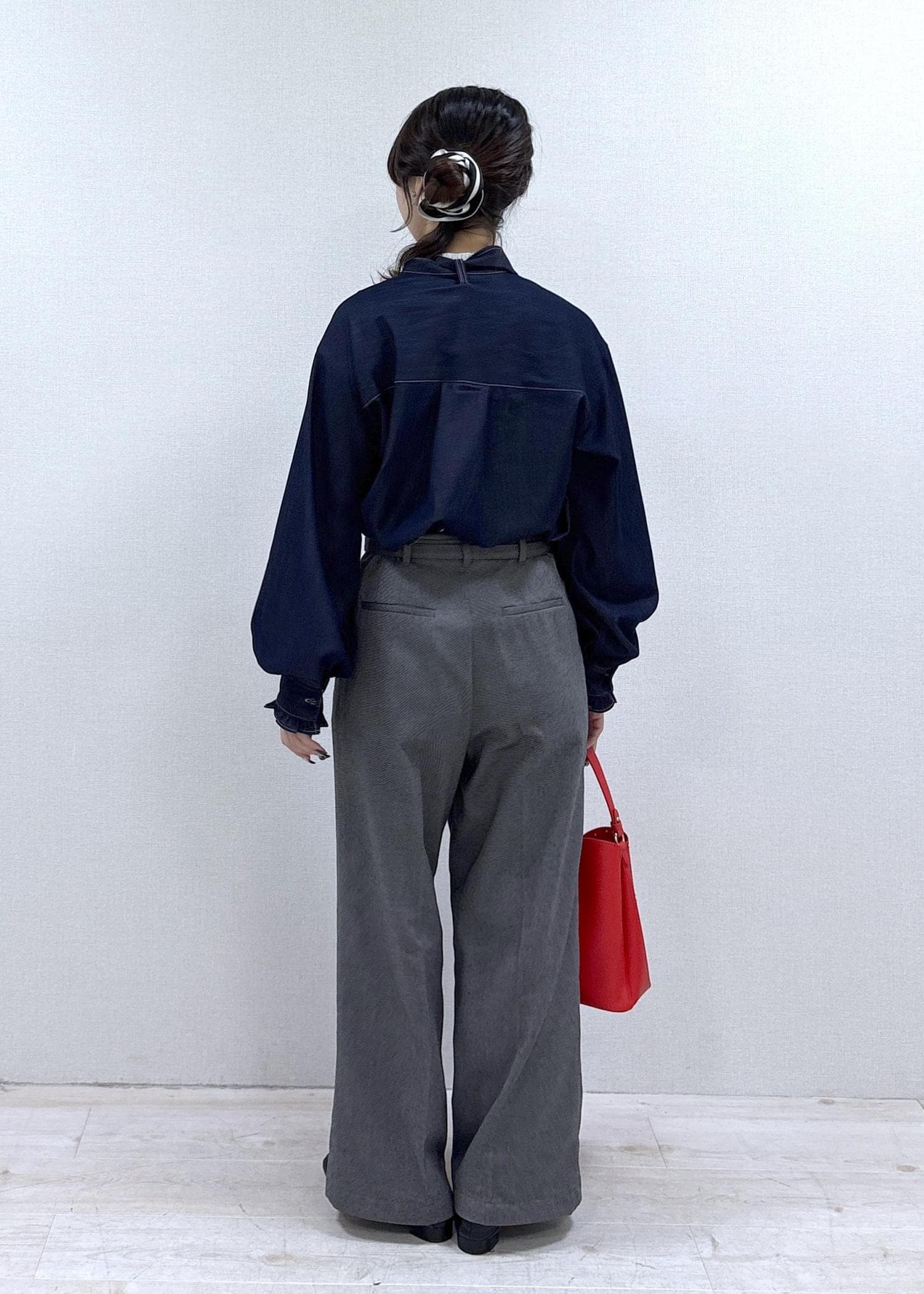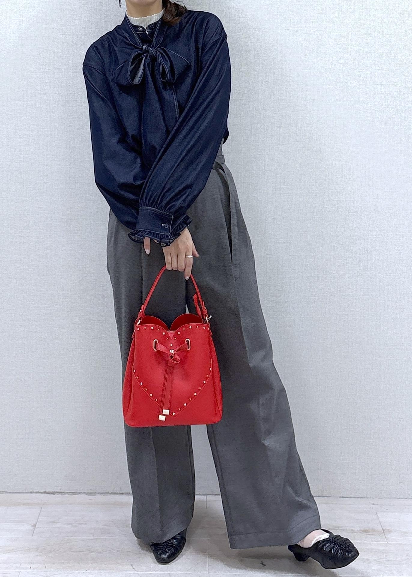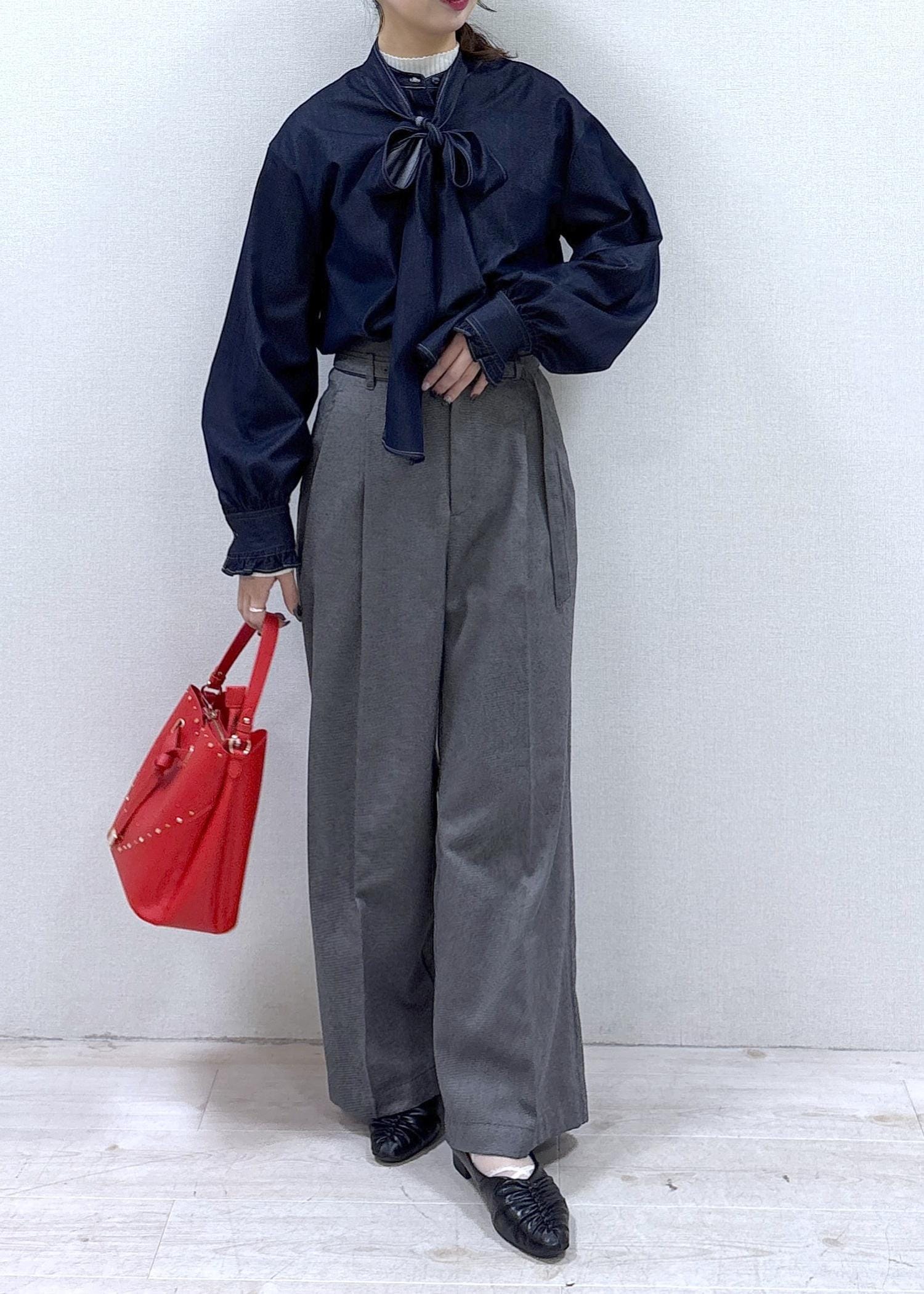 VISチェック&デニムアソートボウタイリボン付きスタンドカラーシャツネイビー系 / F¥6,589レビューボリュームスリーブが華やかで可愛いので、一枚で着映えします!上にセーターやビスチェなどを重ねても可愛いです!私は袖のデザインを見せたいので中にハイネックのニットを重ねたレイヤードスタイルが推しです!