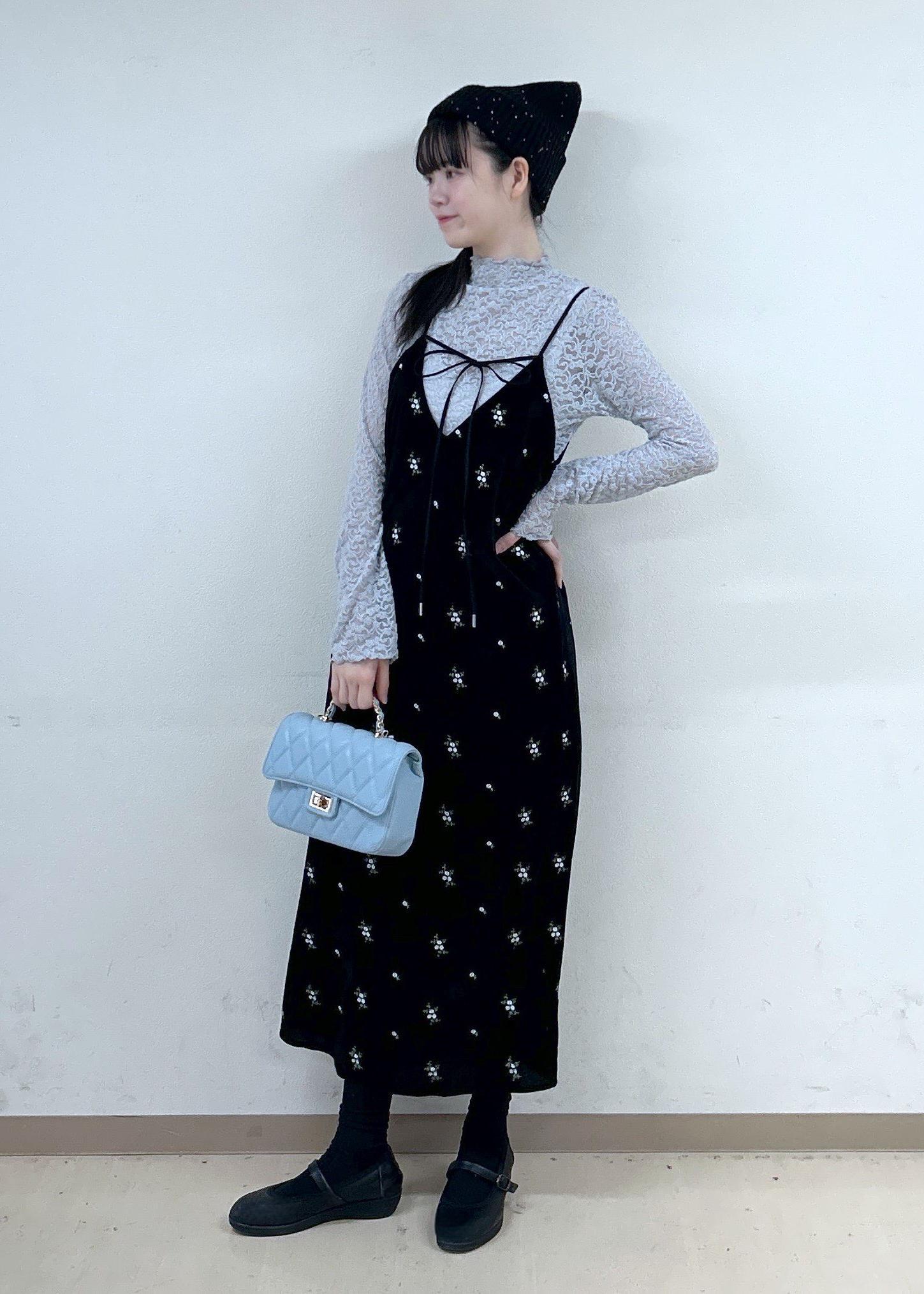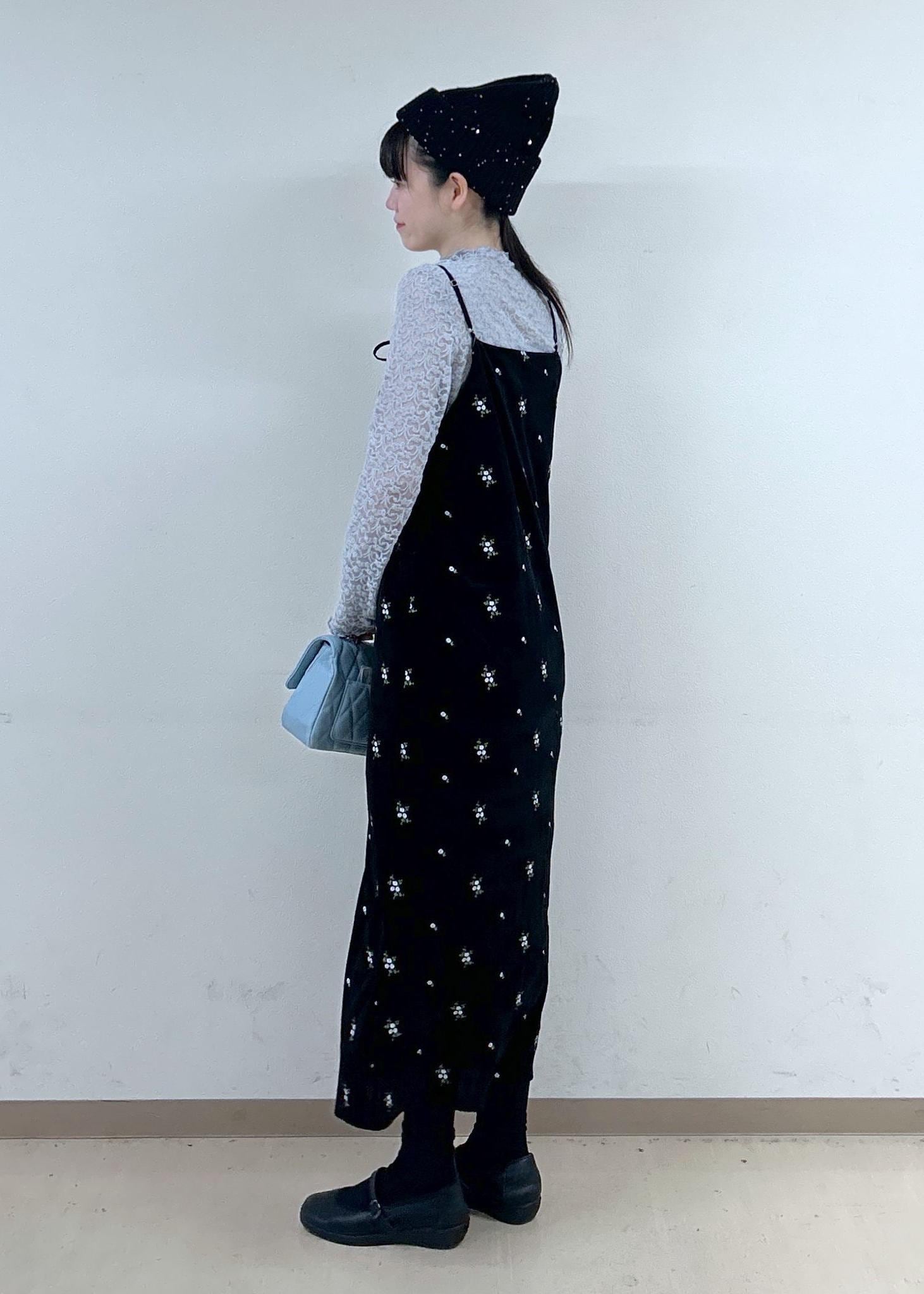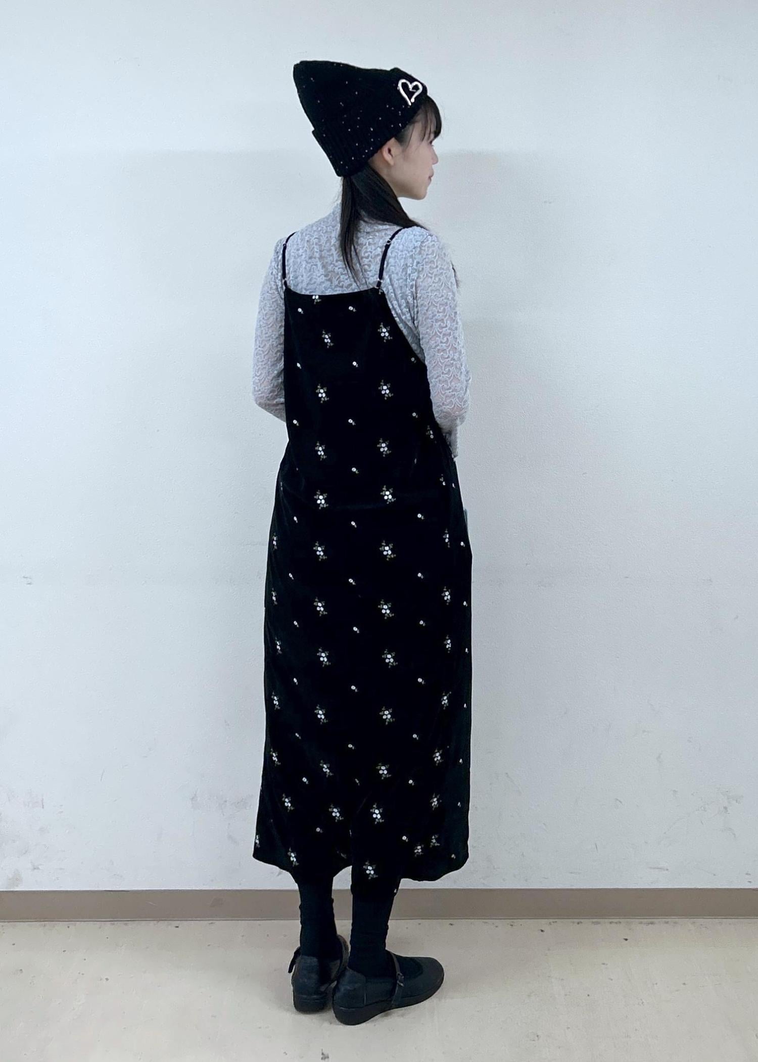 VIS刺繍アソートベロアキャミワンピース/2WAYブラック系 / F¥8,899レビューストンとしたシルエットで細見えが叶います!