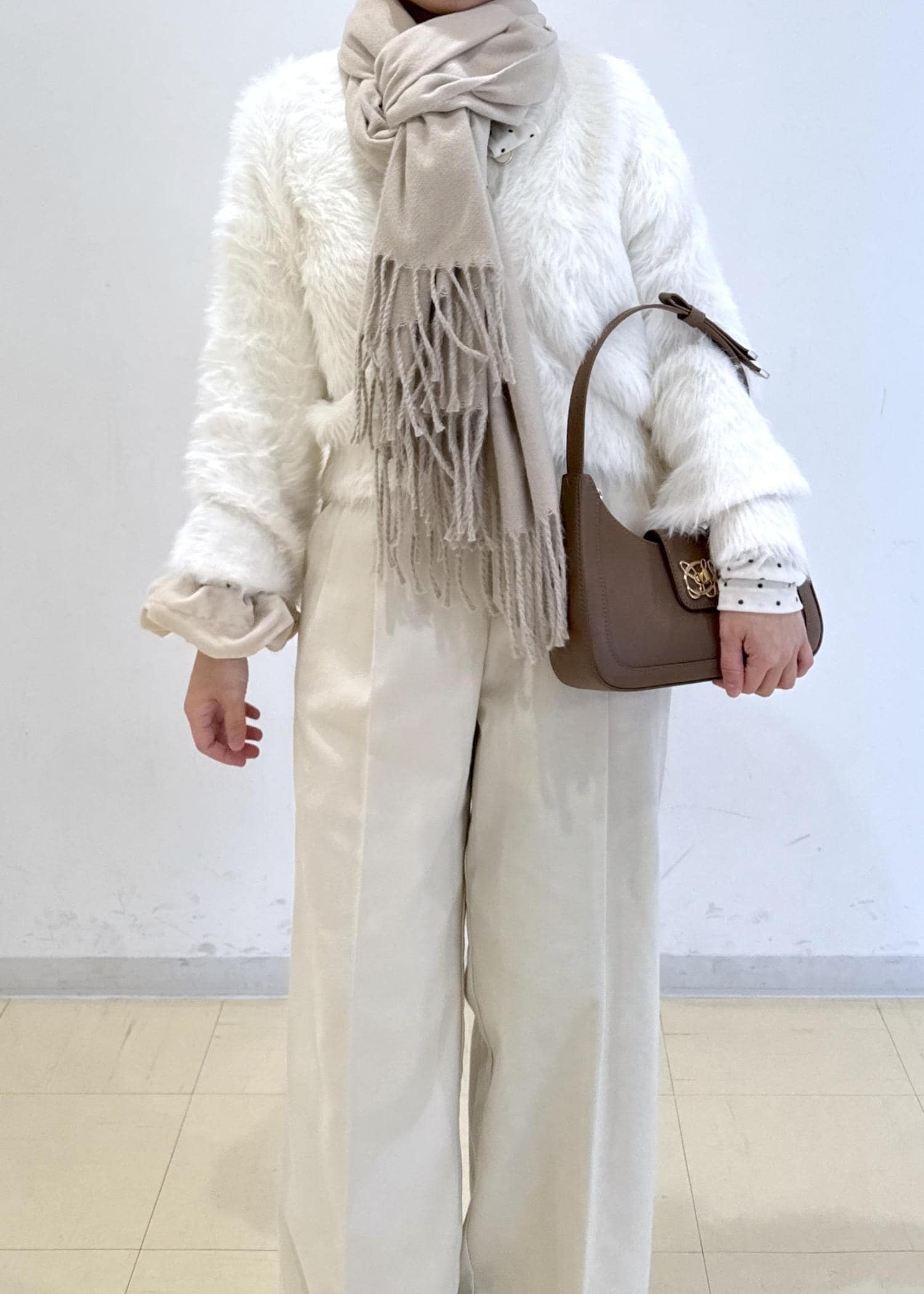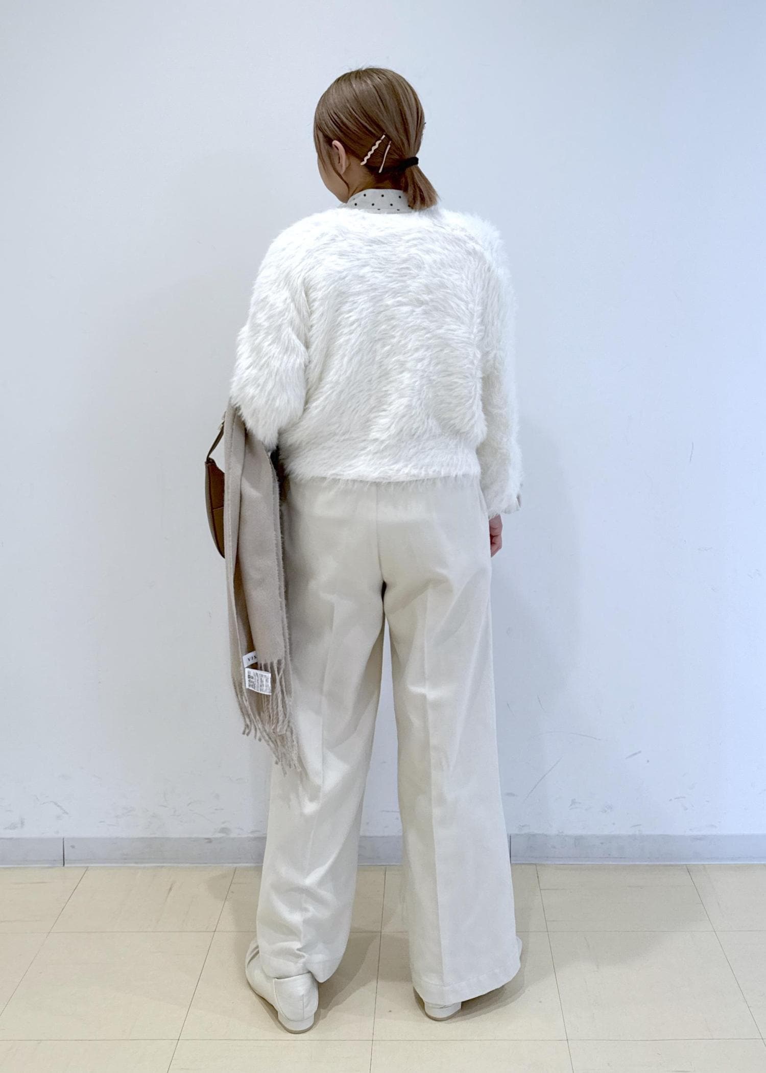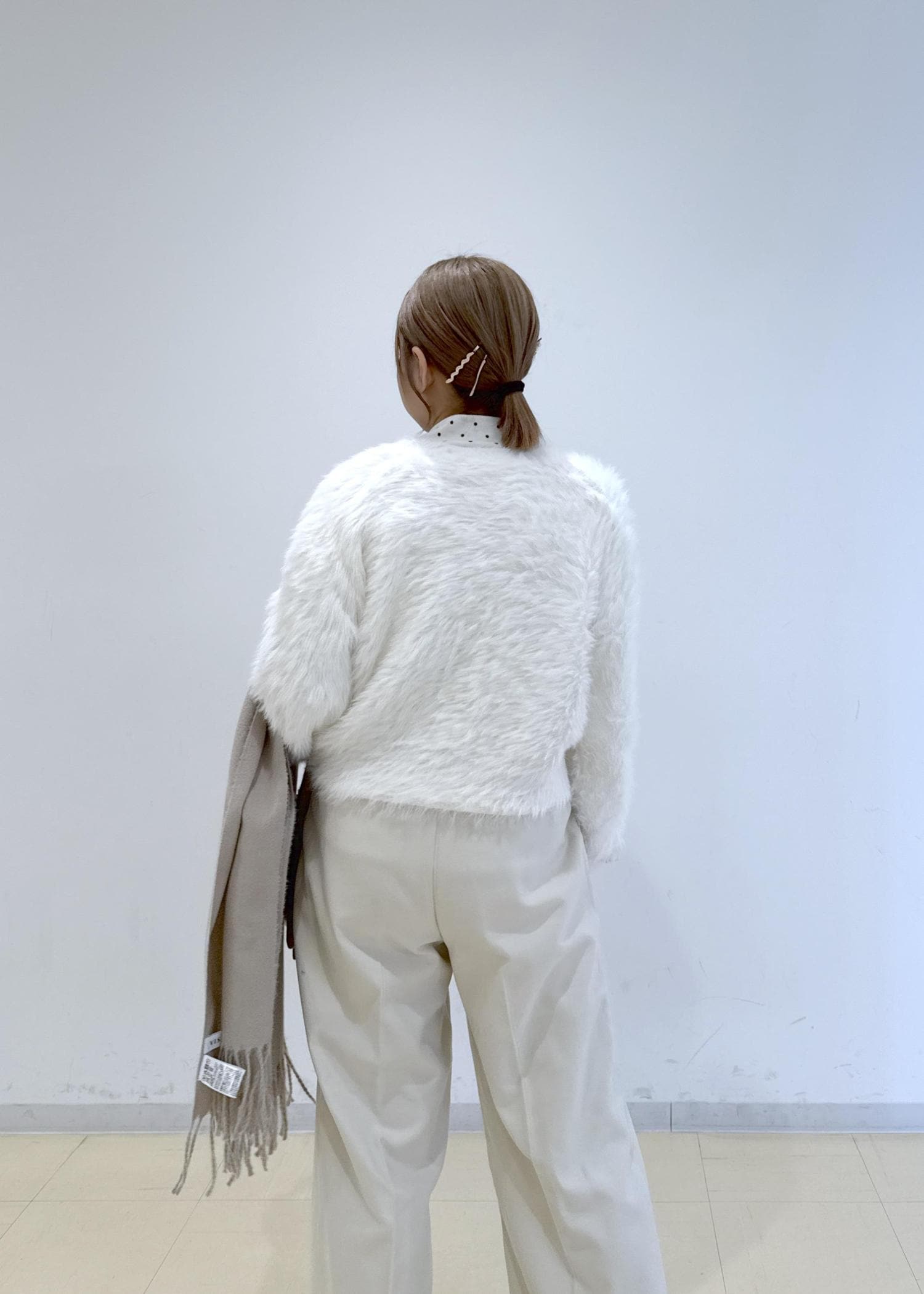 毛足が長いカーディガンは着膨れしがちですが、ショート丈でVネックになっているので骨格ストレートのわたしでも横からのボリューム感気にせずレイヤードできました◎ -