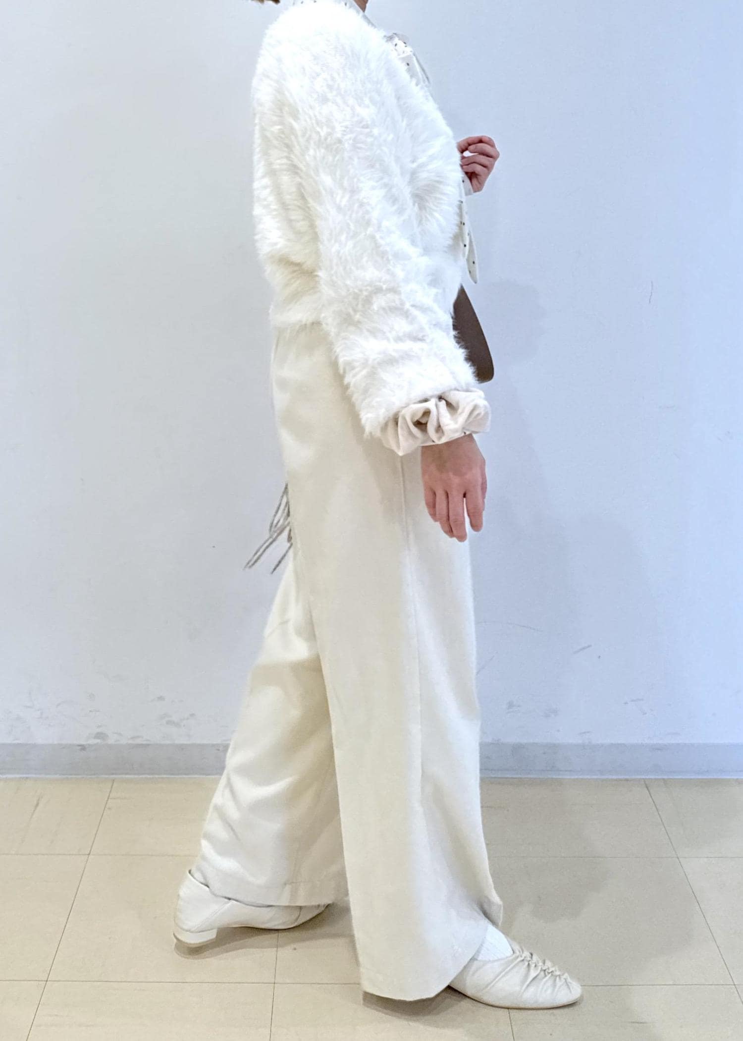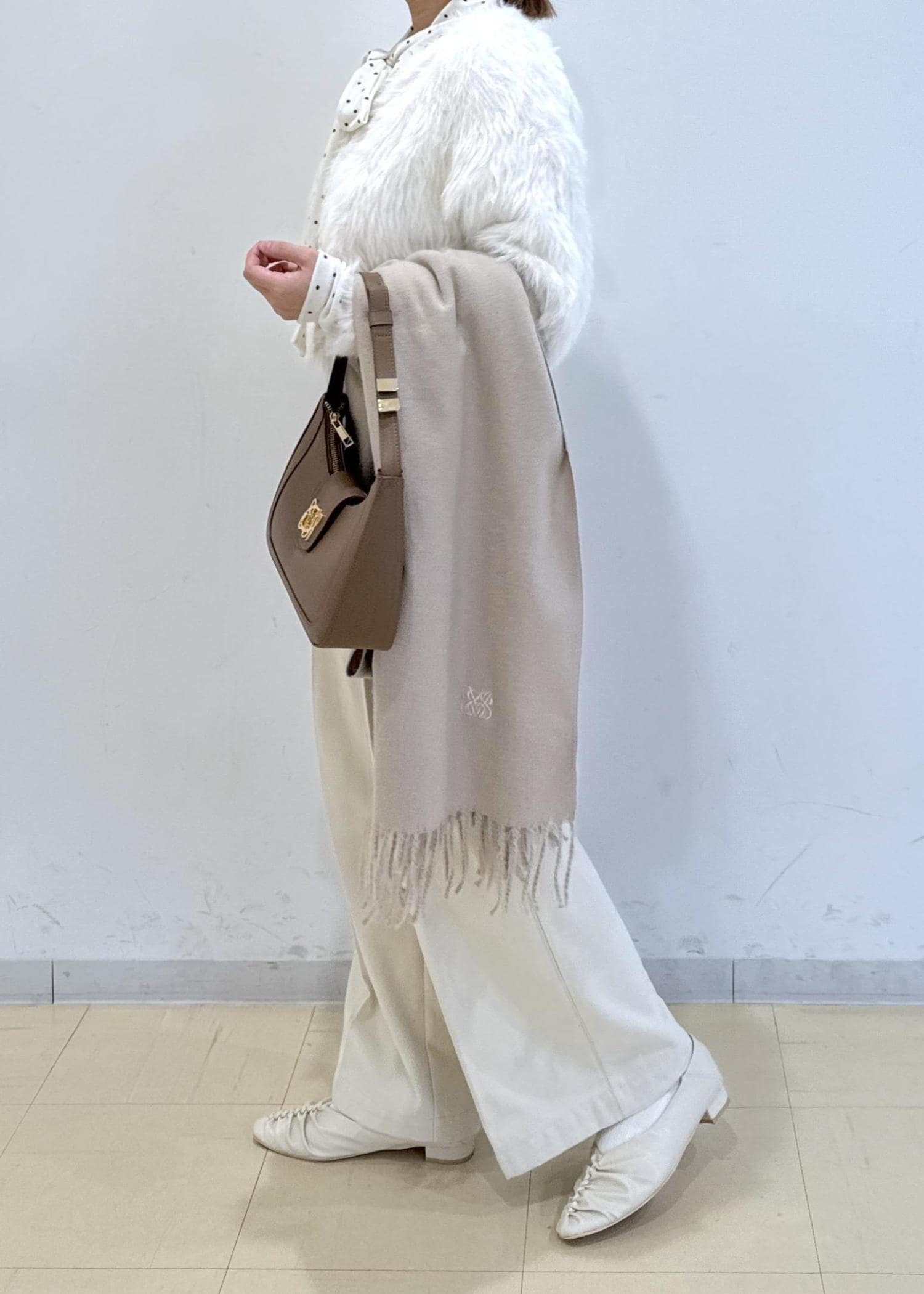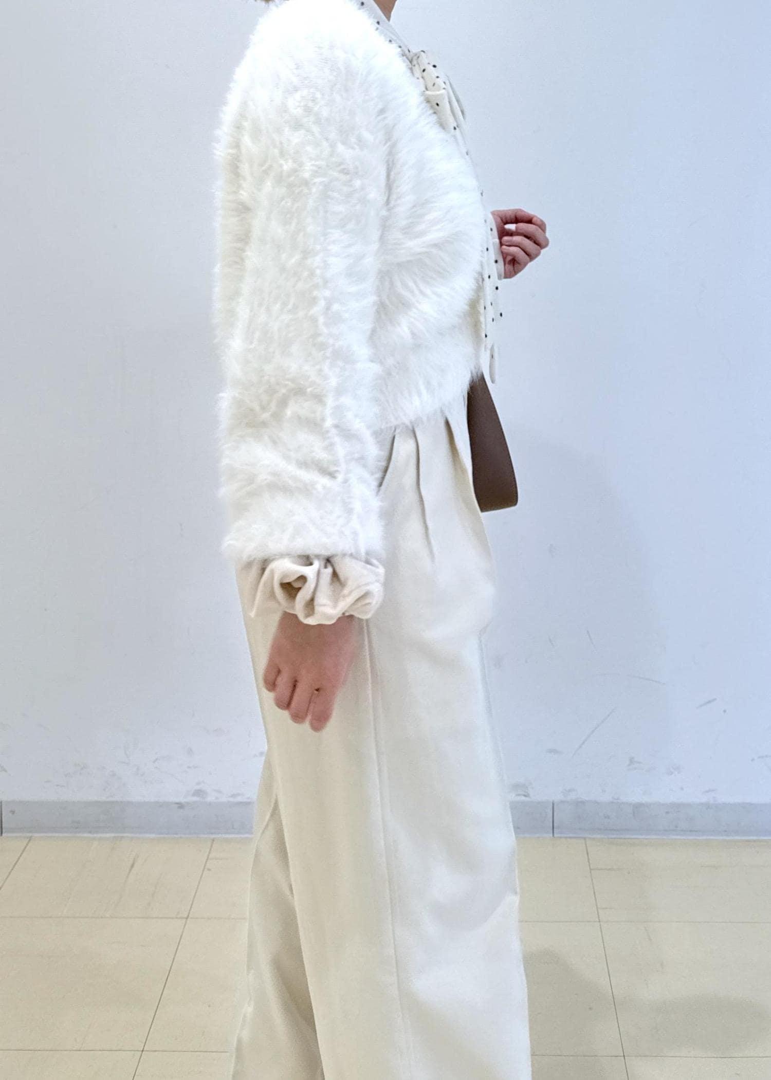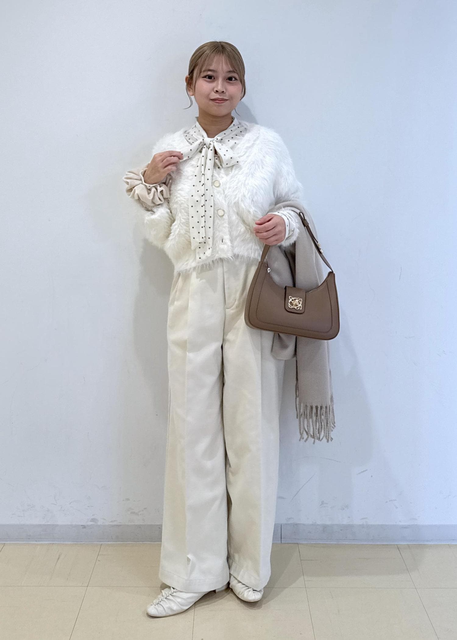 毛足が長いカーディガンは着膨れしがちですが、ショート丈でVネックになっているので骨格ストレートのわたしでも横からのボリューム感気にせずレイヤードできました◎ -